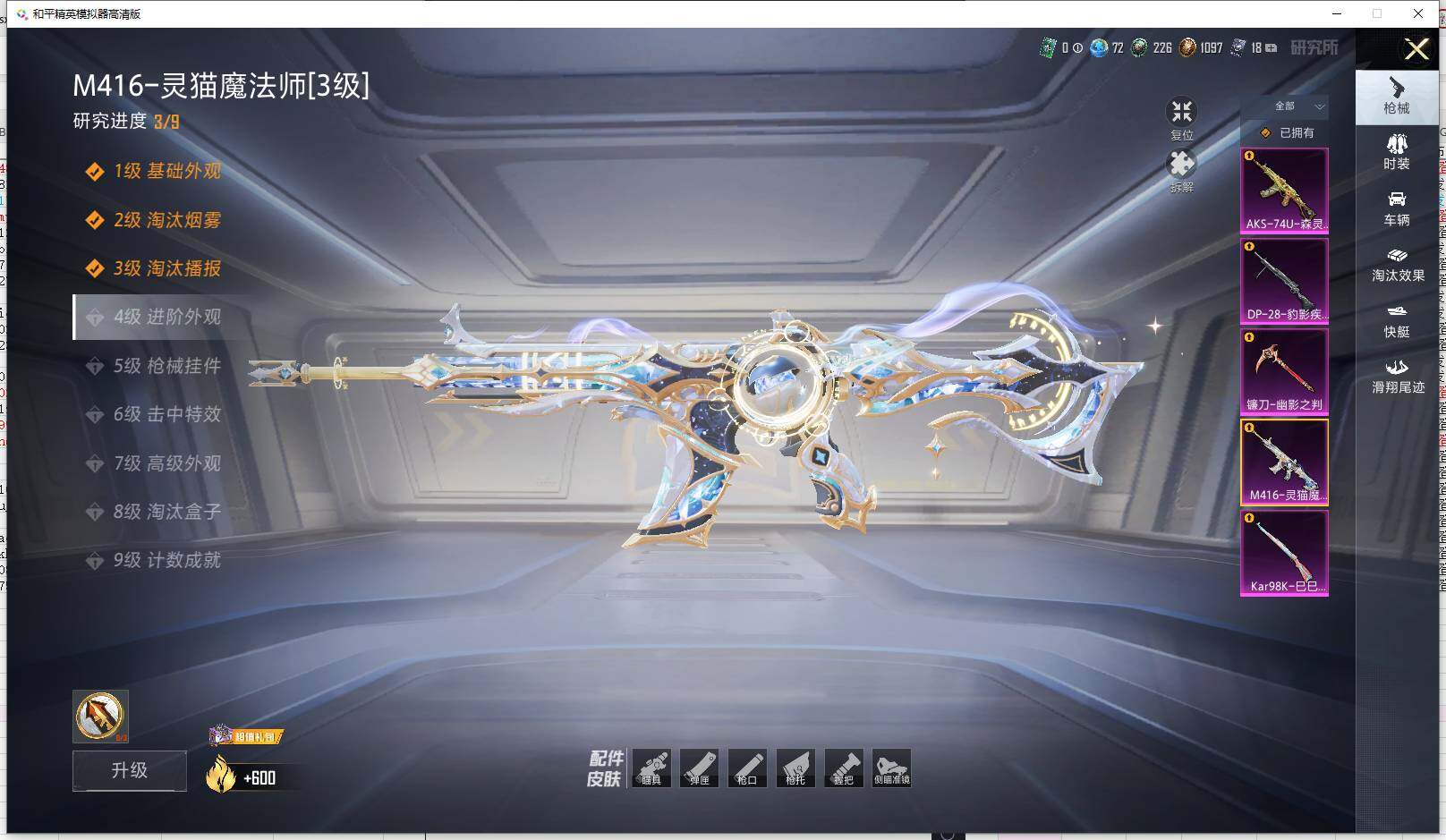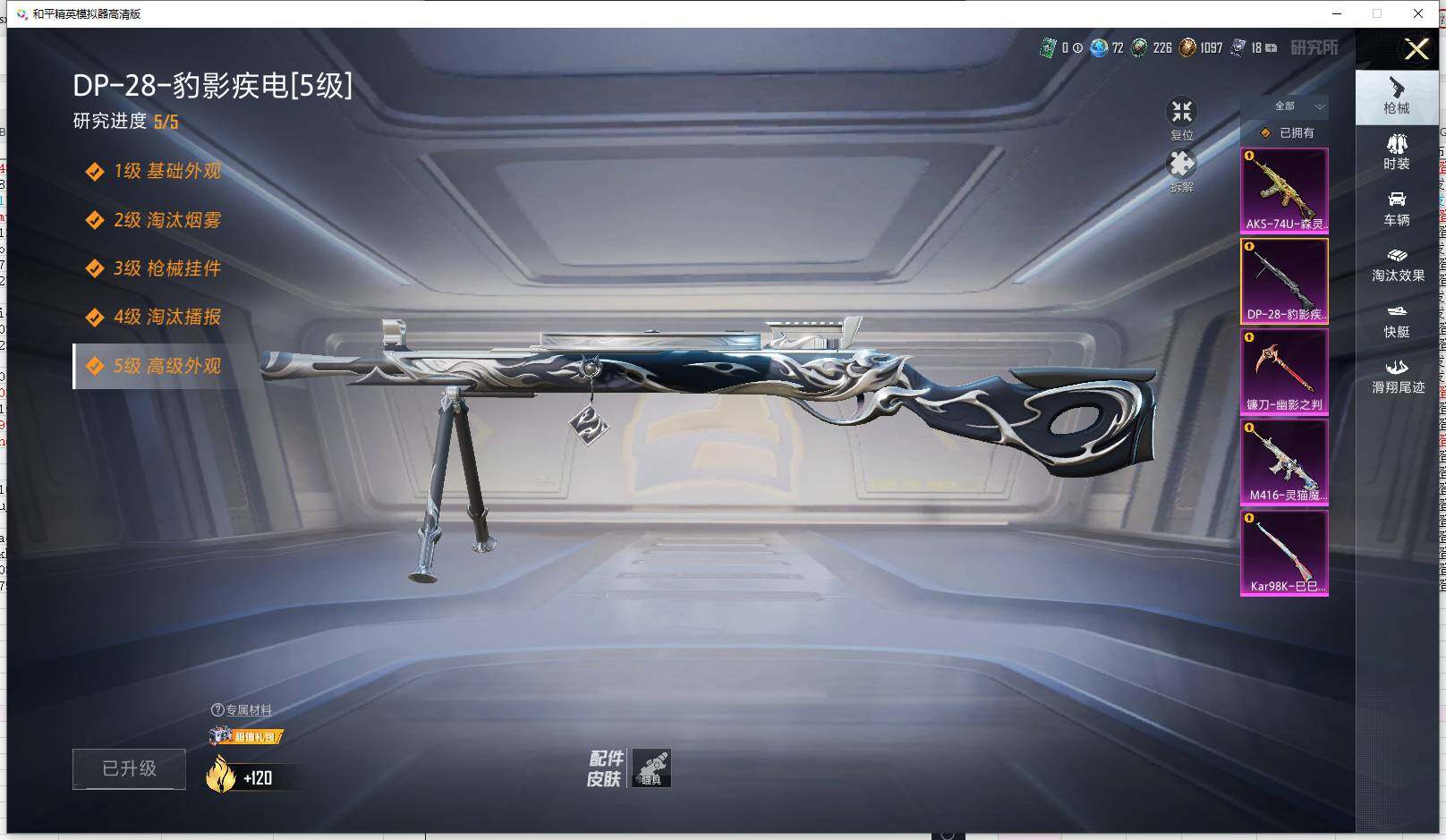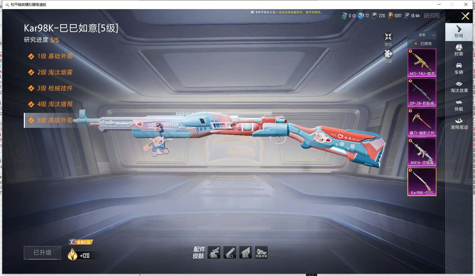 【粉色枪皮等级】:M416-灵猫魔法师(三级),AKS-74U-森灵之息(五级),Kar98K-巳巳如意(五级),DP-28-豹影疾电(五级),镰刀-幽影之判(六级)