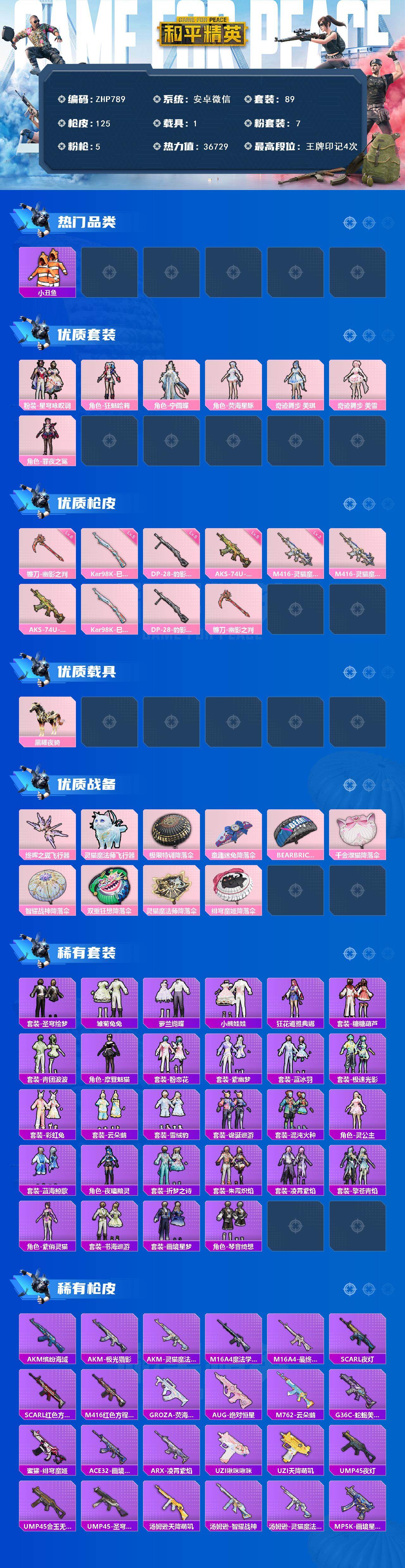 [16287117]安卓 微信-7粉装-5特效枪-1载具-2粉色飞行器-36729热力值-4王牌印记-89套装-125枪皮 【热门品类】:套装-小丑鱼 【粉色套装】:粉装-星穹咏叹调,角色-狂魅哈莉,角色-宁雨蝶,角色-荧海星豚,角色-奇迹舞步 美琪,角色-奇迹舞步 美雪,角色-罪夜之冕 【粉色枪皮等级】:M416-灵猫魔法师(三级),AKS-74U-森灵之息(五级),Kar98K-巳巳如意(五级),DP-28-豹影疾电(五级),镰刀-幽影之判(六级) 【粉色载具】:黑曜夜骑 【粉色枪皮】:M416-灵猫魔法师,AKS-74U-森灵之息,Kar98K-巳巳如意,DP-28-豹影疾电,镰刀-幽影之判 【粉色飞行器】:终晖之翼飞行器,灵猫魔法师飞行器 【粉色降落伞】:极限特训降落伞,童趣迷兔降落伞,BEARBRICK降落伞,千金淑猫降落伞,智耀战神降落伞,双重狂想降落伞,灵猫魔法师降落伞,绯穹魔姬降落伞 【稀有套装】:套装-圣穹绘梦,套装-雪国风尚,套装-雏菊兔兔,套装-萝兰蝴蝶,套装-小熊娃娃,角色-狂花道·雅典娜,套装-糖糖葫芦,套装-青团波波,角色-摩登魅猫,套装-粉恋花,套装-紫幽梦,套装-蓝冰羽,套装-极速光影,套装-彩虹兔,套装-云朵鹅,套装-雪绒豹,套装-诡诞巡游,套装-混沌火种,角色-灵公主,套装-蓝海鲸歌,角色-夜瞳黯灵,套装-折梦之诗,套装-朱霞炽焰,套装-凌霄紫焰,套装-擎苍青焰,角色-紫俏灵猫,套装-书海巡游,套装-画境星梦,套装-琴音绮想 【稀有枪皮】:AKM-缤纷海域,AKM-灵猫魔法师,AKM-极光猎影,M16A4-魔法学院,M16A4-最终圣卫者,SCAR-L-夜灯,SCAR-L-红色方程式,M416-红色方程式,GROZA-荧海星豚,AUG-绝对恒星,M762-云朵鹅,G36C-蛇蝎美人,蜜獾-绯穹魔姬,ACE32-画境星梦,ARX-凌霄紫焰,UZI-啾咪啾咪,UZI-天降萌叽,UMP45-夜灯,UMP45-金玉无双,UMP45-圣穹绘梦,汤姆逊-天降萌叽,汤姆逊-灵猫魔法师,汤姆逊-智耀战神,MP5K-画境星梦,JS9-凌霄紫焰,P90-巳巳如意,Kar98k-最终圣卫者,M24-幻彩电音,SKS-炫彩节奏,SKS-迅猛狂鲨,Mini14-绯穹魔姬,SLR-圣穹绘梦,M200-爆裂游戏,SVD-云朵鹅,SVD-冷漠罗丽,M1加兰德-画境星梦,S12K-