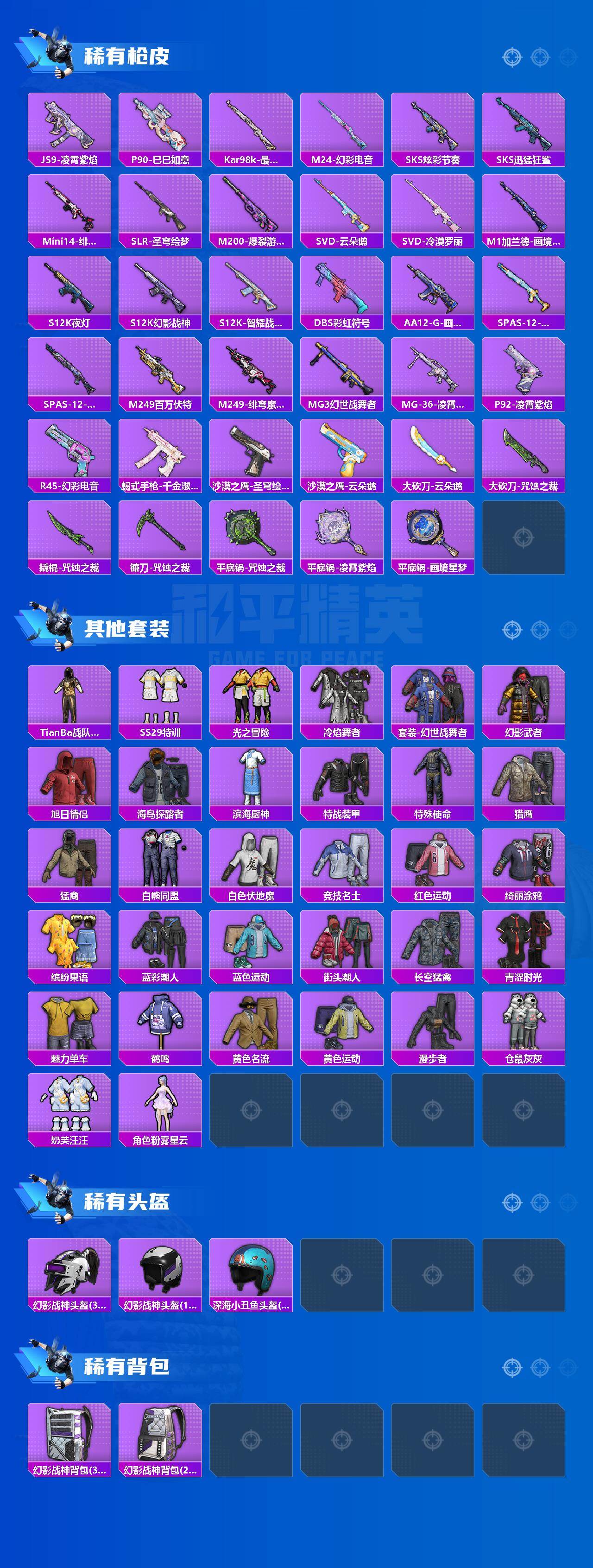【稀有枪皮】:AKM-缤纷海域,AKM-灵猫魔法师,AKM-极光猎影,M16A4-魔法学院,M16A4-最终圣卫者,SCAR-L-夜灯,SCAR-L-红色方程式,M416-红色方程式,GROZA-荧海星豚,AUG-绝对恒星,M762-云朵鹅,G36C-蛇蝎美人,蜜獾-绯穹魔姬,ACE32-画境星梦,ARX-凌霄紫焰,UZI-啾咪啾咪,UZI-天降萌叽,UMP45-夜灯,UMP45-金玉无双,UMP45-圣穹绘梦,汤姆逊-天降萌叽,汤姆逊-灵猫魔法师,汤姆逊-智耀战神,MP5K-画境星梦,JS9-凌霄紫焰,P90-巳巳如意,Kar98k-最终圣卫者,M24-幻彩电音,SKS-炫彩节奏,SKS-迅猛狂鲨,Mini14-绯穹魔姬,SLR-圣穹绘梦,M200-爆裂游戏,SVD-云朵鹅,SVD-冷漠罗丽,M1加兰德-画境星梦,S12K-