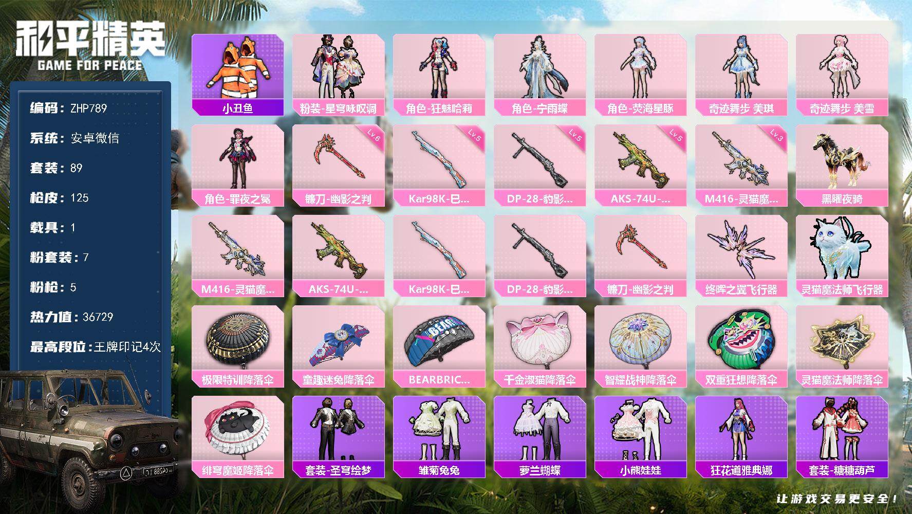 [16287117]安卓 微信-7粉装-5特效枪-1载具-2粉色飞行器-36729热力值-4王牌印记-89套装-125枪皮