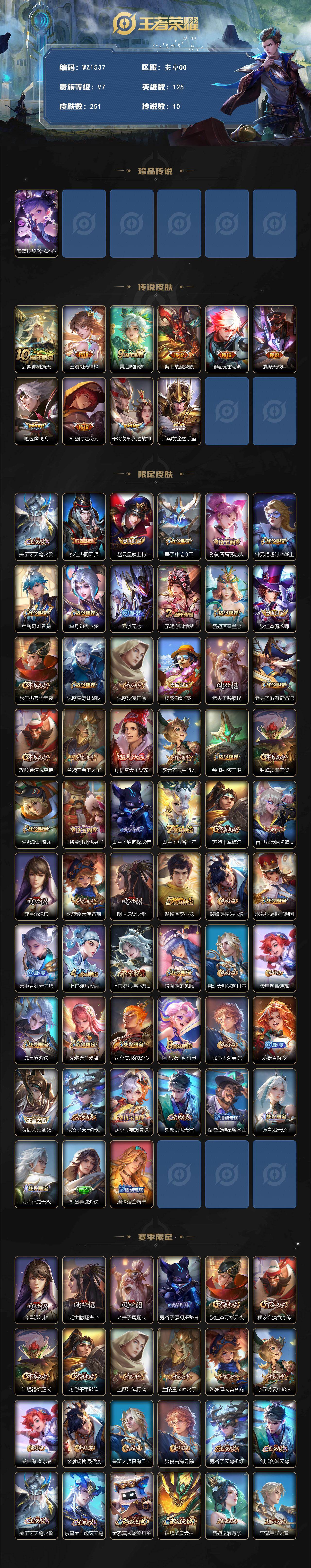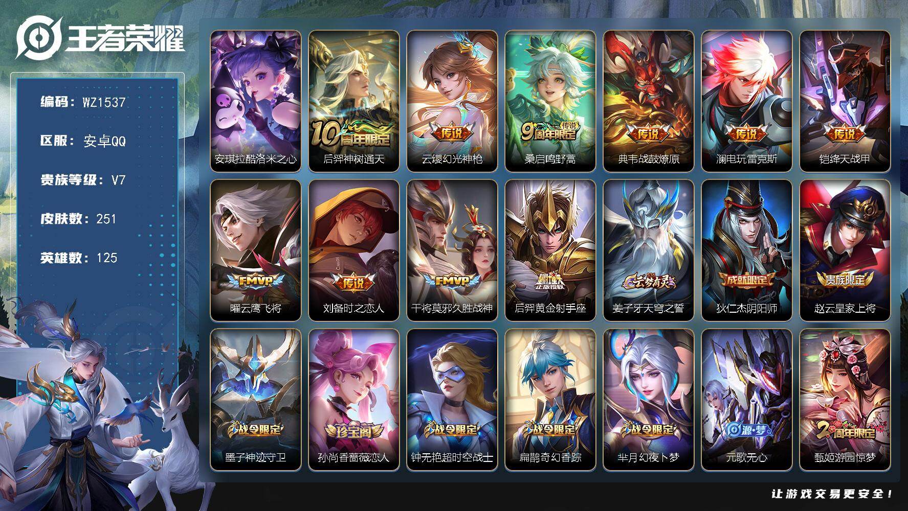 - [11884443]V7 2典藏 8传说 123英雄 206皮肤 可修改实名 优质装备:大秦宣太后,银白咏叹调(倪克斯侍卫),云鹰飞将(小将军),绛天战甲(鸡嘴战神),黄金白羊座,一念神魔,胖达荣荣,时之恋人-刘备(电焊工),涂山容容 珍宝阁皮:妄想食味 限定皮:愿照·岁时盈(虞姬年限),逐霄战戟,鸣野蒿,至尊宝,傲雪梅枪,青龙志(铠年限),游园惊梦,辉光之辰,引擎之心,冰霜恋舞曲,蜜橘之夏 史诗皮:鸭鸭历险记-刘禅,器灵·浮梦炉,化蝶舞,龙之律动,茶境仙,百相守梦-百里守约,百相守梦-黄忠,紫霞仙子,黄金分割率,特工魅影,千年之狐,江河有灵,魅语,蒙恬荣光圣徽,冰冠公主,青蛇,电玩·爆裂旋风,暗夜猫娘,末日机甲-吕布,猫狗日记-大乔,时之恋人-孙尚香,乱世虎臣,节奏热浪,女仆咖啡,水果甜心,绅士熊喵,天才门将,星夜王子,心灵骇客,德古拉伯爵,暗隐猎兽者,幽灵船长,鬼剑武藏,乐园奇幻夜,纤云弄巧,缤纷独角兽,逐浪之夏,水晶猎龙者,曙光守护者,箭羽风息,金属风暴,圣诞狂欢,圣诞恋歌,鹰眼统帅,黎明之约,未来纪元-赵云