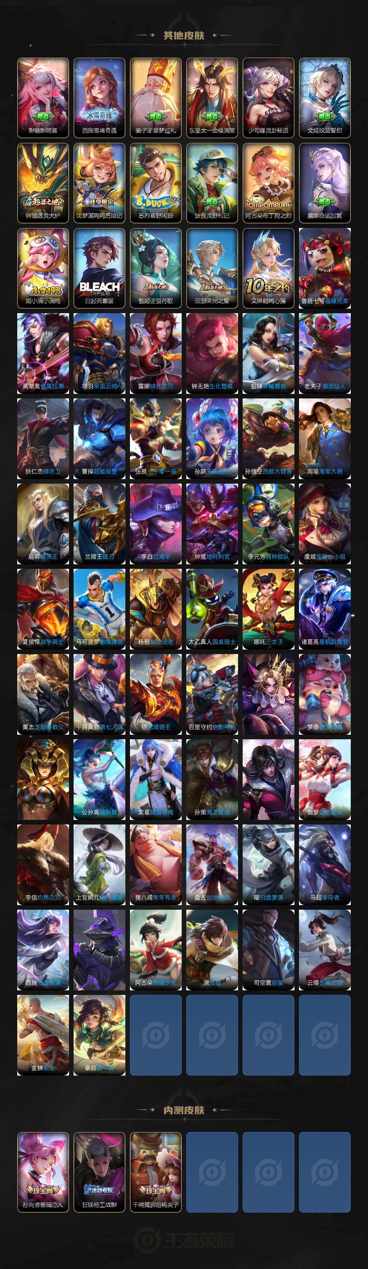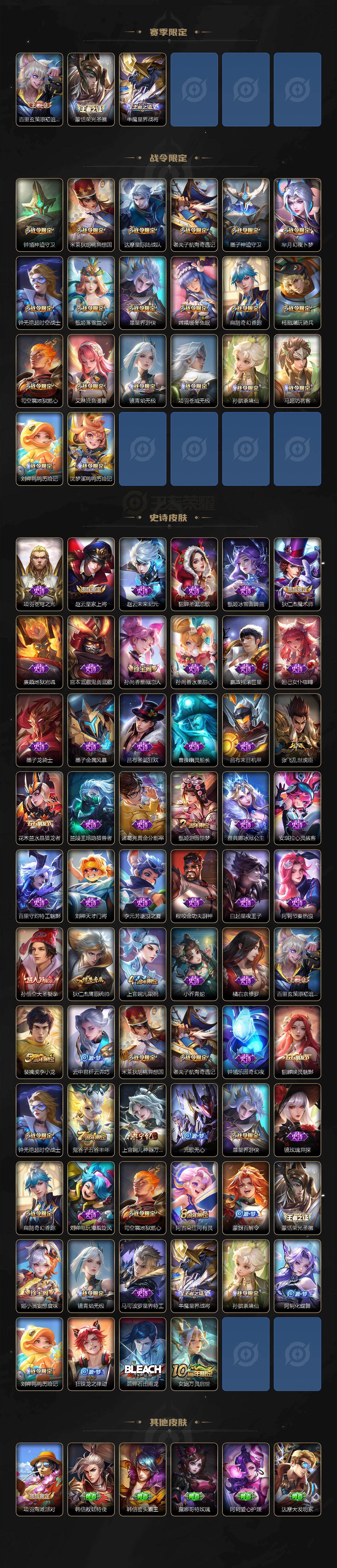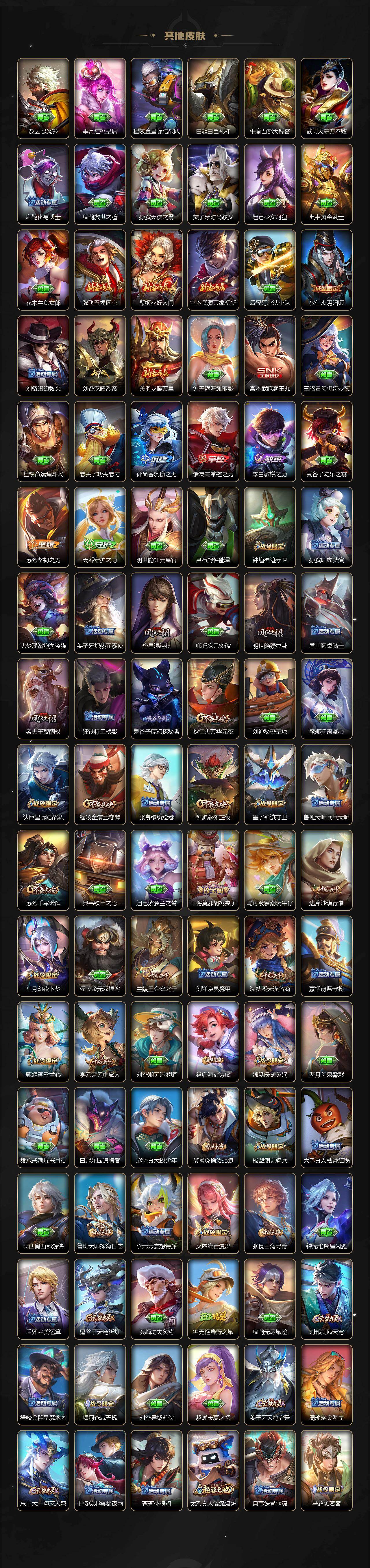【限定皮肤】:姜子牙天穹之誓,狄仁杰阴阳师,赵云皇家上将,墨子神迹守卫,孙尚香蔷薇恋人,钟无艳超时空战士,扁鹊奇幻香踪,芈月幻夜卜梦,元歌无心,甄姬游园惊梦,甄姬落雪兰心,狄仁杰魔术师,狄仁杰万华元夜,达摩星际陆战队,达摩沙漠行僧,项羽海滩派对,老夫子醍醐杖,老夫子航海奇遇记,程咬金演武夺筹,兰陵王金庭之子,孙悟空大圣娶亲,李元芳云中旅人,钟馗神迹守卫,钟馗驱傩正仪,杨戬潮玩骑兵,干将莫邪胡桃夹子,鬼谷子原初探秘者,鬼谷子五谷丰年,苏烈千军破阵,百里玄策原初追逐者,弈星混沌棋,沈梦溪大漠名商,明世隐疑决卦,裴擒虎李小龙,裴擒虎擒涛扼浪,米莱狄胡桃异想国,云中君纤云弄巧,上官婉儿梁祝,上官婉儿神器万象笔,嫦娥暖冬兔眠,鲁班大师探海日志,桑启海盐诗旅,暃星界游侠,艾琳流音漫舞,司空震地狱燃心,阿古朵江河有灵,张良古海寻踪,蒙犽百解令,蒙恬荣光圣徽,鬼谷子天穹祈灯,姬小满妄想食味,刘邦剑破天穹,程咬金群星魔术团,镜青焰无极,项羽苍威无极,刘备异域游侠,周瑜熔金海岸