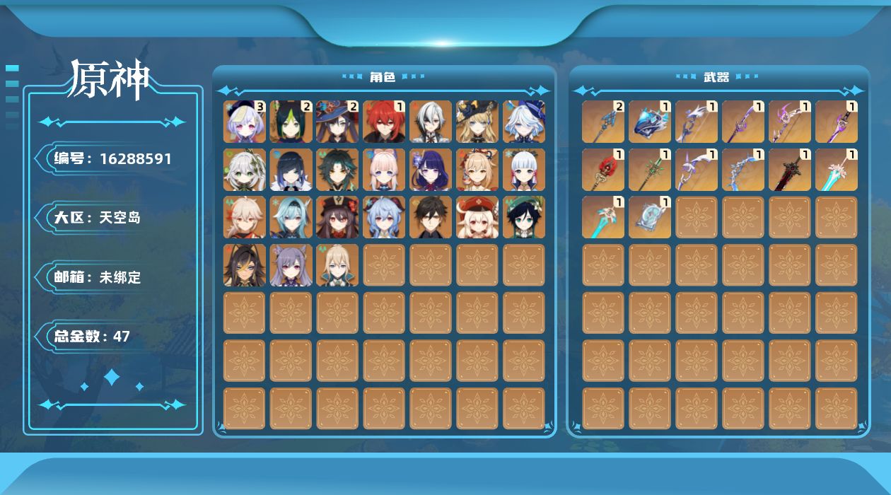 0命阿蕾奇诺,0命娜维娅,0命芙宁娜,0命迪希雅,0命纳西妲,2命提纳里,0命夜兰,0命优菈,0命雷电将军,0命枫原万叶,0命神里绫华,0命钟离,0命胡桃,0命甘雨,0命魈,0命宵宫,0命温迪,0命可莉,0命珊瑚宫心海,0命刻晴,3命七七,0命琴,2命莫娜,1命迪卢克,精1万世流涌大典,精1若水,精2息灾,精1冬极白星,精1薙草之稻光,精1飞雷之弦振,精1雾切之回光,精1护摩之杖,精1四风原典,精1和璞鸢,精1阿莫斯之弓,精1天空之刃,精1狼的末路,精1天空之傲