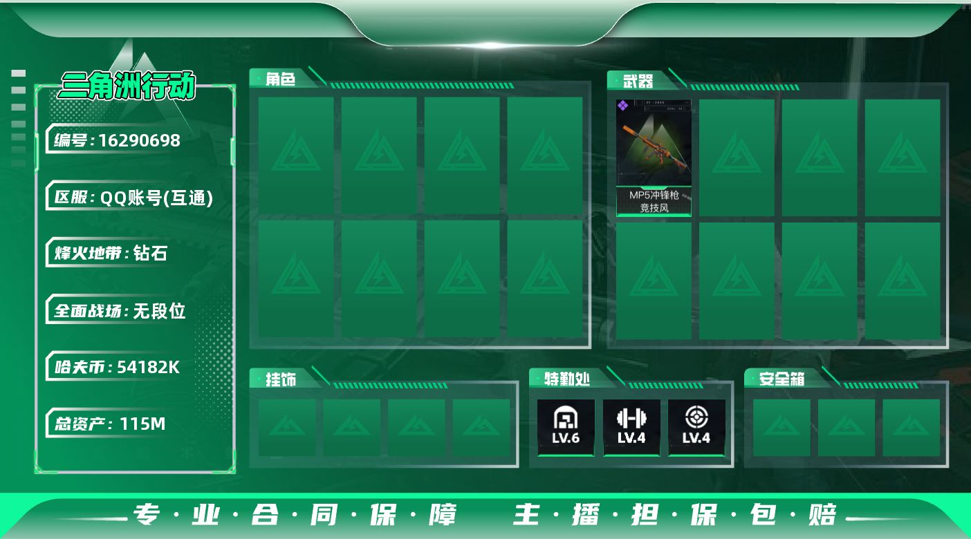 [16290698]【店主推荐捡漏号!可直接换绑】115m总资产-54182k哈伏币-50烽火等级-钻石-1战场等级-无军衔 【近战皮肤】:近战-黑鹰 【史诗外观】:MP5冲锋枪-竞技风 【稀有外观】:AKM突击步枪-肃杀,腾龙突击步枪-冰天雪地,UZI冲锋枪-亚特兰蒂斯,SMG-45-行动开启 【普通外观】:M4A1突击步枪-高雅黑,M4A1突击步枪-海色,QBZ95-1突击步枪-高雅黑,K416突击步枪-几何迷彩,M16A4突击步枪-高雅黑,SCAR-H战斗步枪-红色涂装,G3战斗步枪-高雅黑,M1014霰弹枪-海浪,SVD狙击步枪-高雅黑,沙漠之鹰-高雅黑 【军牌】:军牌-修整,军牌-信誉优秀 【挂饰】:挂饰-暗行哨兵