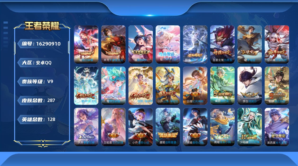 [16290910]【特价出售/店主推荐】安卓Q-V9-永恒钻石II段位-128英雄-287皮肤-2典藏皮肤-1无双-2珍品传说-17传说-77史诗