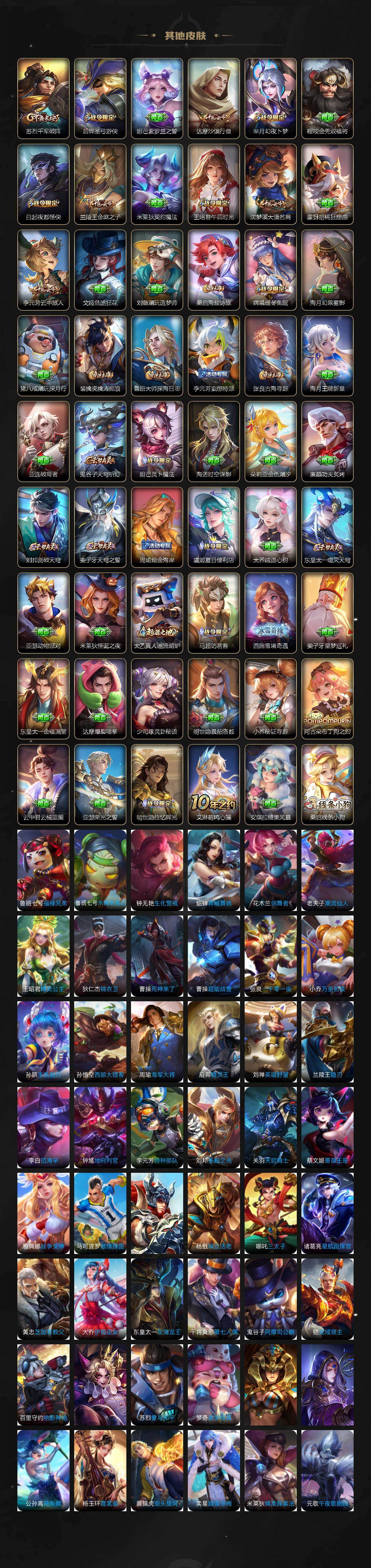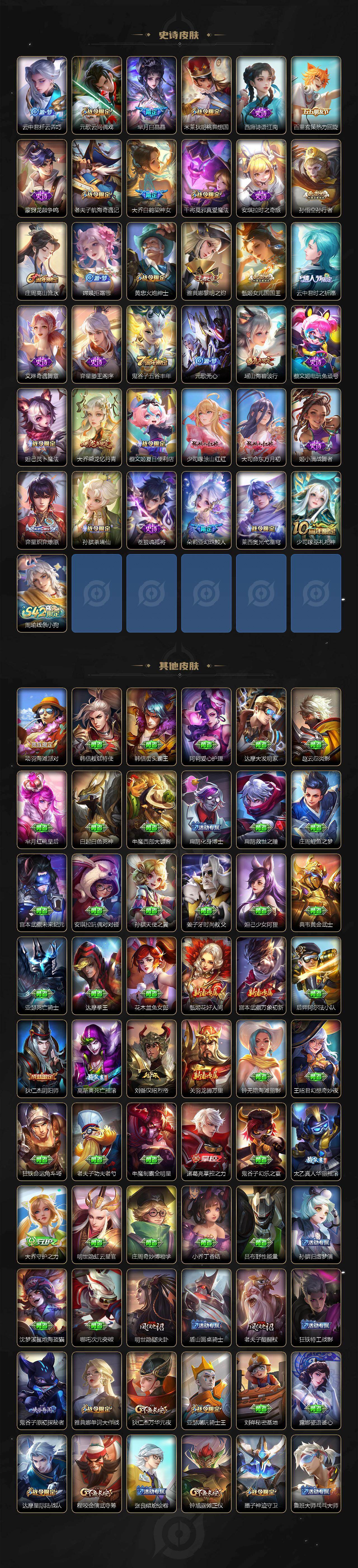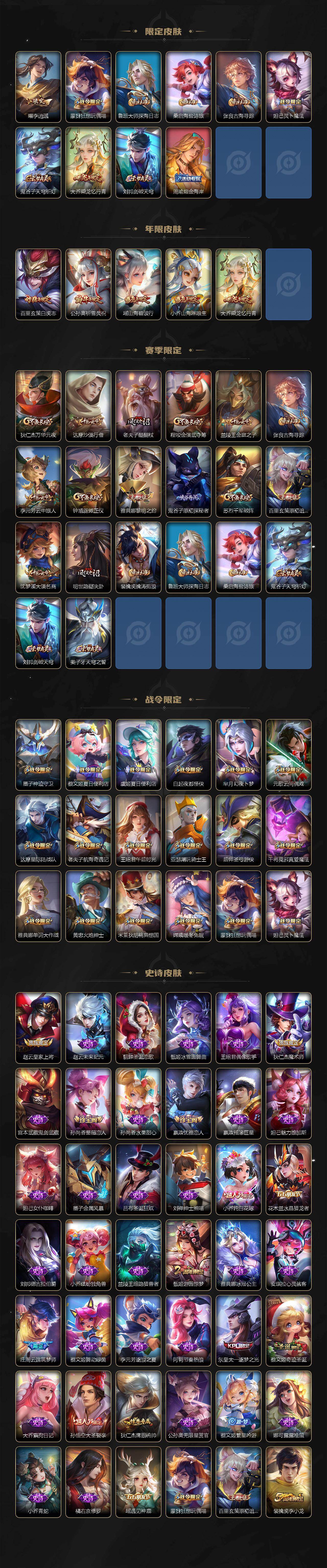 【限定皮肤】:蔡文姬夏日便利店,大乔绒语心约,虞姬夏日便利店,姜子牙天穹之誓,狄仁杰阴阳师,小乔纯白花嫁,小乔山海琳琅生,赵云皇家上将,墨子神迹守卫,嬴政优雅恋人,孙尚香蔷薇恋人,庄周云端筑梦师,庄周高山流水,高渐离死亡摇滚,白起夜都怪侠,芈月白晶晶,芈月幻夜卜梦,元歌云间偶戏,元歌无心,甄姬女儿国国王,甄姬游园惊梦,狄仁杰魔术师,狄仁杰万华元夜,达摩星际陆战队,达摩沙漠行僧,项羽海滩派对,老夫子醍醐杖,老夫子航海奇遇记,貂蝉遇见胡旋,程咬金演武夺筹,王昭君午后时光,兰陵王金庭之子,亚瑟潮玩骑士王,孙悟空大圣娶亲,孙悟空孙行者,后羿圣弓游侠,李元芳云中旅人,虞姬启明星使,钟馗驱傩正仪,干将莫邪真爱魔法,雅典娜单词大作战,雅典娜黎明之约,蔡文姬奇迹圣诞,蔡文姬繁星吟游,太乙真人华丽摇滚,东皇太一逐梦之光,鬼谷子原初探秘者,鬼谷子五谷丰年,大乔白鹤梁神女,大乔挚爱花嫁,黄忠火炮绅士,苏烈千军破阵,百里玄策白虎志,百里玄策原初追逐者,公孙离祈雪灵祝,沈梦溪大漠名商,明世隐疑决卦,裴擒虎李小龙,裴擒虎擒涛扼浪,米莱狄胡桃异想国,瑶时之祈愿,瑶山海碧波行,云中君纤云弄巧,云中君时之祈愿,嫦娥拒霜思,嫦娥暖冬兔眠,曜李逍遥 ,蒙犽狂想玩偶喵,鲁班大师探海日志,桑启海盐诗旅,张良古海寻踪,妲己灵卜魔法,鬼谷子天穹祈灯,大乔乘龙忆丹青,刘邦剑破天穹,周瑜熔金海岸