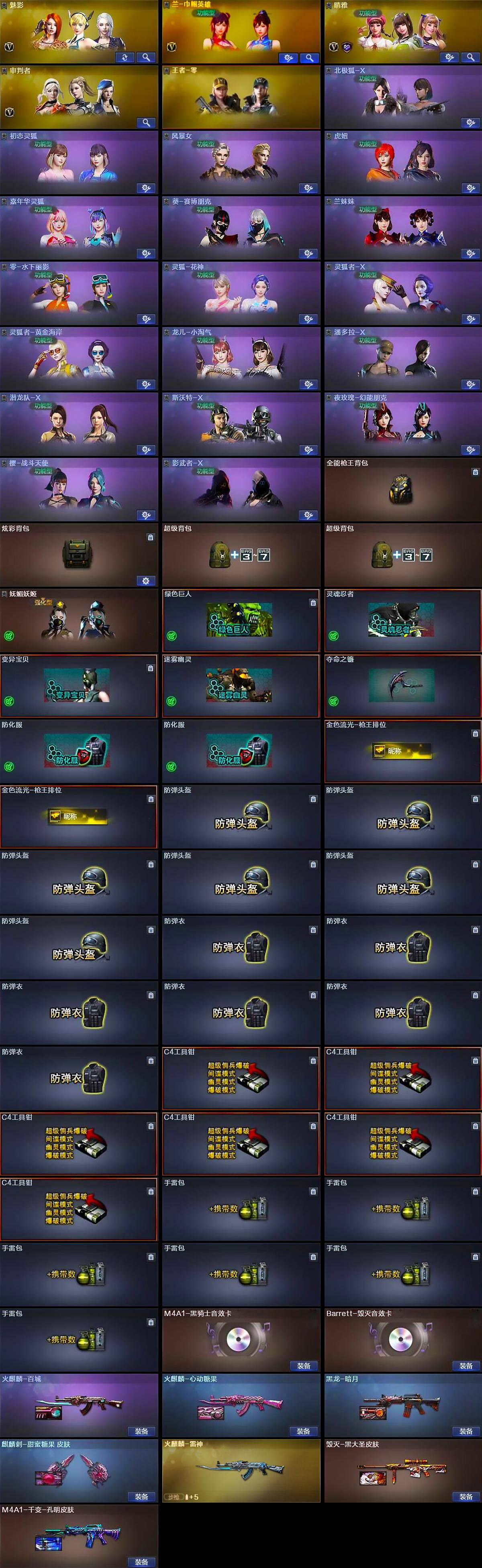 【道具】:全能枪王背包,炫彩背包,超级背包*2,妩媚妖姬,绿色巨人,灵魂忍者,变异宝贝,迷雾幽灵,夺命之镰,防化服*2,金色流光-枪王排位*2,防弹头盔*6,防弹衣*6,C4工具钳*6,手雷包*6