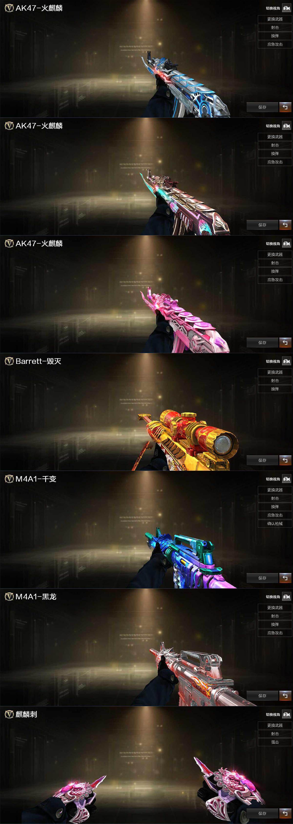 【皮肤】:火麒麟-雷神,火麒麟-百城,火麒麟-心动糖果,毁灭-黑大圣皮肤,M4A1-千变-孔明皮肤,黑龙-暗月,HK417-朱雀-掌火灵橙 皮肤,麒麟刺-甜蜜糖果 皮肤