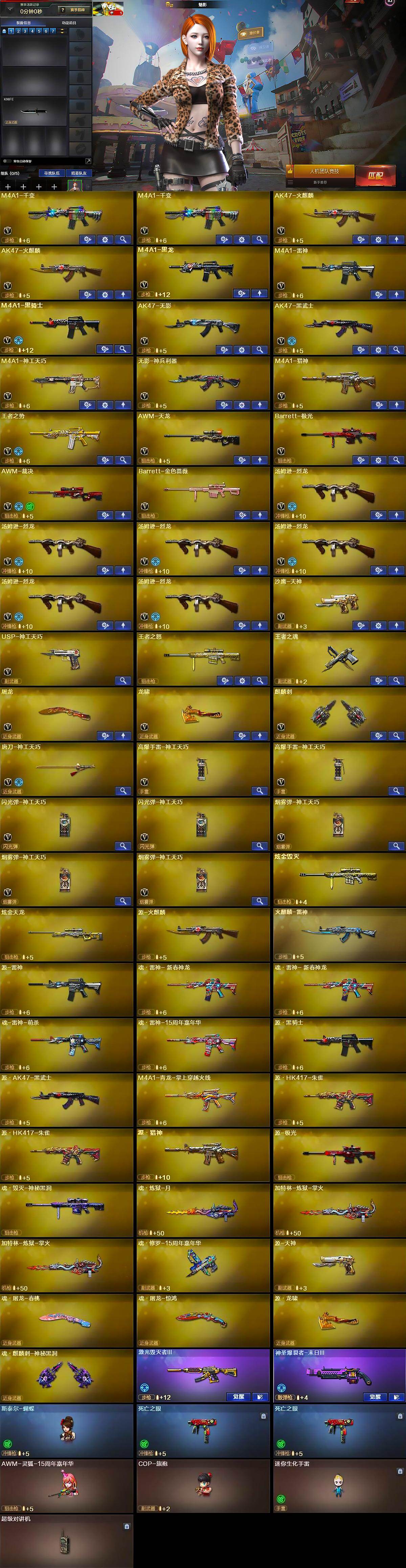 【英雄级武器】:M4A1-千变*2,AK47-火麒麟*2,M4A1-黑龙,M4A1-雷神,M4A1-黑骑士,AK47-无影,AK47-黑武士,M4A1-神工天巧,无影-神兵利器,M4A1-猎神,王者之势-觉醒版,AWM-天龙,Barrett-极光,AWM-裁决,Barrett-金色蔷薇,汤姆逊-烈龙*6,沙鹰-天神,USP-神工天巧,屠龙,龙啸,麒麟刺,唐刀-神工天巧,高爆手雷-神工天巧*2,闪光弹-神工天巧*2,烟雾弹-神工天巧*3