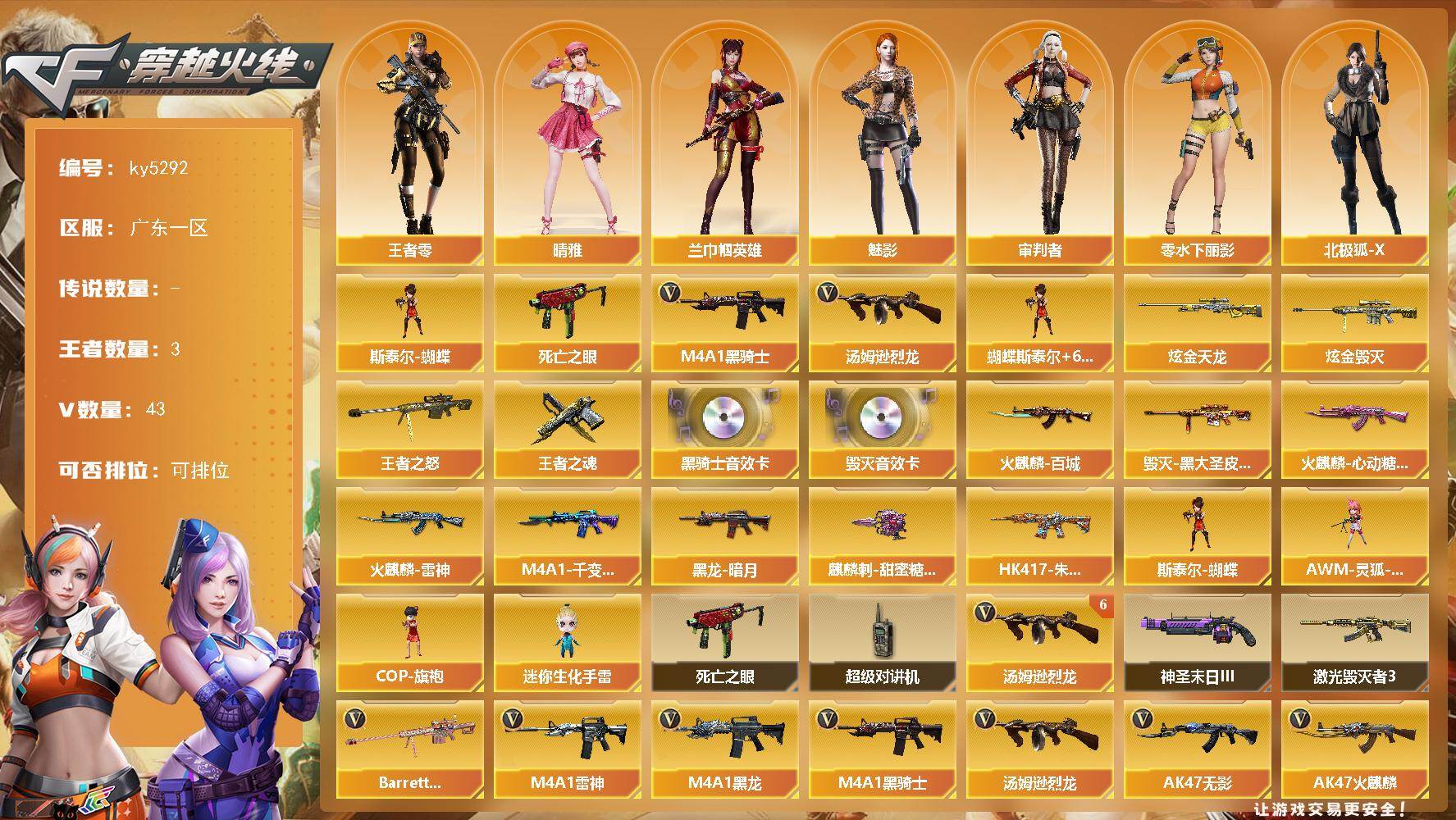 [16291355]广东一区-43V-3王者-2炫金 【热门武器】:死亡之眼*2,M4A1-黑骑士,汤姆逊-烈龙*6,斯泰尔-蝴蝶 【王者炫金武器】:王者之怒,王者之魂,炫金毁灭,炫金天龙 【音效卡】:M4A1-黑骑士音效卡,Barrett-毁灭音效卡 【皮肤】:火麒麟-雷神,火麒麟-百城,火麒麟-心动糖果,毁灭-黑大圣皮肤,M4A1-千变-孔明皮肤,黑龙-暗月,HK417-朱雀-掌火灵橙 皮肤,麒麟刺-甜蜜糖果 皮肤 【角色】:魅影,兰-巾帼英雄,晴雅,审判者,王者-零,北极狐-X,初恋灵狐,风暴女,虎妞,嘉年华灵狐,葵-赛博朋克,兰妹妹,零-水下丽影,灵狐-花神,灵狐者-X,灵狐者-黄金海岸,龙儿-小淘气,潘多拉-X,潜龙队-X,斯沃特-X,兔囡囡,夜玫瑰-幻能朋克,樱-战斗天使,影武者-X 【人偶武器】:斯泰尔-蝴蝶,AWM-灵狐-15周年嘉年华,COP-旗袍,迷你生化手雷 【暴走生化】:死亡之眼*2,超级对讲机 【挑战大师】:激光毁灭者III,神圣爆裂者-末日III 【英雄级武器】:M4A1-千变*2,AK47-火麒麟*2,M4A1-黑龙,M4A1-雷神,M4A1-黑骑士,AK47-无影,AK47-黑武士,M4A1-神工天巧,无影-神兵利器,M4A1-猎神,王者之势-觉醒版,AWM-天龙,Barrett-极光,AWM-裁决,Barrett-金色蔷薇,汤姆逊-烈龙*6,沙鹰-天神,USP-神工天巧,屠龙,龙啸,麒麟刺,唐刀-神工天巧,高爆手雷-神工天巧*2,闪光弹-神工天巧*2,烟雾弹-神工天巧*3 【道具】:全能枪王背包,炫彩背包,超级背包*2,妩媚妖姬,绿色巨人,灵魂忍者,变异宝贝,迷雾幽灵,夺命之镰,防化服*2,金色流光-枪王排位*2,防弹头盔*6,防弹衣*6,C4工具钳*6,手雷包*6 【特殊枪械】:蝴蝶斯泰尔+6烈龙,1黑骑士,6烈龙,1蝴蝶斯泰尔