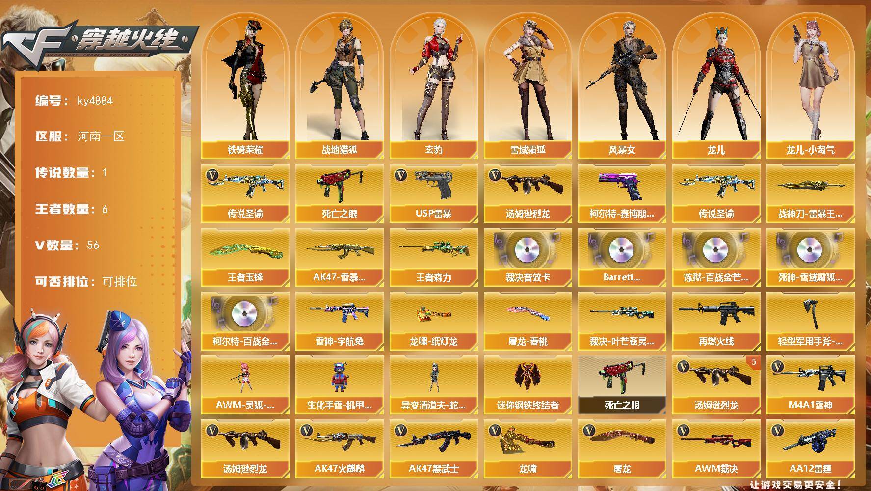 [16291339]河南一区-56V-6王者-0炫金 【传说武器】:传说圣谕 【传说角色】:传说星骇 【热门武器】:传说圣谕,死亡之眼,汤姆逊-烈龙*5,USP-雷暴,柯尔特-赛博朋克 【王者炫金武器】:AK47-雷暴王者,王者森力,王者玉锋,斩神刀-雷暴王者 【音效卡】:AWM-裁决音效卡,Barrett-碧霄极光音效卡,炼狱-百战金芒-庆典舞曲音效卡,死神-雪域霜狐-怀旧音效卡,柯尔特-百战金芒-庆典舞曲音效卡 【皮肤】:裁决-叶芒苍灵 皮肤,雷神-宇航兔皮肤,M4A1-再燃火线,屠龙-春桃 皮肤,龙啸-纸灯龙皮肤,轻型军用手斧-再燃火线 【角色】:玄豹,战地猎狐,雪域霜狐,风暴女,龙儿,龙儿-小淘气,玫瑰花神,潘多拉-X,斯沃特-X,铁骑荣耀,兔囡囡 【人偶武器】:迷你钢铁终结者,异变清道夫-蛇影双骄,AWM-灵狐-15周年嘉年华,生化手雷-机甲核心 【暴走生化】:死亡之眼 【英雄级武器】:AK47-火麒麟,M4A1-雷神,AK47-黑武士,M4A1-幻灵,死神-雪域霜狐,SCAR Light-玄豹,王者猎神-觉醒版,AWM-裁决,王者之光-觉醒版,炼狱-百战金芒,汤姆逊-烈龙*5,AA-12-雷霆,USP-雷暴,Anaconda-玄豹,USP-冥王*2,屠龙,龙啸,幻灵之锋*2,麒麟刺-百战金芒,丛林匕首-玄豹,高爆手雷-幻灵*2,高爆手雷-玄豹*5,闪光弹-幻灵*2,闪光弹-玄豹*5,烟雾弹-幻灵*2,烟雾弹-玄豹*5,M4A1-赤狱骑士,M4A1-苍鸣雷神,AWM-昌龙,Barrett-碧霄极光 【道具】:BS战队炫彩背包,云山科技背包,亚洲杯纪念炫彩背包,炫彩背包-诺拉,百战金芒炫彩背包,雪域霜狐炫彩背包,圣拳猎手-炽雪,女皇终结者-魔龙之吻,救世主-黑桃战神,黄金生化钩,绿色巨人,灵魂忍者*2,变异宝贝,妖姬,迷雾幽灵,夺命之镰,防化服*3,金色流光-枪王排位,星辰流光-枪王排位,流光-鎏金之域,流光-再燃火线,枪王排位28赛季金色流光,枪王排位29赛季金色流光,语音特效-盛典烟火,语音特效-怀旧,雪域霜狐表情,萌萌小葵表情,EP战队名片,EP战队喷图,防弹头盔*3,防弹衣*3,C4工具钳*3,手雷包*3 【特殊枪械】:5烈龙