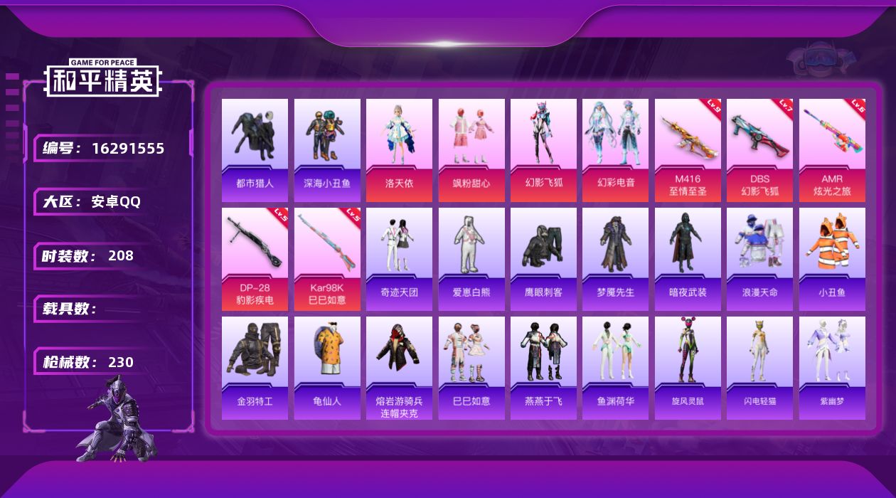 [16291555]安卓 手Q-4粉装-5特效枪-0载具-0粉色飞行器-71298热力值-9王牌印记-208套装-230枪皮 【热门品类】:套装-浪漫天命,套装-都市猎人,套装-深海小丑鱼,套装-小丑鱼,套装-金羽特工,套装-SS1特训,套装-龟仙人,熔岩游骑兵连帽夹克 【粉色套装】:角色-洛天依,粉装-飒粉甜心,粉装-幻影飞狐,粉装-幻彩电音 【粉色枪皮等级】:M416-至情至圣(九级),Kar98K-巳巳如意(五级),AMR-炫光之旅(六级),DBS-幻影飞狐(七级),DP-28-豹影疾电(五级) 【粉色枪皮】:M416-至情至圣,Kar98K-巳巳如意,AMR-炫光之旅,DBS-幻影飞狐,DP-28-豹影疾电 【粉色降落伞】:百万伏特降落伞,神秘黑猫降落伞,银刃赛罗降落伞,王牌四分卫降落伞,星之彼岸降落伞,怪笑疯兔降落伞,齐天大圣降落伞,洛神天依降落伞,彩虹甜喵降落伞,飒粉甜心降落伞,闲梦青缨降落伞,炫光之旅降落伞,幻影飞狐降落伞 【稀有套装】:套装-龟仙人,套装-巳巳如意,套装-燕燕于飞,套装-鱼渊荷华,套装-旋风灵鼠,套装-闪电轻猫,套装-紫幽梦,套装-蓝冰羽,套装-霓虹热舞,套装-云朵鹅,套装-雪绒豹 【稀有枪皮】:AKM-冰凉西瓜,AKM-墨染幽兰,AKM-彩虹符号,AKM-影袭,AKM-环太平洋,AKM-生命誓言,AKM-百万伏特,AKM-虎虎生威,AKM-霓虹街区,AKM-龙的传人,M16A4-幻世战舞者,M16A4-机械英豪,SCAR-L-炫彩节奏,SCAR-L-红色方程式,SCAR-L-雷霆特警,SCAR-L-黄金龙骨,M416-仓鼠灰灰,M416-夜灯,M416-暗夜行者,M416-糯团青竹,M416-蓝色火焰,GROZA-异彩先驱,GROZA-影袭,GROZA-治愈之星,GROZA-生命誓言,GROZA-田园牧歌,GROZA-蓝莓炮弹,GROZA-黑色刀锋,AUG-天降萌叽,AUG-幻影战神,AUG-耀粉歌者,AUG-青春冒险家,QBZ-彩虹符号,QBZ-洛神天依,QBZ-诡娃娃,QBZ-赛罗,M762-天降萌叽,M762-彩虹甜喵,M762-拳皇97,M762-瑞龙福将,M762-生命誓言,M762-诡娃娃,M762-云朵鹅,M762-幻影飞狐,Mk47-妙红点点,Mk47-洛神天依,Mk47-炫光之旅,Mk47-百万伏特,Mk47-青春冒险家,AC-VA
