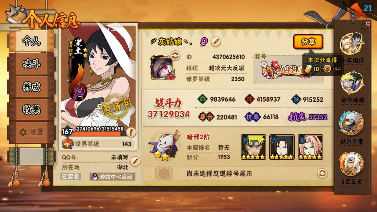- [12086787]V12 24S忍 52A忍 20通灵 1367W战力 可二次 可修改实名 优质装备:熊猫,宇智波鼬「秽土转生」,药师兜「仙人模式」,宇智波斑「秽土转生」,艾「三代目雷影」,千手扉间「秽土转生」,纲手「百豪」,无「二代目土影」,波风水门「秽土转生」,猿飞日斩「秽土转生」,千手柱间,宇智波带土 「忍界大战」,“宇智波斑” 「白面具」,漩涡鸣人 「九喇嘛连结」,宇智波佐助「永恒万花筒」,千手柱间·木叶创立,宇智波斑「秽土转生·解」,大筒木桃式,艾「忍界大战」 S级忍者:自来也 「舞之豪杰」,佩恩「天道」,猿飞日斩,波风水门,大蛇丸,纲手