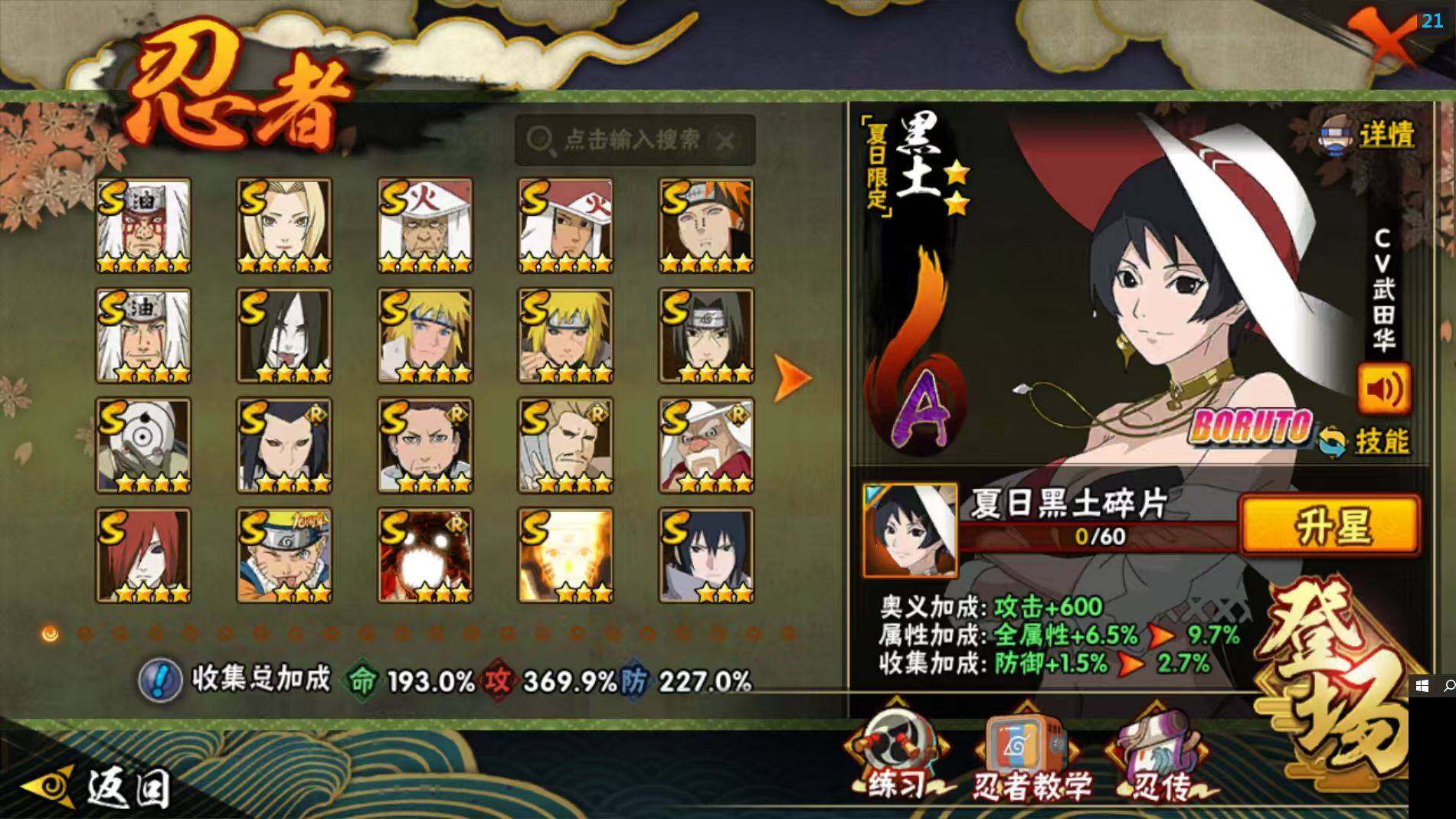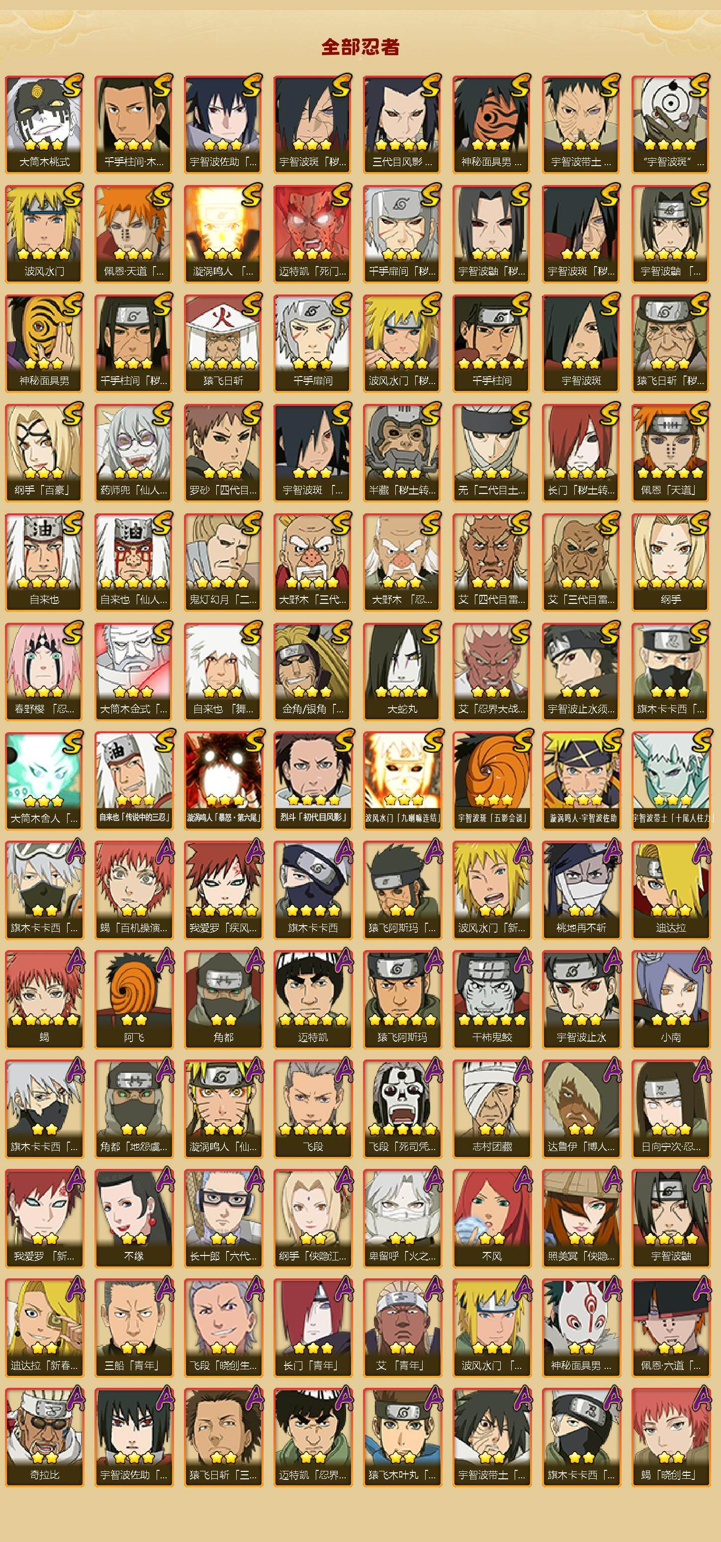 【S级忍者】:长门「秽土转生」(4星),三代目风影「秽土转生」(4星),半藏「秽土转生」(3星),金角·银角「秽土转生」(3星),猿飞日斩「秽土转生」(3星),波风水门「秽土转生」(4星),千手扉间「秽土转生」(3星),千手柱间「秽土转生」(3星),宇智波鼬「秽土转生」(3星),宇智波斑「秽土转生」(3星),宇智波斑「秽土转生·解」(3星),大野木「忍界大战」(3星),春野樱「忍界大战」(3星),宇智波带土「忍界大战」(3星),艾「忍界大战」(3星),宇智波鼬「须佐能乎」(4星),宇智波止水「须佐能乎」(3星),旗木卡卡西「须佐能乎」(3星),宇智波斑「木叶创立」(3星),千手柱间「木叶创立」(3星),无「二代目土影」(3星),艾「四代目雷影」(3星),罗砂「四代目风影」(3星),鬼灯幻月「二代目水影」(4星),大野木「三代目土影」(4星),艾「三代目雷影」(3星),烈斗「初代目风影」(4星),自来也(4星),自来也「仙人模式」(5星),自来也「舞之豪杰」(3星),大蛇丸(4星),自来也「传说中的三忍」(3星),纲手(5星),纲手「百豪」(3星),千手柱间(5星),千手扉间(3星),猿飞日斩(5星),宇智波斑(3星),波风水门(4星),药师兜「仙人模式」(3星),神秘面具男(3星),神秘面具男「红夜之刃」(3星),漩涡鸣人「九喇嘛连结」(3星),迈特凯「死门」(3星),佩恩「天道」(5星),佩恩·天道「超」(3星),宇智波佐助「永恒万花筒」(3星),宇智波斑 「白面具」(4星宇智波斑「白面具」),大筒木金式(3星),大筒木桃式(3星),大筒木舍人「最终章」(3星),漩涡鸣人「暴怒·第六尾」(3星),波风水门「九喇嘛连结」(3星),宇智波斑「五影会谈」(3星),漩涡鸣人·宇智波佐助(3星),宇智波带土「十尾人柱力」(3星)