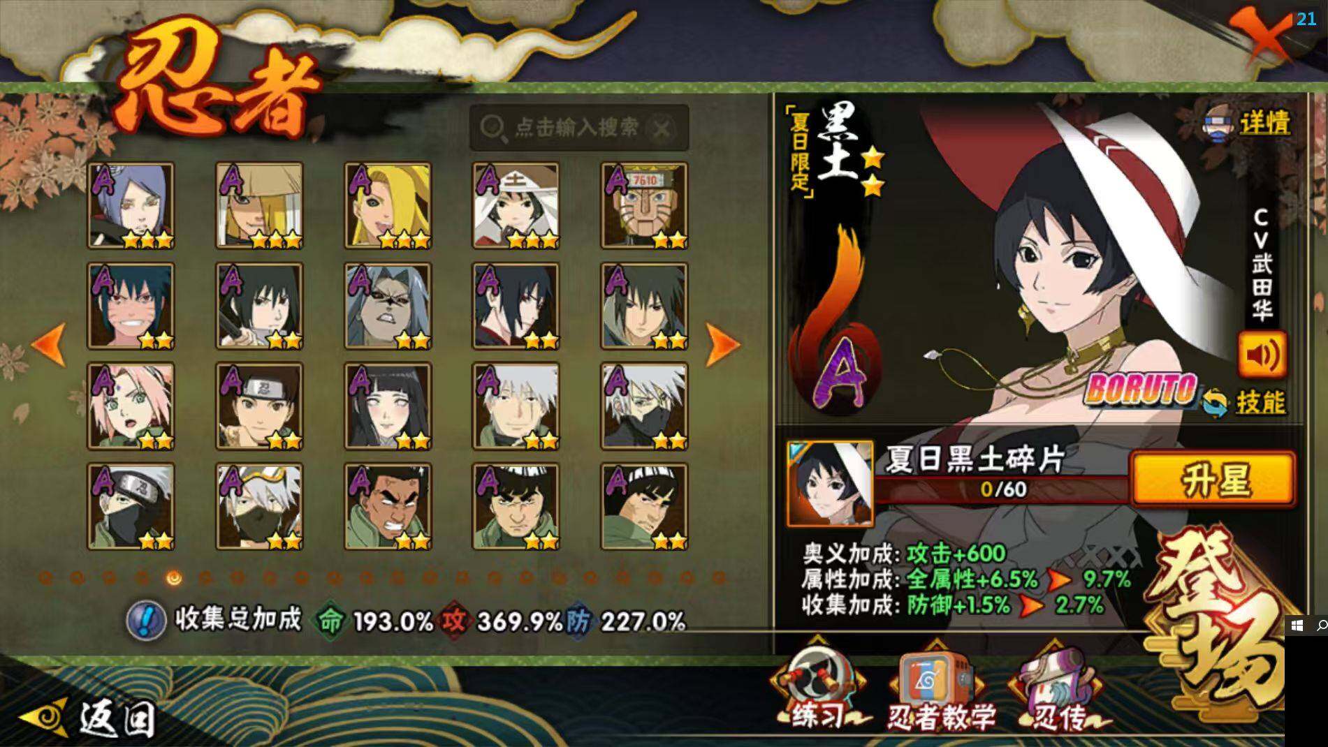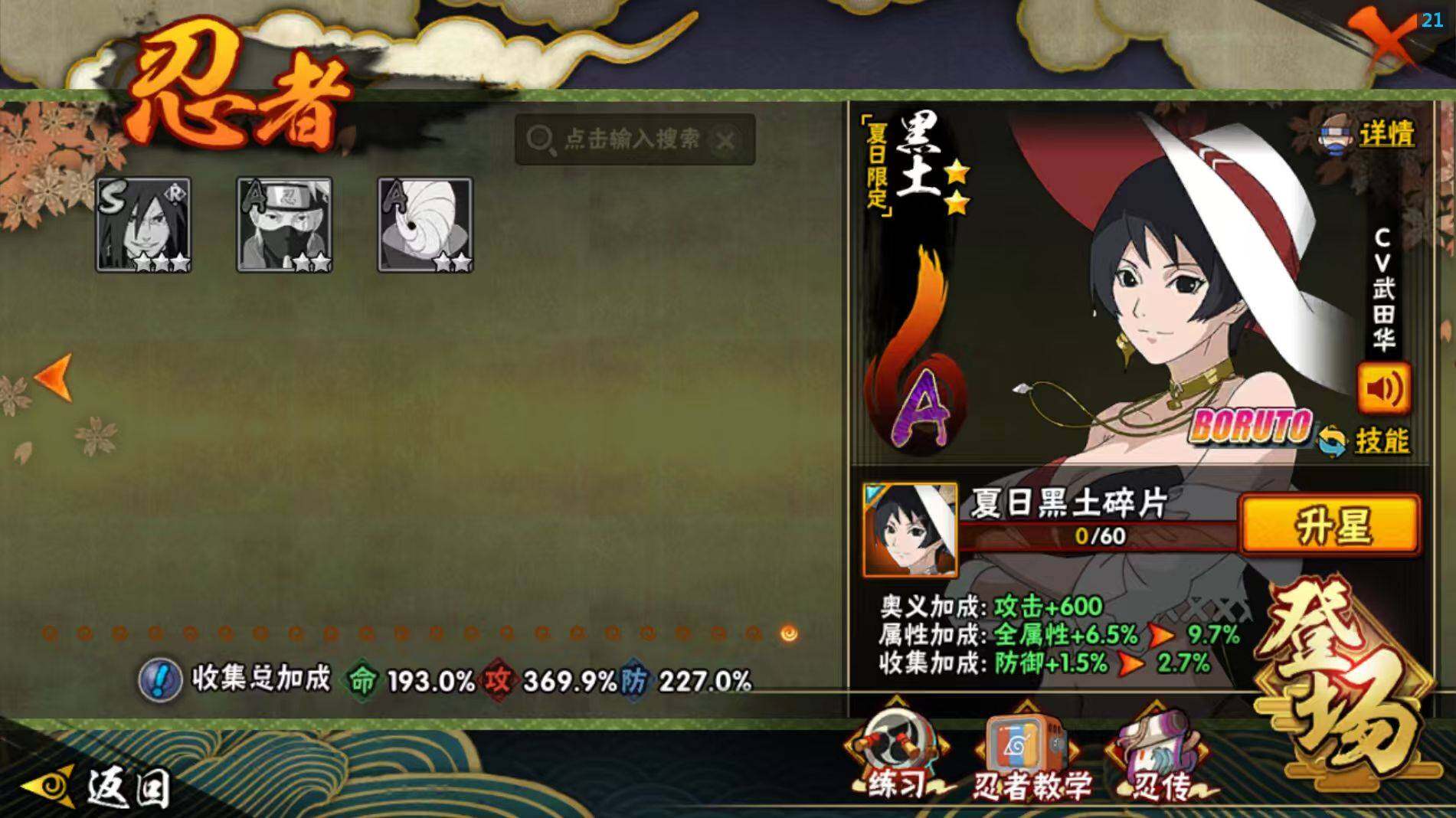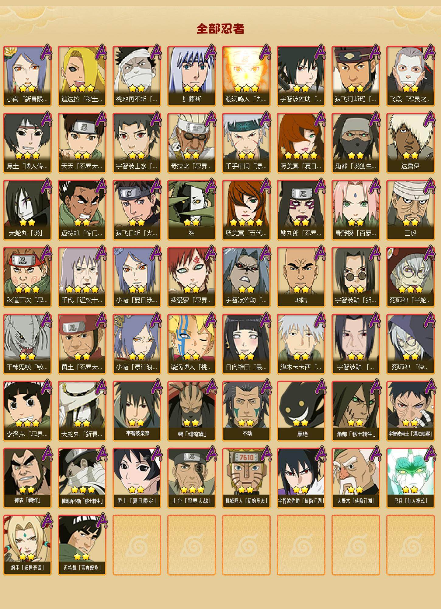 【A级忍者】:艾「青年」(2星),三船「青年」(2星),三船(2星),长门「青年」(3星),波风水门「青年」(3星),波风水门「新春限定」(2星),达鲁伊「博人传」(2星),达鲁伊(2星),迪达拉(3星),迪达拉「新春限定」(2星),迪达拉「秽土转生」(3星),大蛇丸「晓」(2星),大蛇丸「新春限定」(2星),奇拉比(2星),奇拉比「忍界大战」(2星),飞段(5星),飞段「死司凭血」(5星),飞段「晓创生」(2星