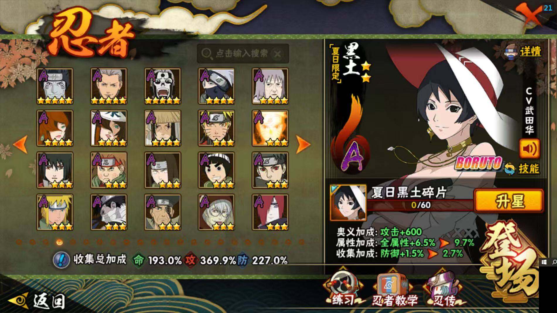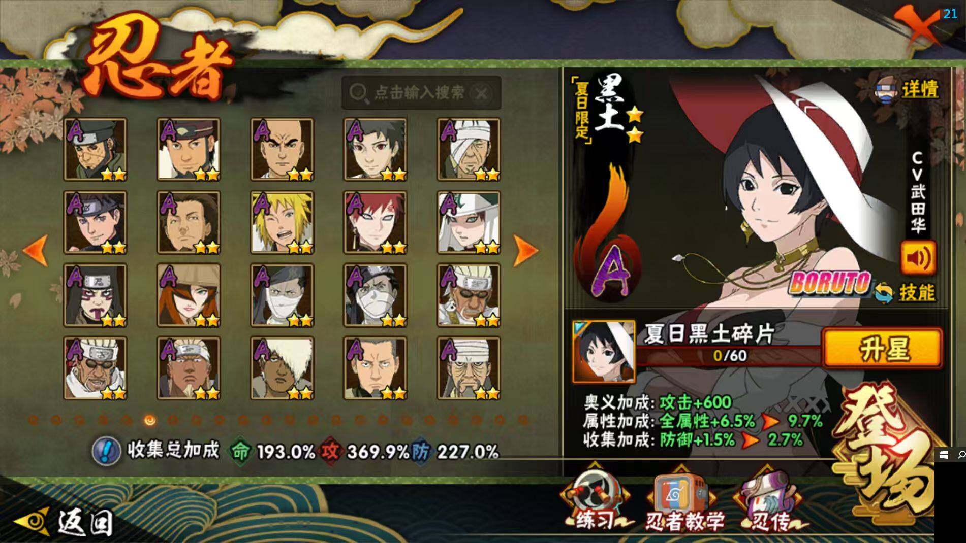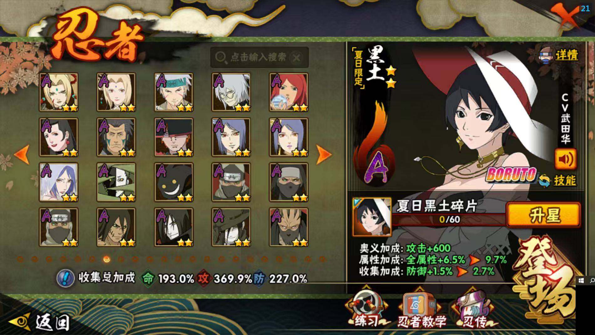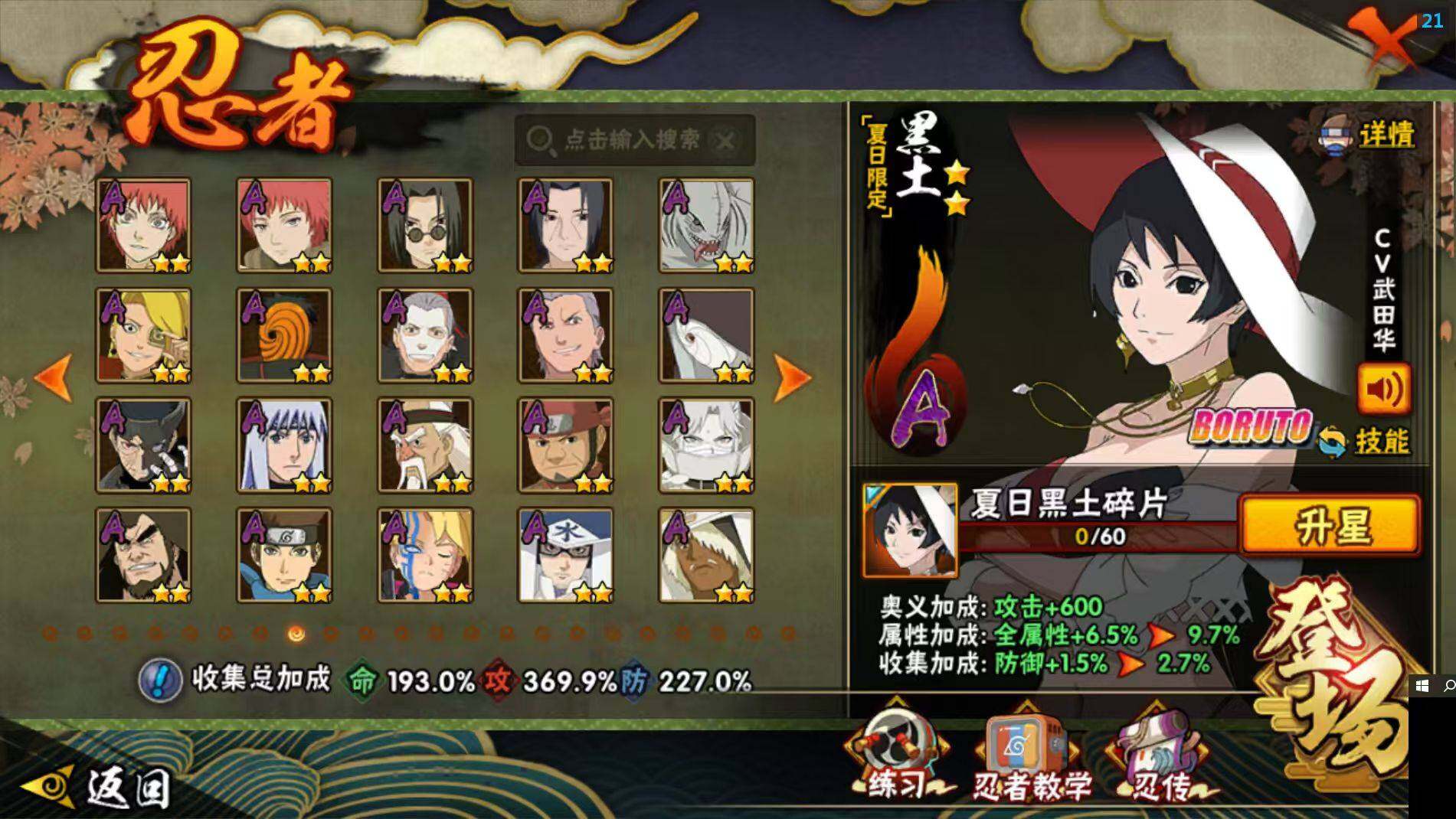 【A级忍者】:艾「青年」(2星),三船「青年」(2星),三船(2星),长门「青年」(3星),波风水门「青年」(3星),波风水门「新春限定」(2星),达鲁伊「博人传」(2星),达鲁伊(2星),迪达拉(3星),迪达拉「新春限定」(2星),迪达拉「秽土转生」(3星),大蛇丸「晓」(2星),大蛇丸「新春限定」(2星),奇拉比(2星),奇拉比「忍界大战」(2星),飞段(5星),飞段「死司凭血」(5星),飞段「晓创生」(2星