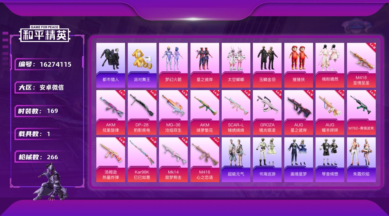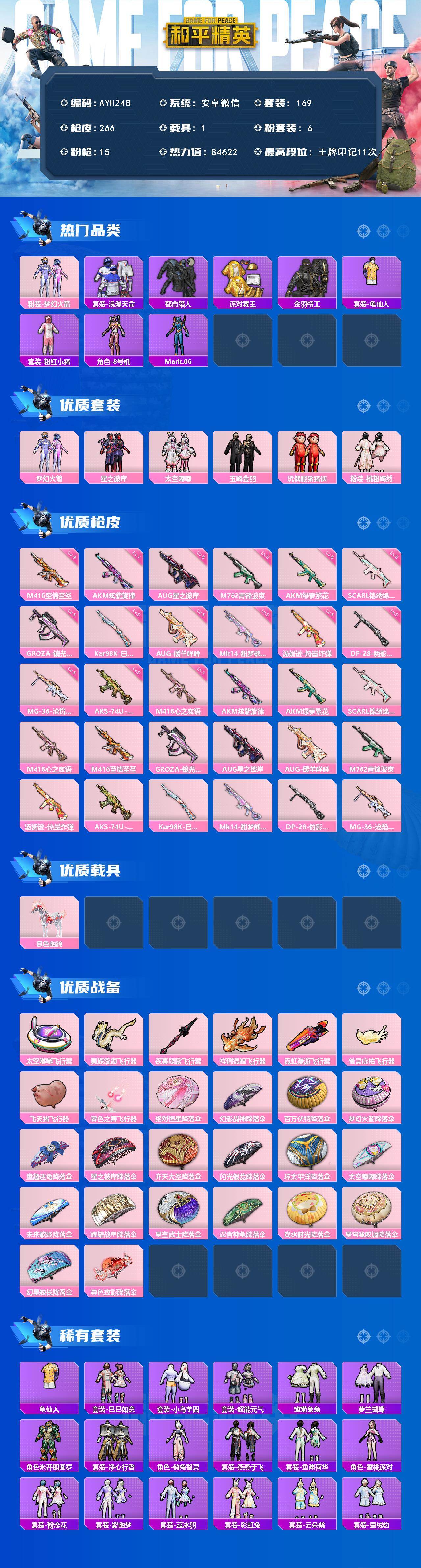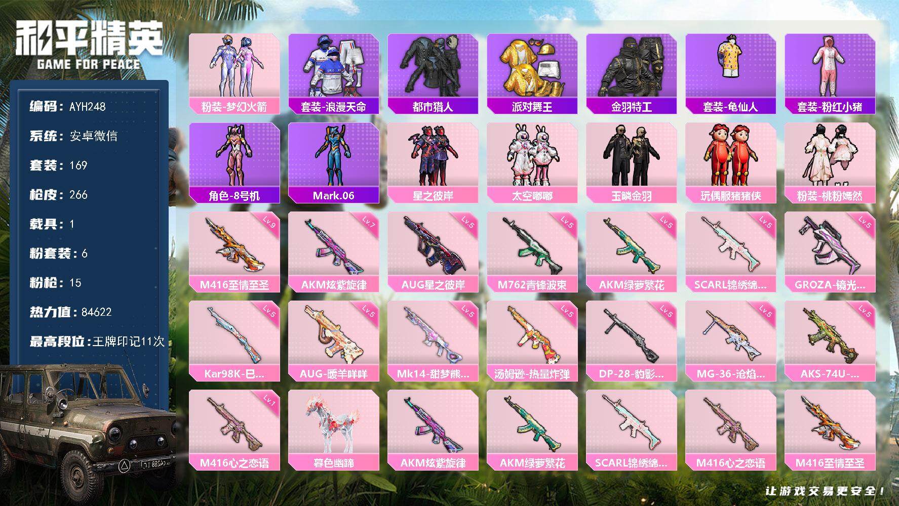 安卓 微信-6粉装-15特效枪-1载具-10粉色飞行器-84622热力值-11王牌印记-169套装-266枪皮