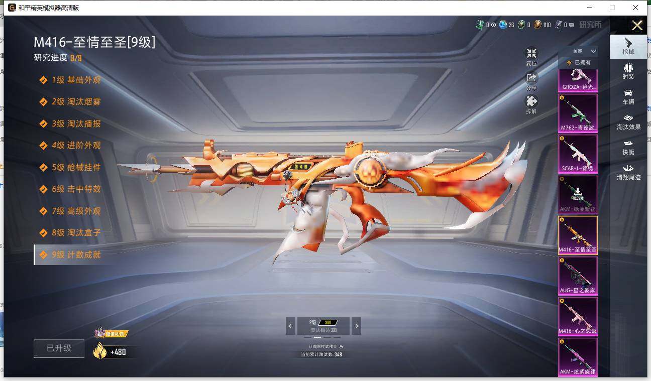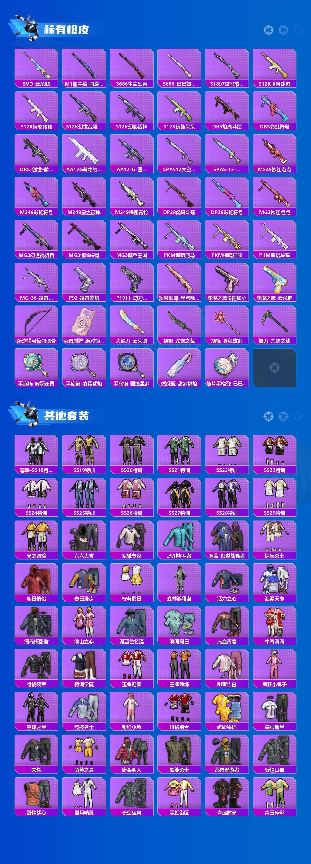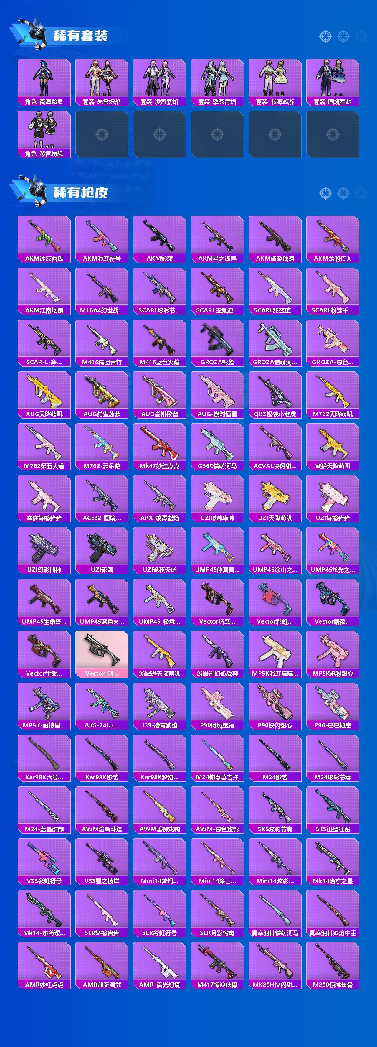 AKM-炫紫旋律,AKM-绿萝繁花,SCAR-L-锦绣绵绵,M416-心之恋语,M416-至情至圣,GROZA-镜光银凌,AUG-星之彼岸,AUG-暖羊咩咩,M762-青锋波束,Kar98K-巳巳如意