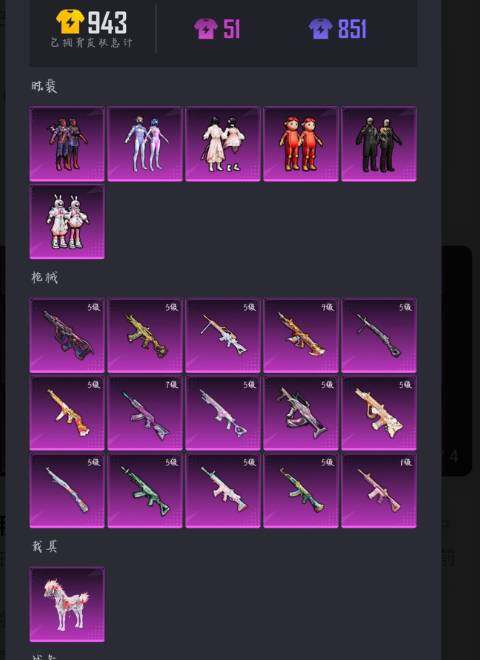 【粉色枪皮等级】:AKM-炫紫旋律(七级),AKM-绿萝繁花(五级),SCAR-L-锦绣绵绵(五级),M416-心之恋语(一级),M416-至情至圣(九级),GROZA-镜光银凌(五级),AUG-星之彼岸(五级),AUG-暖羊咩咩(五级),M762-青锋波束(五级),汤姆逊-热量炸弹(五级),AKS-74U-森灵之息(五级),Kar98K-巳巳如意(五级),Mk14-甜梦熊击(五级),DP-28-豹影疾电(五级),MG-36-沧焰双生(五级)
