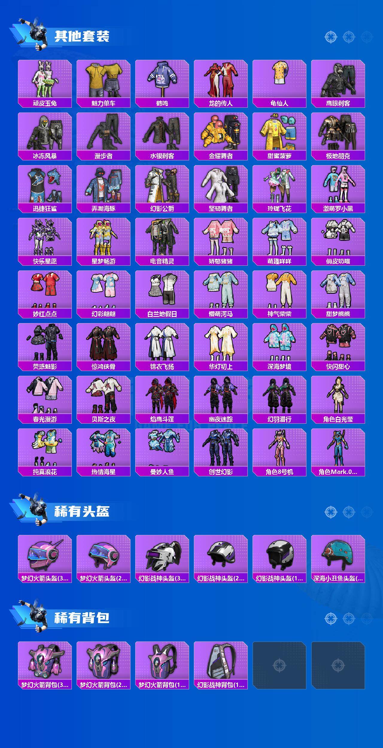 套装-浪漫天命,套装-金羽特工,套装-龟仙人,套装-粉红小猪,角色-8号机,角色-Mark.06,套装-漫步者,套装-水银刺客,套装-弄潮海豚