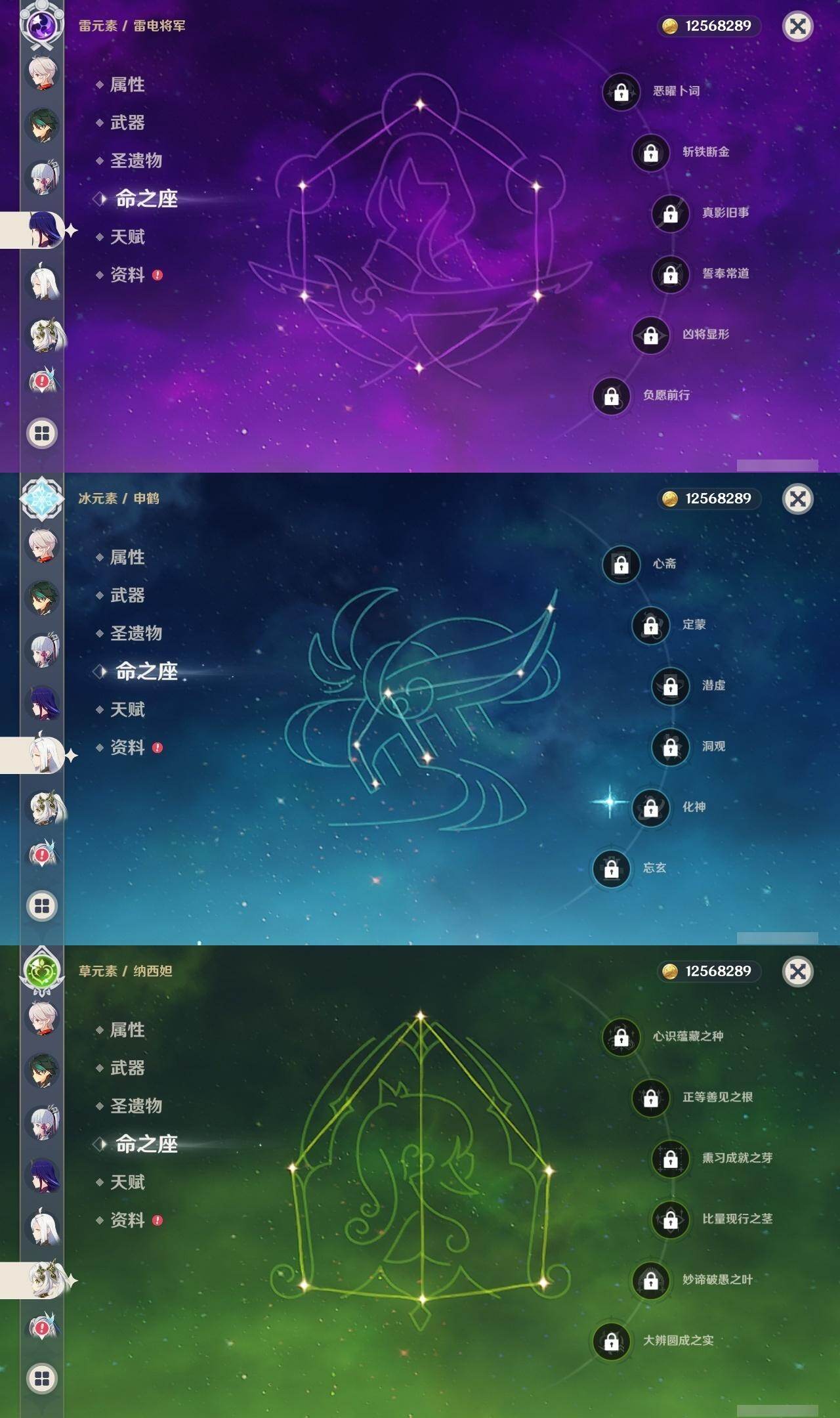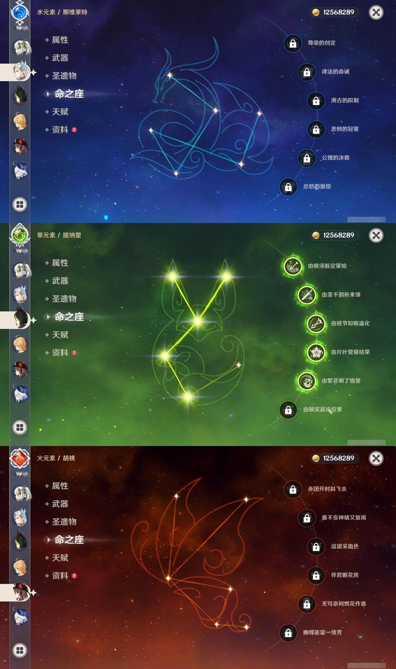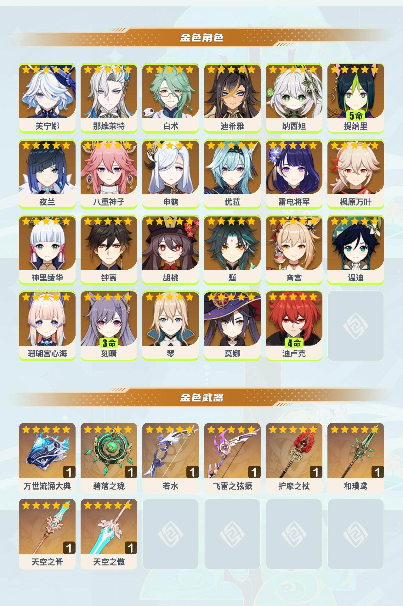0命芙宁娜,0命那维莱特,0命白术,0命迪希雅,0命纳西妲,5命提纳里,0命夜兰,0命八重神子,0命申鹤,0命优菈,0命雷电将军,0命枫原万叶,0命神里绫华,0命钟离,0命胡桃,0命魈,0命宵宫,0命温迪,0命珊瑚宫心海,3命刻晴,0命琴,0命莫娜,4命迪卢克,精1万世流涌大典,精1碧落之珑,精1若水,精1飞雷之弦振,精1护摩之杖,精1和璞鸢,精1天空之脊,精1天空之傲