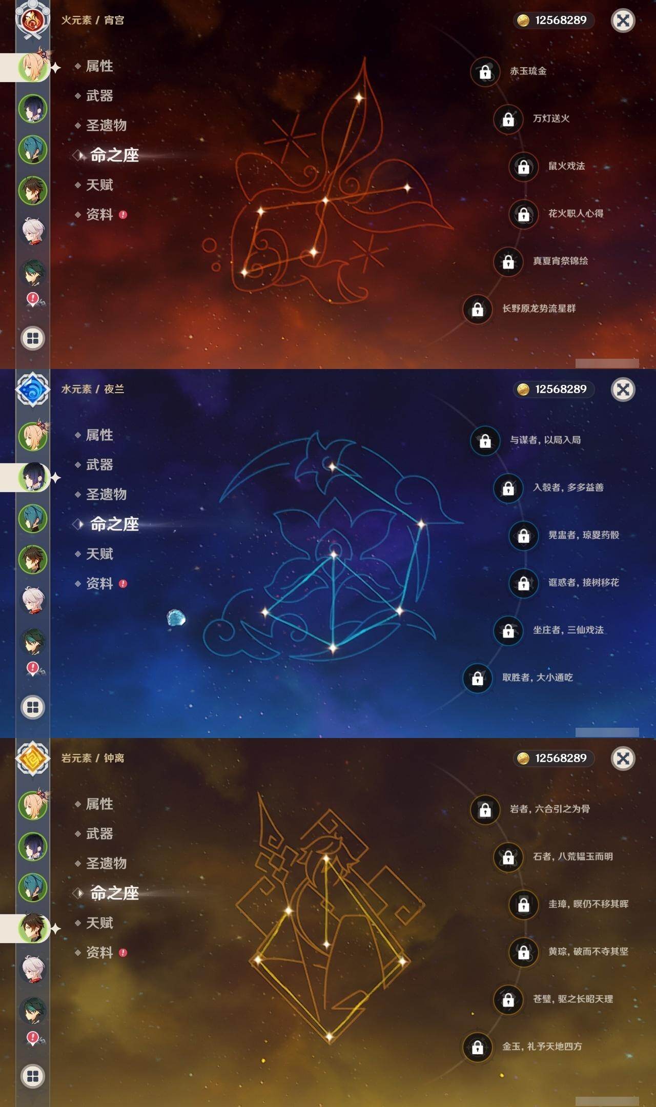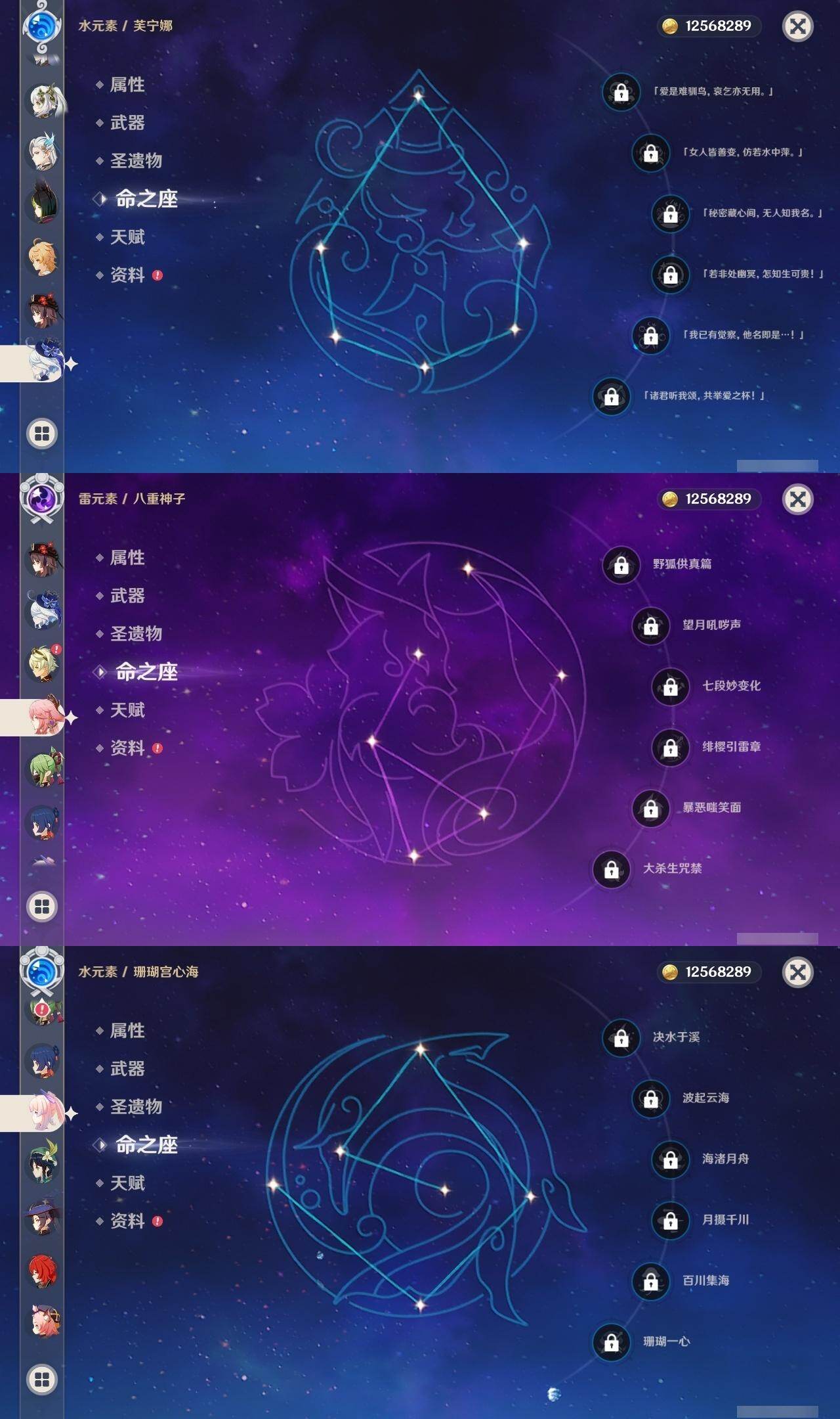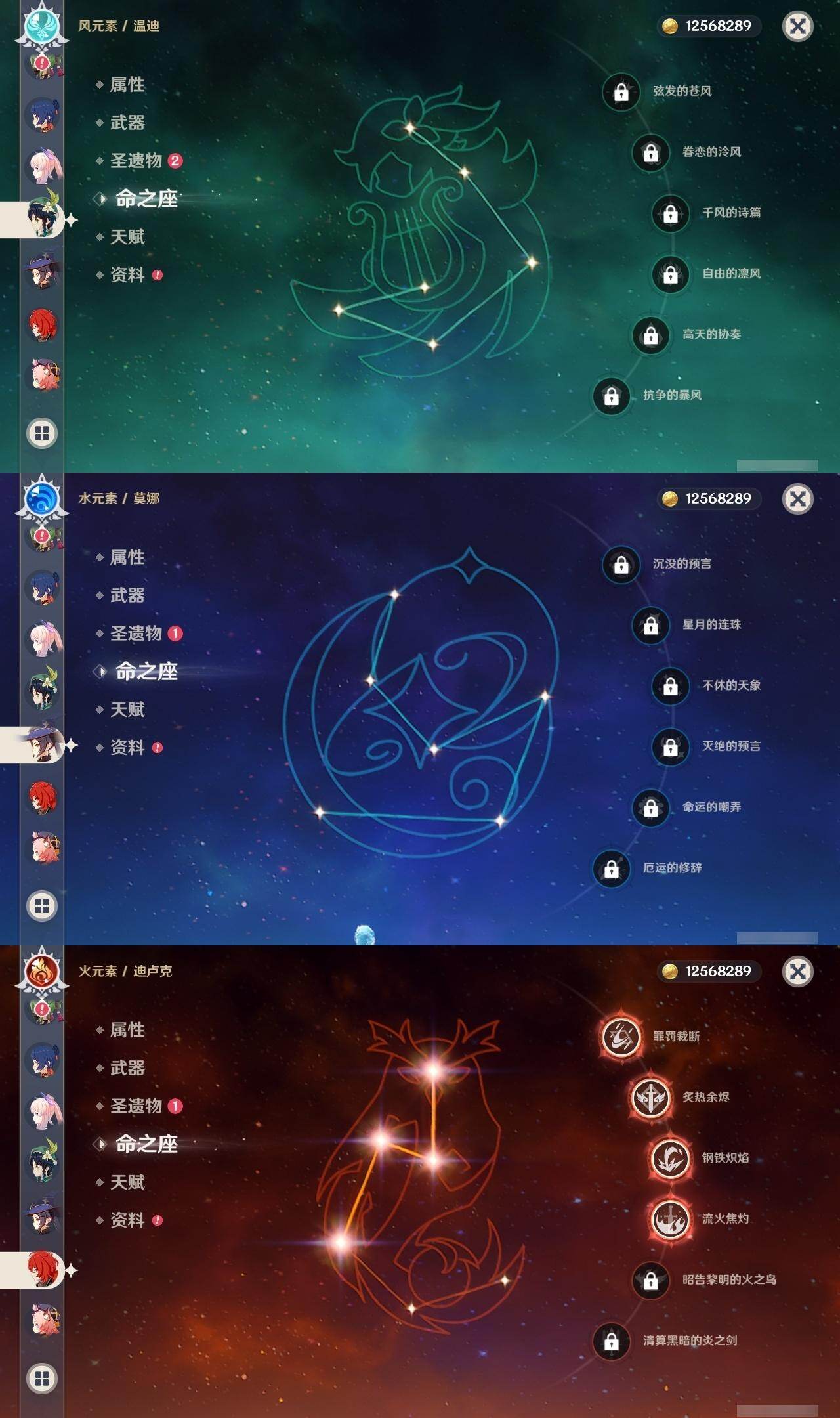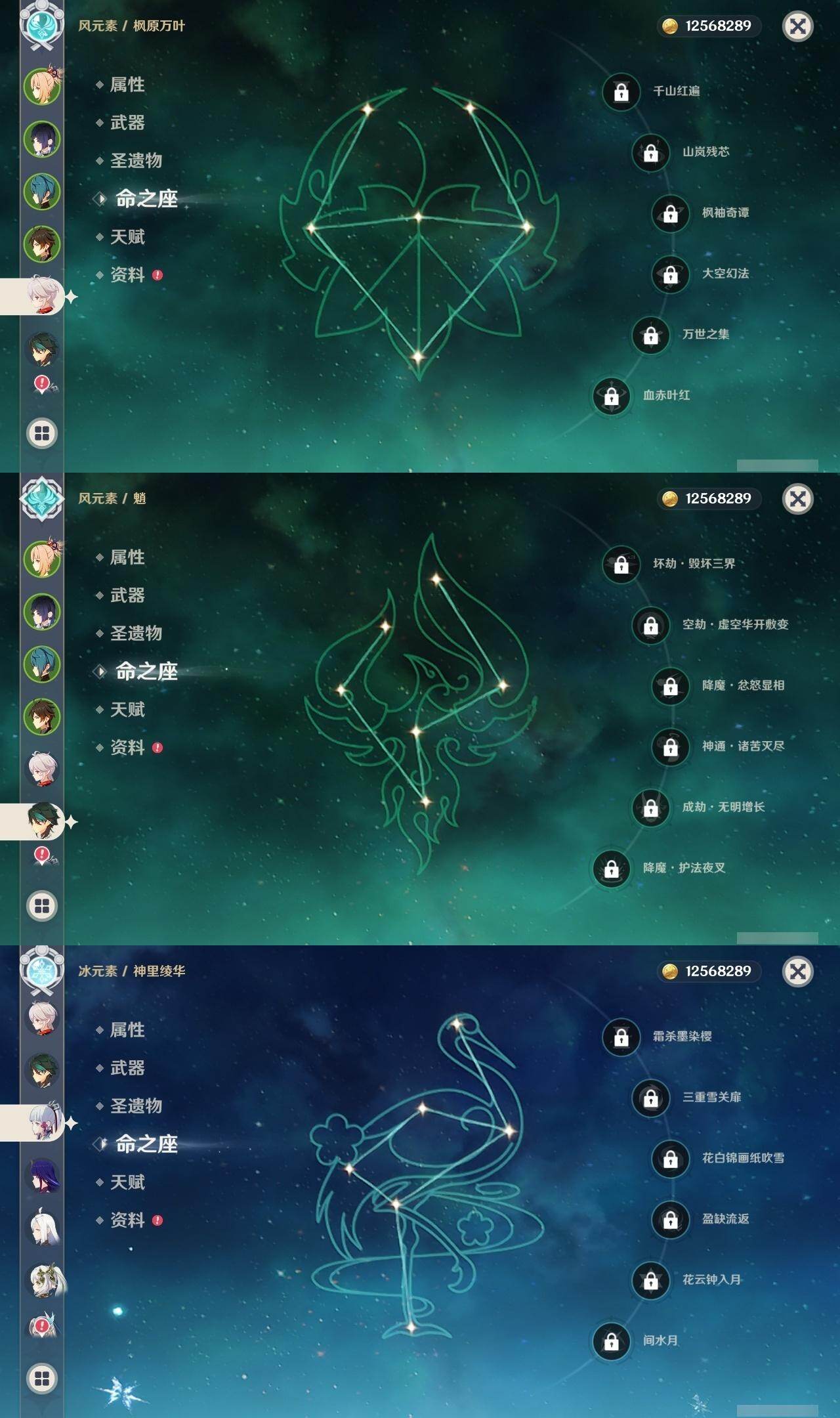 0命芙宁娜,0命那维莱特,0命白术,0命迪希雅,0命纳西妲,5命提纳里,0命夜兰,0命八重神子,0命申鹤,0命优菈,0命雷电将军,0命枫原万叶,0命神里绫华,0命钟离,0命胡桃,0命魈,0命宵宫,0命温迪,0命珊瑚宫心海,3命刻晴,0命琴,0命莫娜,4命迪卢克,精1万世流涌大典,精1碧落之珑,精1若水,精1飞雷之弦振,精1护摩之杖,精1和璞鸢,精1天空之脊,精1天空之傲