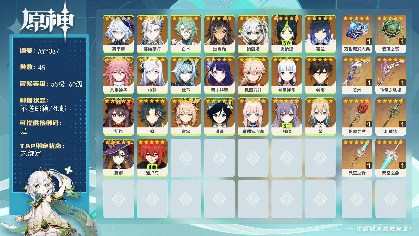 [16298513]59级/45黄/男主/23个五星角色/10个五星武器 0命芙宁娜,0命那维莱特,0命白术,0命迪希雅,0命纳西妲,5命提纳里,0命夜兰,0命八重神子,0命申鹤,0命优菈,0命雷电将军,0命枫原万叶,0命神里绫华,0命钟离,0命胡桃,0命魈,0命宵宫,0命温迪,0命珊瑚宫心海,3命刻晴,0命琴,0命莫娜,4命迪卢克,精1万世流涌大典,精1碧落之珑,精1若水,精1飞雷之弦振,精1护摩之杖,精1和璞鸢,精1天空之脊,精1天空之傲