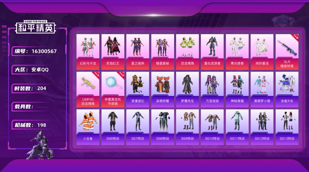 [16300567]安卓 手Q-8粉装-3特效枪-0载具-1粉色飞行器-65510热力值-5王牌印记-204套装-198枪皮 【热门品类】:套装-浪漫天命,套装-小丑鱼,套装-浪漫波比 【粉色套装】:粉装-幻彩马卡龙,粉装-炙焰红王,粉装-星之彼岸,粉装-暗星紫秘,粉装-恐龙拽拽,角色-复仇流浪者,粉装-寒光使者,粉装-纯珍童话 【粉色枪皮等级】:UMP45-恐龙拽拽(四级),SLR-暗夜玫瑰(六级),平底锅-仲夏莫吉托(二级) 【粉色枪皮】:UMP45-恐龙拽拽,SLR-暗夜玫瑰,平底锅-仲夏莫吉托 【粉色飞行器】:暗翼战神飞行器 【粉色降落伞】:春暖花开降落伞,神秘黑猫降落伞,古堡领主降落伞,四圣焕新降落伞,马卡龙降落伞,潮汐统领降落伞,夏日绵绵冰降落伞,香水柠檬降落伞,王牌四分卫降落伞,暗夜玫瑰降落伞,蓝莓炮弹降落伞,恐龙拽拽降落伞,幻梦音符降落伞,炙焰牛王降落伞,异瞳寒姬降落伞,极意拳锋降落伞 【稀有套装】:套装-雪国风尚 【稀有枪皮】:AKM-四圣焕新,AKM-夜灯,AKM-彩虹符号,AKM-恐龙拽拽,AKM-灼热熔岩,AKM-萌趣颜团子,AKM-虎虎生威,M16A4-夜灯,M16A4-幻世战舞者,M16A4-机械英豪,M16A4-甜心亚梦,M16A4-生命誓言,SCAR-L-扶摇飞仙,SCAR-L-炫彩节奏,SCAR-L-玉兔迎春,M416-神秘黑猫,M416-紫翼圣骑,GROZA-异彩先驱,GROZA-彩虹符号,GROZA-恐龙拽拽,GROZA-懵萌河马,GROZA-治愈之星,GROZA-生命誓言,GROZA-田园牧歌,GROZA-紫翼圣骑,AUG-天降萌叽,AUG-耀粉歌者,AUG-青春冒险家,QBZ-原初圣火,QBZ-彩虹符号,QBZ-电玩视界,QBZ-神秘黑猫,QBZ-飞驰魅影,M762-天降萌叽,M762-彩虹甜喵,M762-牛气冲天,M762-瑞龙福将,M762-镭射皇者,Mk47-天之羽翼,Mk47-妙红点点,Mk47-洛神天依,Mk47-百万伏特,Mk47-青春冒险家,G36C-不夜海上花,G36C-冷魅冰骑,G36C-懵萌河马,G36C-时空追击者,AC-VAL-天降萌叽,AC-VAL-彩虹甜喵,AC-VAL-甜心亚梦,蜜獾-天降萌叽,蜜獾-娇憨猪猪,UZI-天降萌叽,UZI-娇憨猪猪,UZI-炫彩节奏,UZI-烈焰拳霸,UZI-金玉无双,UZI-金风玉