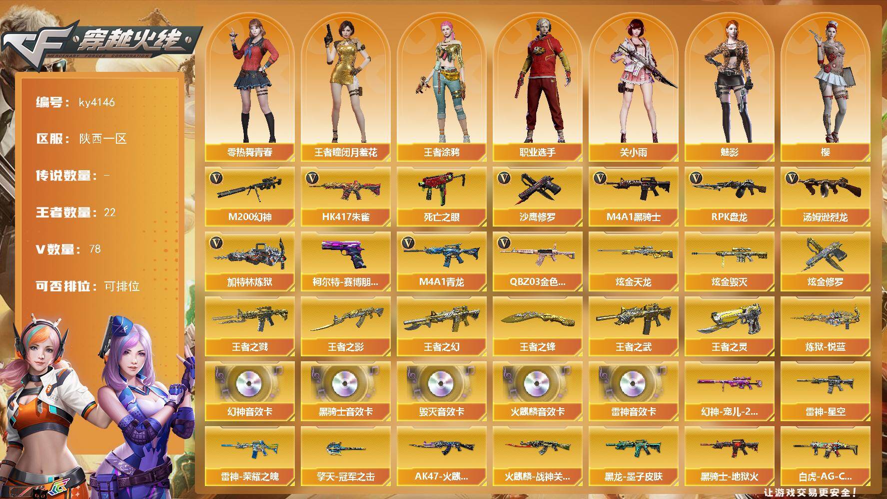 [16159994]陕西一区-78V-22王者-4炫金 【热门武器】:QBZ03-金色蔷薇,HK417-朱雀,M4A1-青龙,M200-幻神,死亡之眼,M4A1-黑骑士,汤姆逊-烈龙*6,RPK-盘龙*5,加特林-炼狱*3,沙鹰-修罗*5,柯尔特-赛博朋克 【王者炫金武器】:王者之戮,王者之幻,王者之武,王者之影,炼狱-悦蓝,王者之灵*2,王者之锋,炫金毁灭,炫金天龙,炫金修罗*2 【音效卡】:M200-幻神音效卡,AK47-火麒麟音效卡,M4A1-雷神音效卡,M4A1-黑骑士音效卡,Barrett-毁灭音效卡*2 【皮肤】:幻神-宠儿-2021MVP,白虎-AG-CFPLS20冠军,雷神-荣耀之魄,雷神-星空,AK47-火麒麟-传奇EVEN,火麒麟-战神关羽*2,火麒麟-心动糖果,黑龙-墨子皮肤,黑骑士-地狱火,战神-粉色甜心皮肤,战神-流金岁月皮肤,AK47-B-常胜将军-刘备*2,AK47-B-常胜将军-孙权*2,AWM-天龙-传奇70KG,修罗-能量核心*2,擎天-冠军之击,麒麟刺-甜蜜糖果 皮肤 【角色】:樱,魅影,关小雨,王者-瞳-闭月羞花,王者涂鸦,乔伊教练,空,暗夜-X,初恋灵狐,电竞少女,芳心审判者,风暴女,嘉年华灵狐,荆棘玫瑰,兰-空鹰,零-热舞青春,潘多拉-X,潘多拉-甜心教官,斯沃特-X,铁骑荣耀,新娜塔莎,影武者-X,职业选手,雅典娜 【人偶武器】:火麒麟-灵狐*2,M4A1-雷神-精英刀锋,AWM-灵狐-15周年嘉年华,COP-旗袍,迷你裂空之翼*4,夺魂*2,迷你牛牛,深渊终结者手雷,闪光弹-小乔,闪光弹-貂蝉,高爆手雷-大乔,迷你艾比 【暴走生化】:死亡之眼,超级对讲机 【挑战大师】:神圣爆裂者III,冰龙粉碎者-白马银枪,激光毁灭者III-白马银枪,VEPR-12-金魔,激光毁灭者III,阐释者III*2 【英雄级武器】:AK47-火麒麟*2,M4A1-黑龙,M4A1-雷神*2,M4A1-黑骑士,AN94-超新星,M4A1-龙血,M4A1-青龙,HK417-朱雀,无影-神兵利器,黑武士-锦绣游龙,QBZ03-金色蔷薇,烈火-动感闪耀,王者之魄-觉醒版,王者之势-觉醒版,AK-47-猩红传说*2,王者炎心-觉醒版,黑骑士-海王,AK47-B-常胜将军,Barrett-毁灭,Barrett-极光,AWM-裁决,M200-幻神,王者之力-觉醒版,RPK-盘