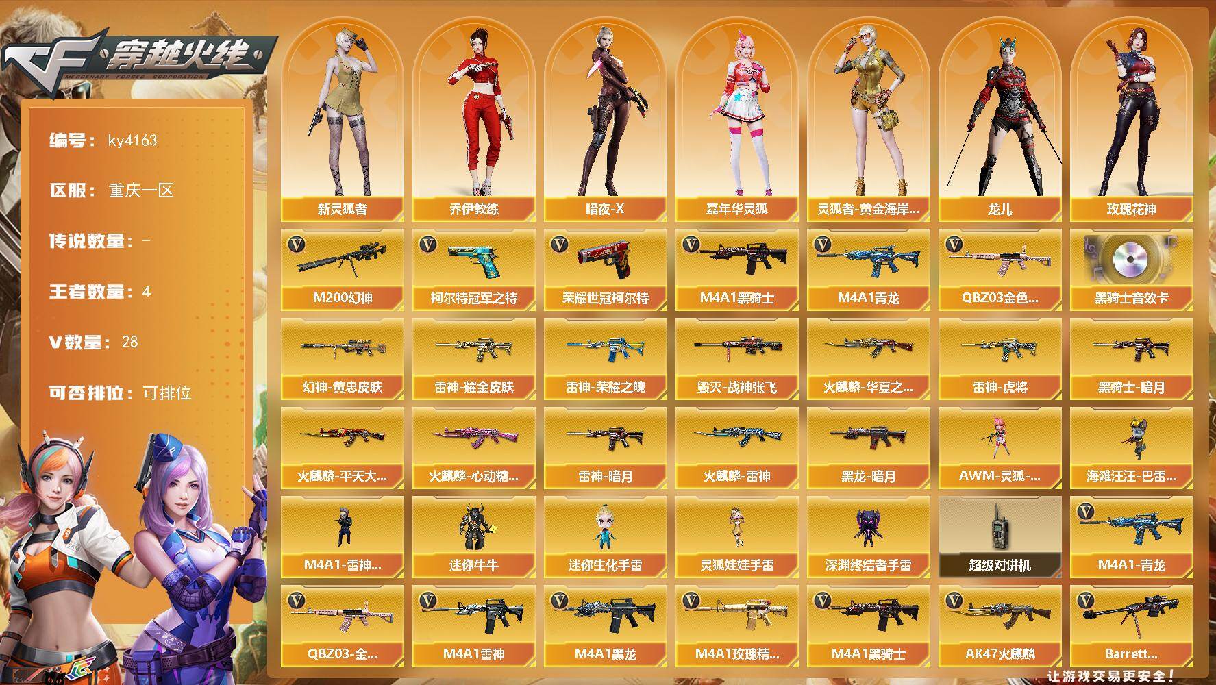 [16173777]重庆一区-28V-4王者-0炫金 【热门武器】:QBZ03-金色蔷薇,M4A1-青龙,M200-幻神,柯尔特-冠军之特,荣耀世冠-柯尔特*2,M4A1-黑骑士 【音效卡】:M4A1-黑骑士音效卡 【皮肤】:M200-幻神-黄忠皮肤,雷神-暗月,雷神-荣耀之魄,雷神-虎将,雷神-耀金皮肤,火麒麟-雷神,火麒麟-华夏之心,火麒麟-平天大圣,火麒麟-心动糖果,毁灭-战神张飞,黑龙-暗月,黑骑士-暗月 【角色】:乔伊教练,暗夜-X,嘉年华灵狐,灵狐者-黄金海岸,龙儿,玫瑰花神,潘多拉-X,新灵狐者,新娜塔莎,雪莉杨-摸金校尉,影武者-X 【人偶武器】:M4A1-雷神-精英刀锋,AWM-灵狐-15周年嘉年华,海滩汪汪-巴雷特,迷你牛牛,迷你生化手雷,深渊终结者手雷,灵狐娃娃手雷 【暴走生化】:超级对讲机 【英雄级武器】:AK47-火麒麟,M4A1-黑龙,M4A1-雷神,M4A1-黑骑士,M4A1-青龙,无影-神兵利器,黑武士-锦绣游龙,M4A1-玫瑰精灵,QBZ03-金色蔷薇,烈火-动感闪耀,王者之影-觉醒版,王者之武-觉醒版,王者之魄-觉醒版,AK-47-猩红传说,Barrett-毁灭,Barrett-极光,M200-幻神,沙鹰-天神,柯尔特-冠军之特,荣耀世冠-柯尔特*2,天神-动感闪耀,龙啸,擎天,屠龙-动感闪耀,王者之锋-觉醒版,高爆手雷-竞技荣光*2,手雷-动感闪耀,闪光弹-竞技荣光,烟雾弹-幻灵*2 【道具】:茸茸松狮背包,CFS限定背包,XROCK炫彩背包,亚洲杯纪念炫彩背包,超级背包,救世主-黑桃战神,绿色巨人,灵魂忍者*2,变异宝贝,迷雾幽灵,生化弹匣,夺命之镰,防化服*2,金色流光-枪王排位*2,星辰流光-枪王排位,枪王排位28赛季金色流光,枪王排位29赛季金色流光,动感闪耀表情,防弹头盔*8,防弹衣*10,C4工具钳*6,手雷包*3 【特殊枪械】:1黑骑士