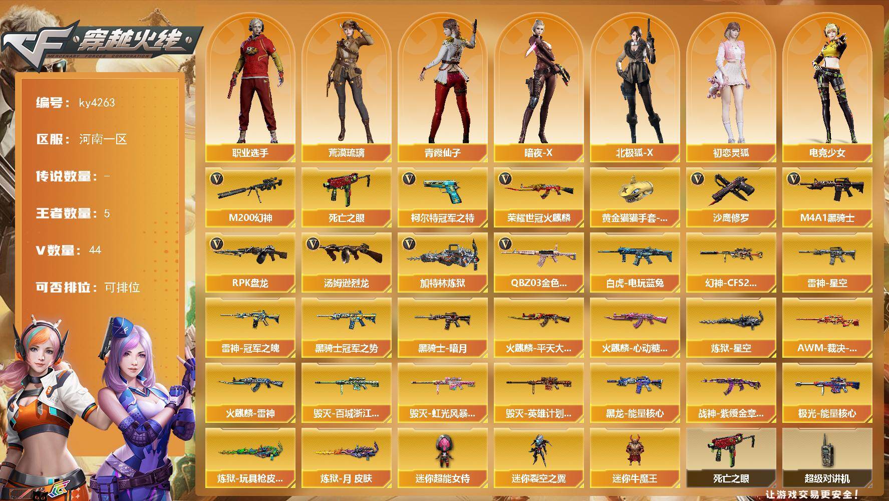 [16163106]河南一区-44V-5王者-0炫金 【热门武器】:QBZ03-金色蔷薇,M200-幻神,死亡之眼,荣耀世冠-火麒麟,白虎-电玩蓝兔,柯尔特-冠军之特,M4A1-黑骑士,汤姆逊-烈龙,RPK-盘龙*4,加特林-炼狱*6,沙鹰-修罗,黄金猫猫手套-白鲨 【皮肤】:幻神-CFS2022,AWM-裁决-凤灵皮肤,雷神-星空,雷神-冠军之魄,火麒麟-雷神,火麒麟-平天大圣*2,火麒麟-心动糖果,毁灭-百城浙江 皮肤,毁灭-虹光风暴 皮肤,毁灭-英雄计划 皮肤,黑龙-能量核心,黑骑士-暗月,黑骑士-冠军之势,战神-紫绶金章皮肤,极光-能量核心,炼狱-星空,炼狱-玩具枪皮肤,炼狱-月 皮肤 【角色】:荒漠琉璃,暗夜-X,北极狐-X,初恋灵狐,电竞少女,风暴女,虎妞,娟娟,灵狐者-X,灵狐者-黄金海岸,龙儿,麻雀,曼陀罗-X,曼陀罗-礼服,潘多拉-X,潘多拉-甜心教官,青霞仙子,斯沃特-X,雪莉杨,雪莉杨-摸金校尉,樱-战斗天使,影武者-X,游珑儿,职业选手 【人偶武器】:迷你裂空之翼,迷你牛魔王,迷你超能女侍 【暴走生化】:死亡之眼,超级对讲机 【挑战大师】:AK47-冰龙粉碎者,冰龙粉碎者-白马银枪*2,激光毁灭者III,机甲撕裂者III,神圣爆裂者-末日III 【英雄级武器】:AK47-火麒麟,M4A1-黑龙,M4A1-雷神,M4A1-黑骑士,QBZ03-金色蔷薇,白虎-电玩蓝兔,荣耀世冠-火麒麟,Barrett-毁灭,Barrett-极光,AWM-裁决,M200-幻神,RPK-盘龙*4,加特林-炼狱*6,汤姆逊-烈龙,沙鹰-修罗,沙鹰-天神*5,柯尔特-冠军之特,柯尔特-无冕之王,王者之魂-觉醒版,Glock18-武圣,屠龙*4,擎天,麒麟刺,王者之锋-觉醒版,王者之啸-觉醒版,闪光弹-云龙 【道具】:CFS限定背包,EP战队炫彩背包,全能枪王背包,老虎背包,虎牙炫彩背包,超级背包,哔哩哔哩名片,绿色巨人,灵魂忍者,迷雾幽灵,生化弹匣,夺命之镰,防化服*2,金色流光-枪王排位,星辰流光-枪王排位,巅峰赛先锋-金色流光,枪王排位28赛季金色流光,电玩兔兔表情,EP战队名片,EP战队喷图,EP战队击杀图标,防弹头盔*4,防弹衣*4,C4工具钳*5,手雷包*5 【特殊枪械】:1黑骑士,1烈龙,4盘龙,6炼狱