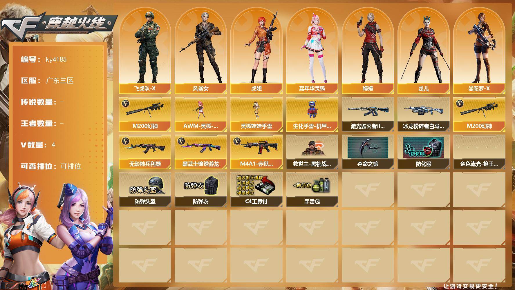 [16155178]广东三区-4V-0王者-0炫金 【热门武器】:M200-幻神 【角色】:飞虎队-X,风暴女,虎妞,嘉年华灵狐,娟娟,龙儿,曼陀罗-X,雪莉杨 【人偶武器】:AWM-灵狐-15周年嘉年华,生化手雷-机甲核心,灵狐娃娃手雷 【挑战大师】:冰龙粉碎者-白马银枪,激光毁灭者III-白马银枪 【英雄级武器】:无影-神兵利器,黑武士-锦绣游龙,M200-幻神,M4A1-赤狱骑士 【道具】:救世主-黑桃战神,夺命之镰,防化服,金色流光-枪王排位*2,星辰流光-枪王排位,枪王排位28赛季金色流光,防弹头盔,防弹衣,C4工具钳,手雷包 【特殊枪械】: