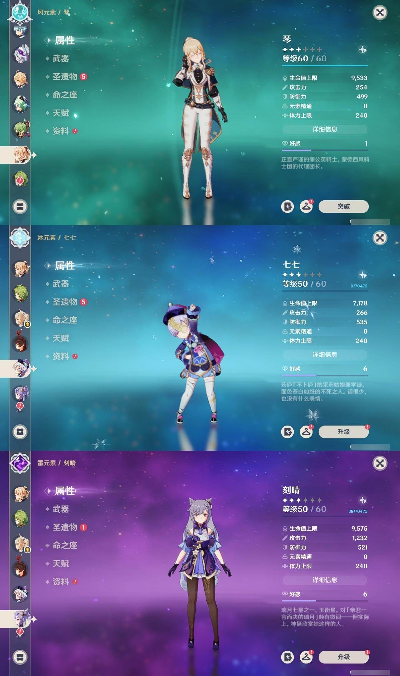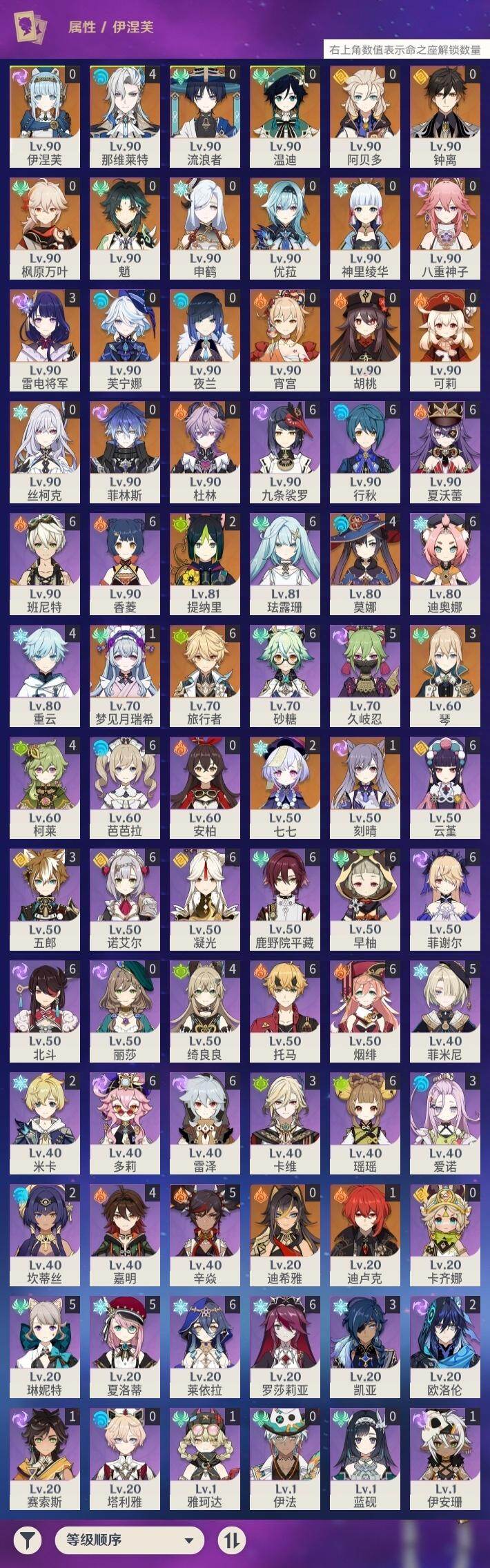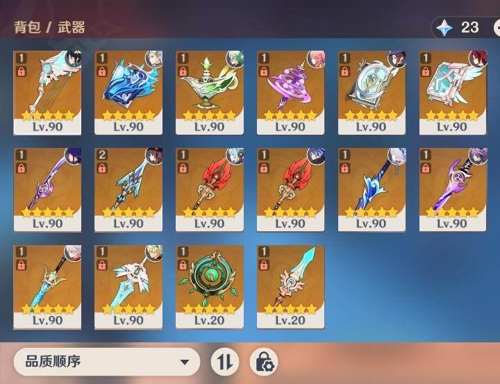 - [16453361]60级/46黄/女主/20个五星角色/13个五星武器 0命阿蕾奇诺,0命纳西妲,0命提纳里,0命荒泷一斗,1命优菈,0命雷电将军,2命枫原万叶,0命神里绫华,0命钟离,0命胡桃,0命宵宫,0命可莉,0命达达利亚,0命珊瑚宫心海,4命刻晴,4命七七,0命琴,1命莫娜,1命迪卢克,0命玛薇卡,精1赤沙之杖,精1神乐之真意,精1息灾,精1终末嗟叹之诗,精1雾切之回光,精1护摩之杖,精1和璞鸢,精1天空之脊,精1天空之刃,精1风鹰剑,精1狼的末路,精1柔灯挽歌
