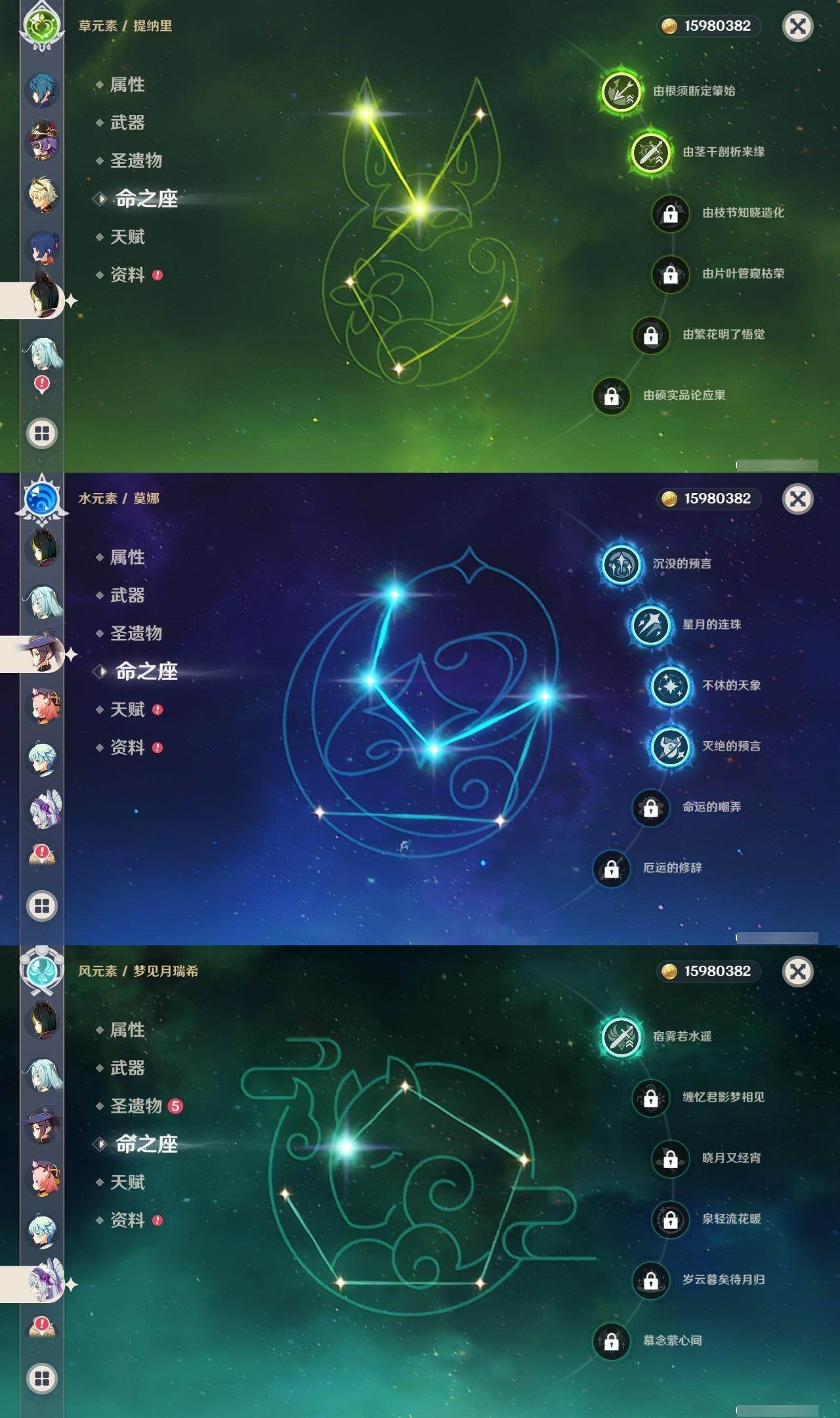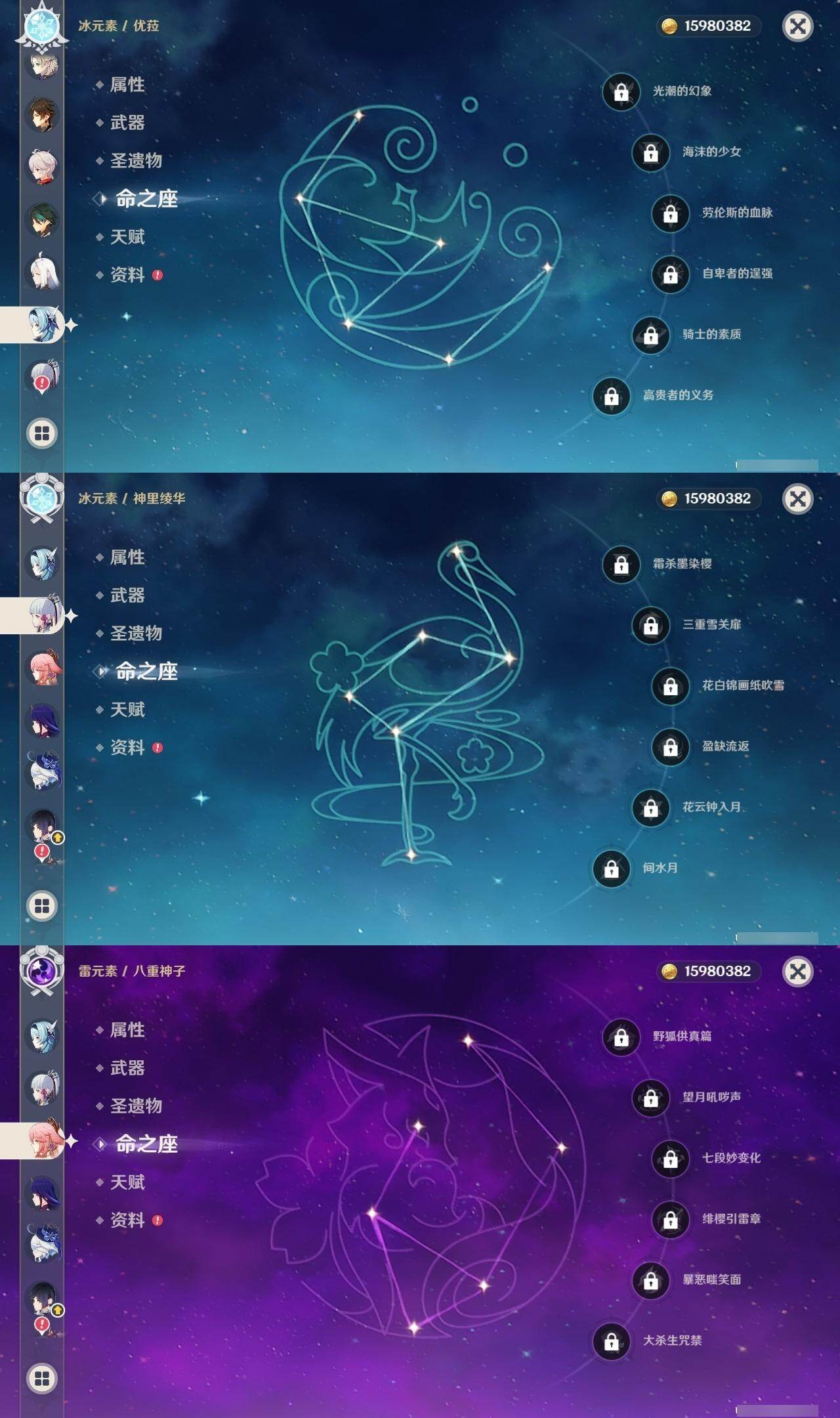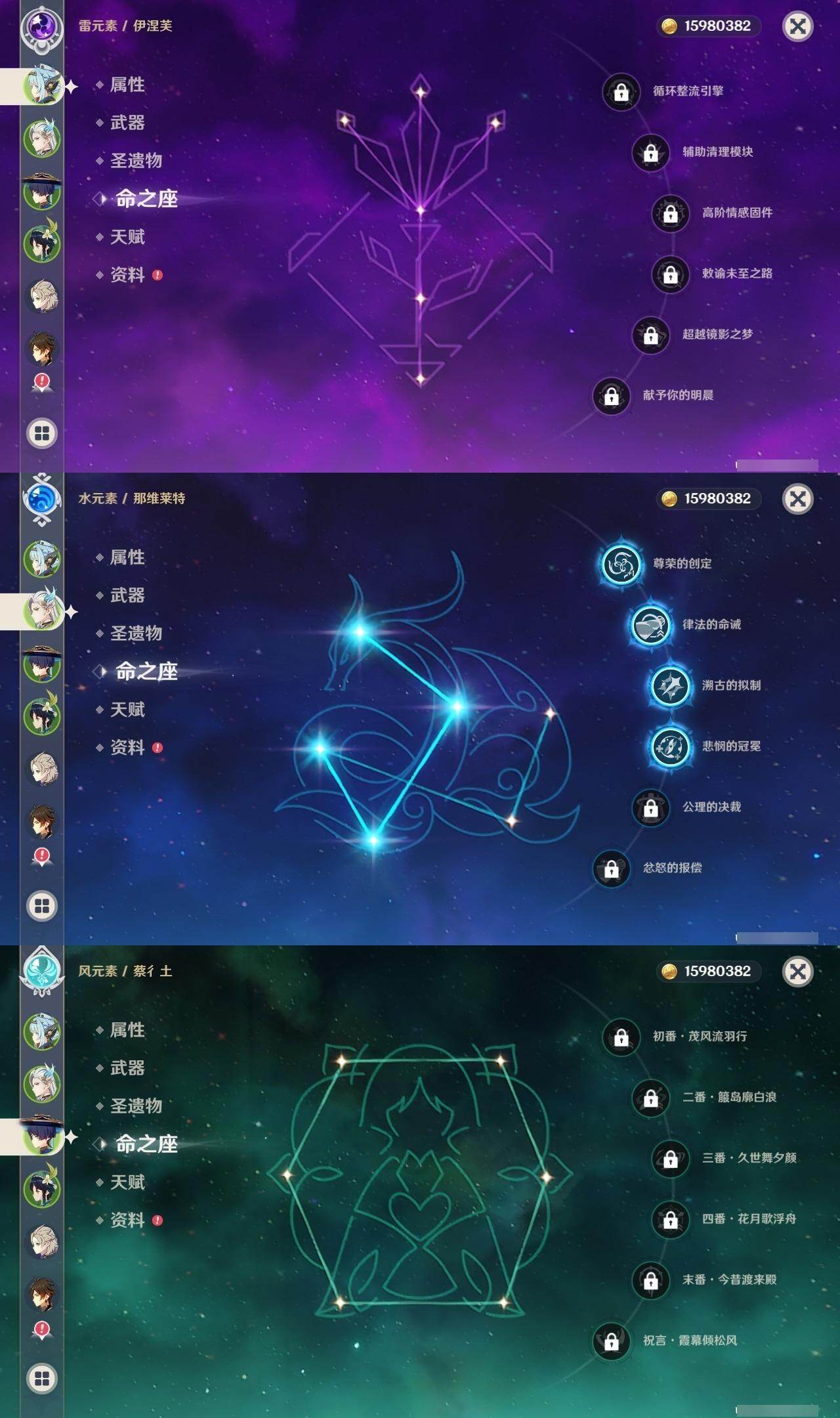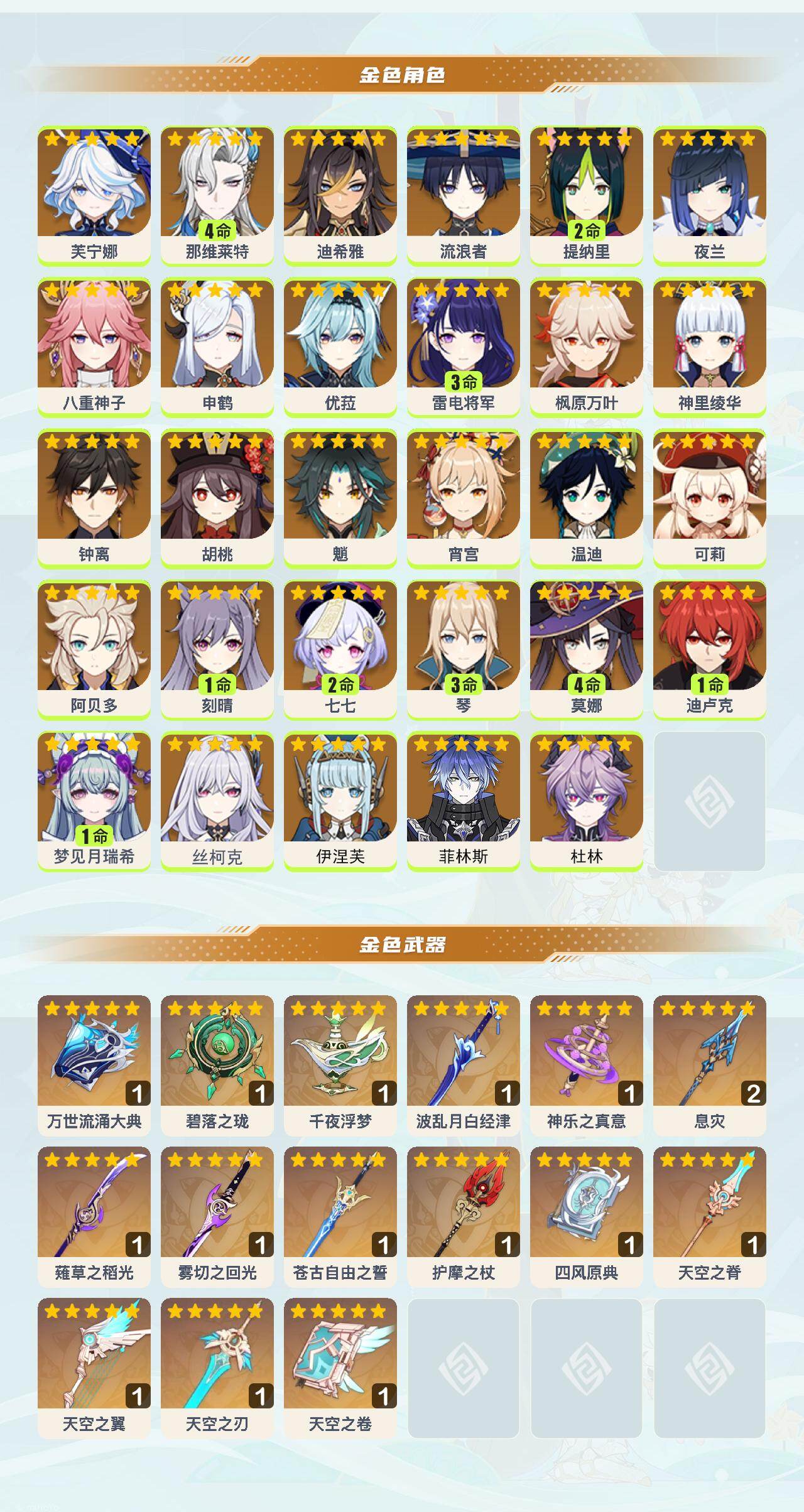 0命芙宁娜,4命那维莱特,0命迪希雅,0命流浪者,2命提纳里,0命夜兰,0命八重神子,0命申鹤,0命优菈,3命雷电将军,0命枫原万叶,0命神里绫华,0命钟离,0命胡桃,0命魈,0命宵宫,0命温迪,0命可莉,0命阿贝多,1命刻晴,2命七七,3命琴,4命莫娜,1命迪卢克,1命梦见月瑞希,0命丝柯克,0命伊涅芙,0命菲林斯,0命杜林,精1万世流涌大典,精1碧落之珑,精1千夜浮梦,精1波乱月白经津,精1神乐之真意,精2息灾,精1薙草之稻光,精1雾切之回光,精1苍古自由之誓,精1护摩之杖,精1四风原典,精1天空之脊,精1天空之翼,精1天空之刃,精1天空之卷