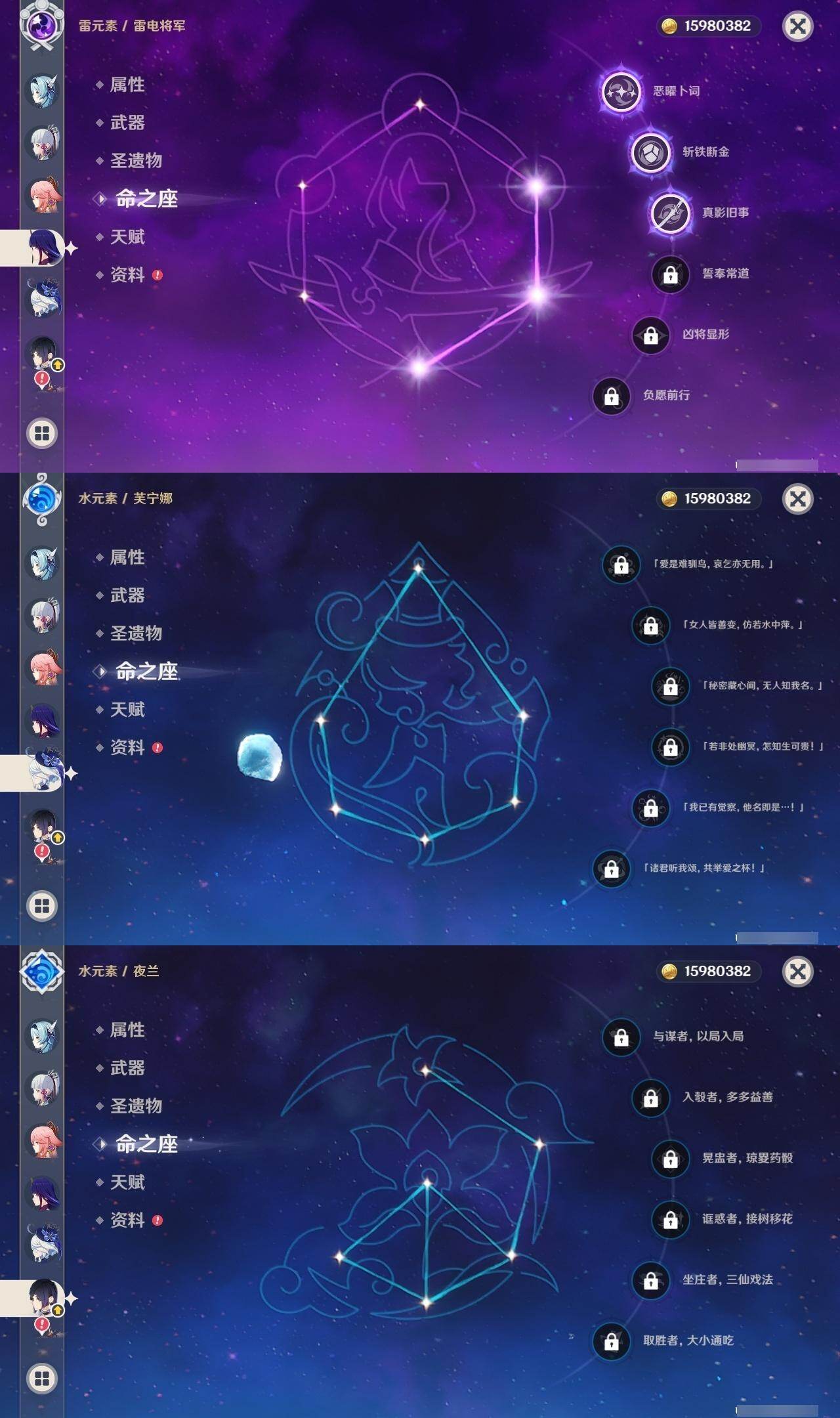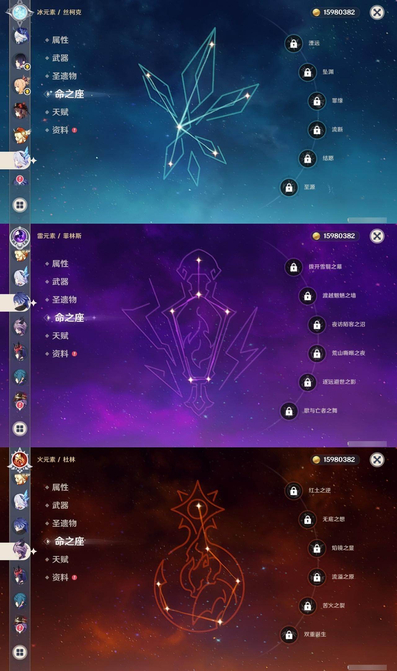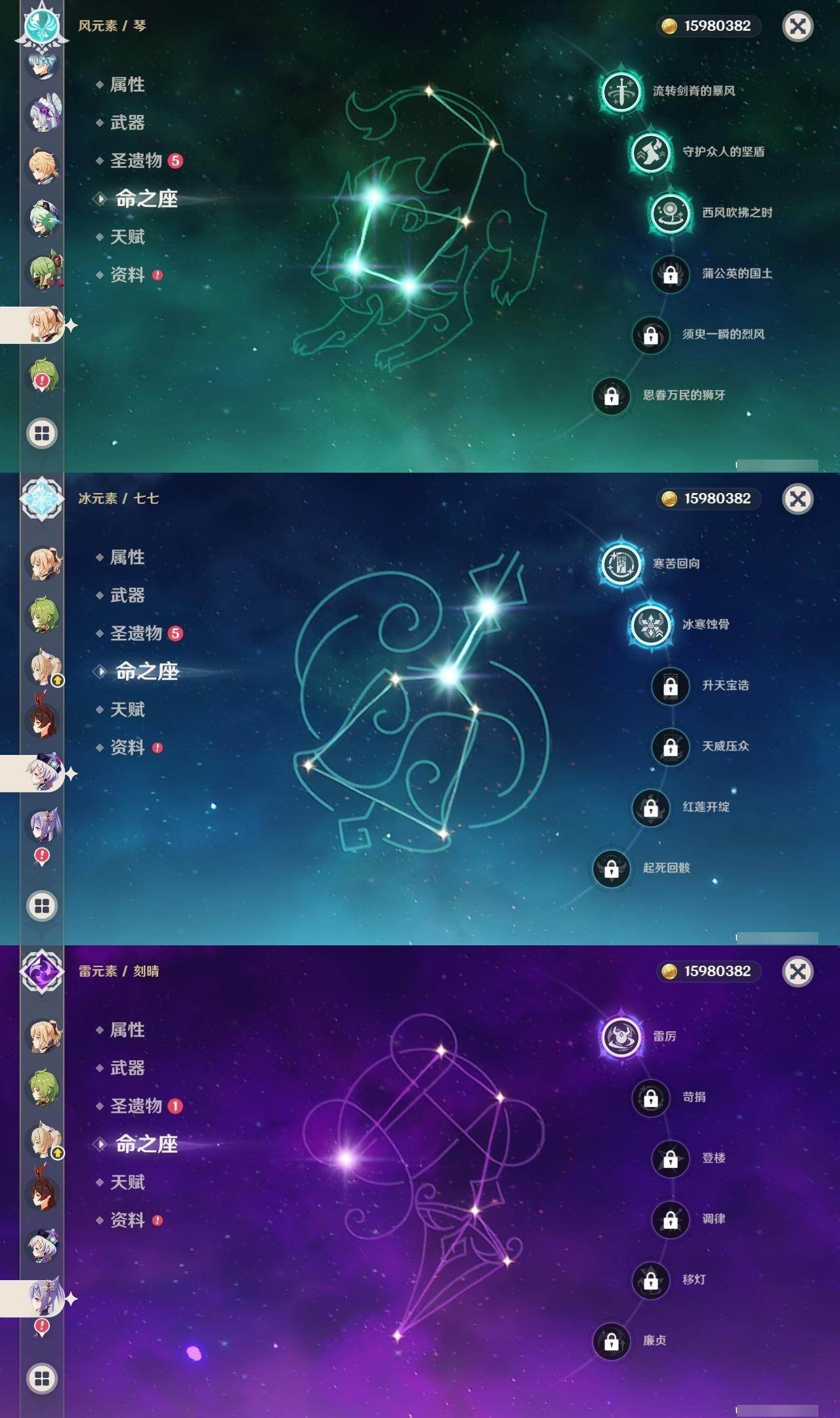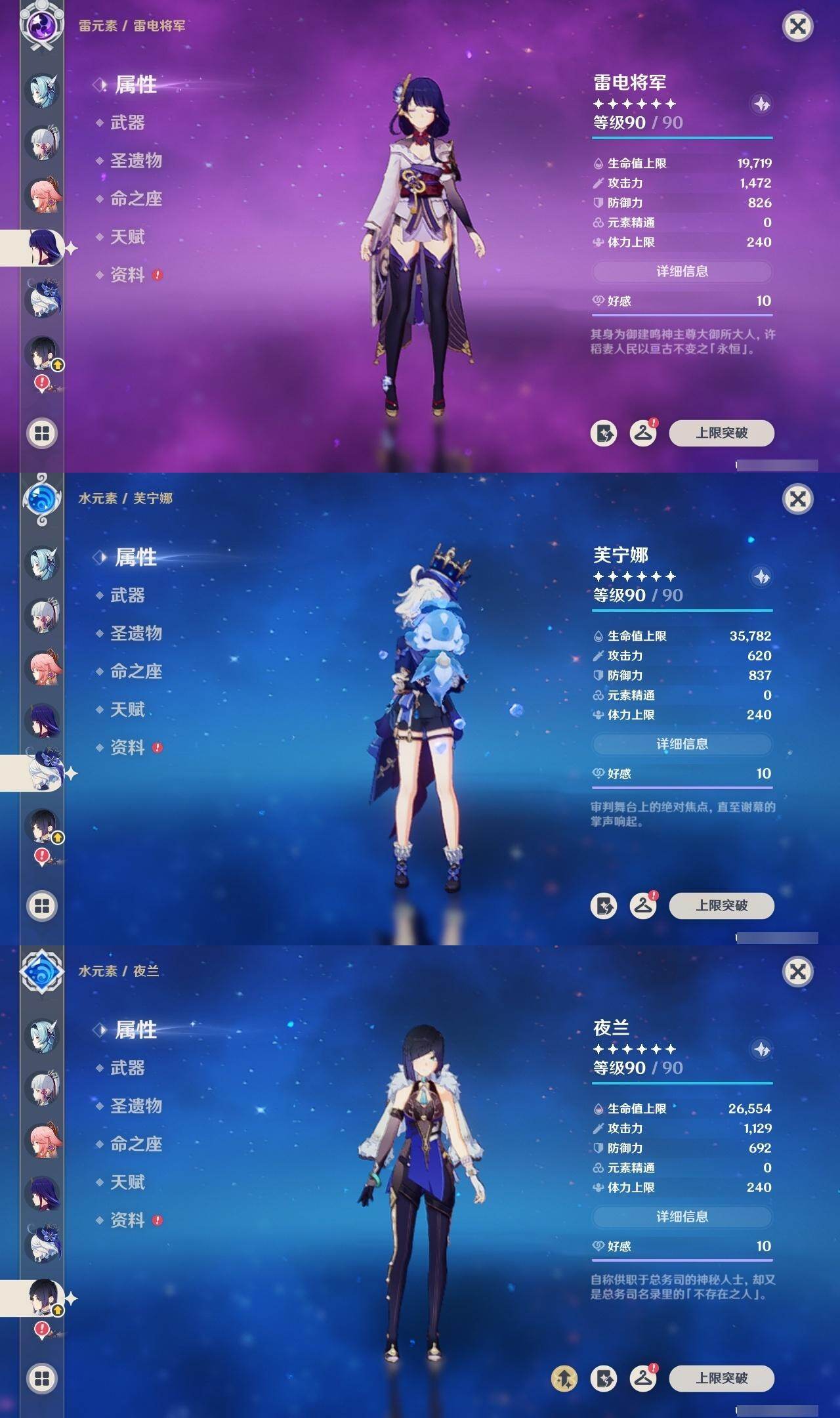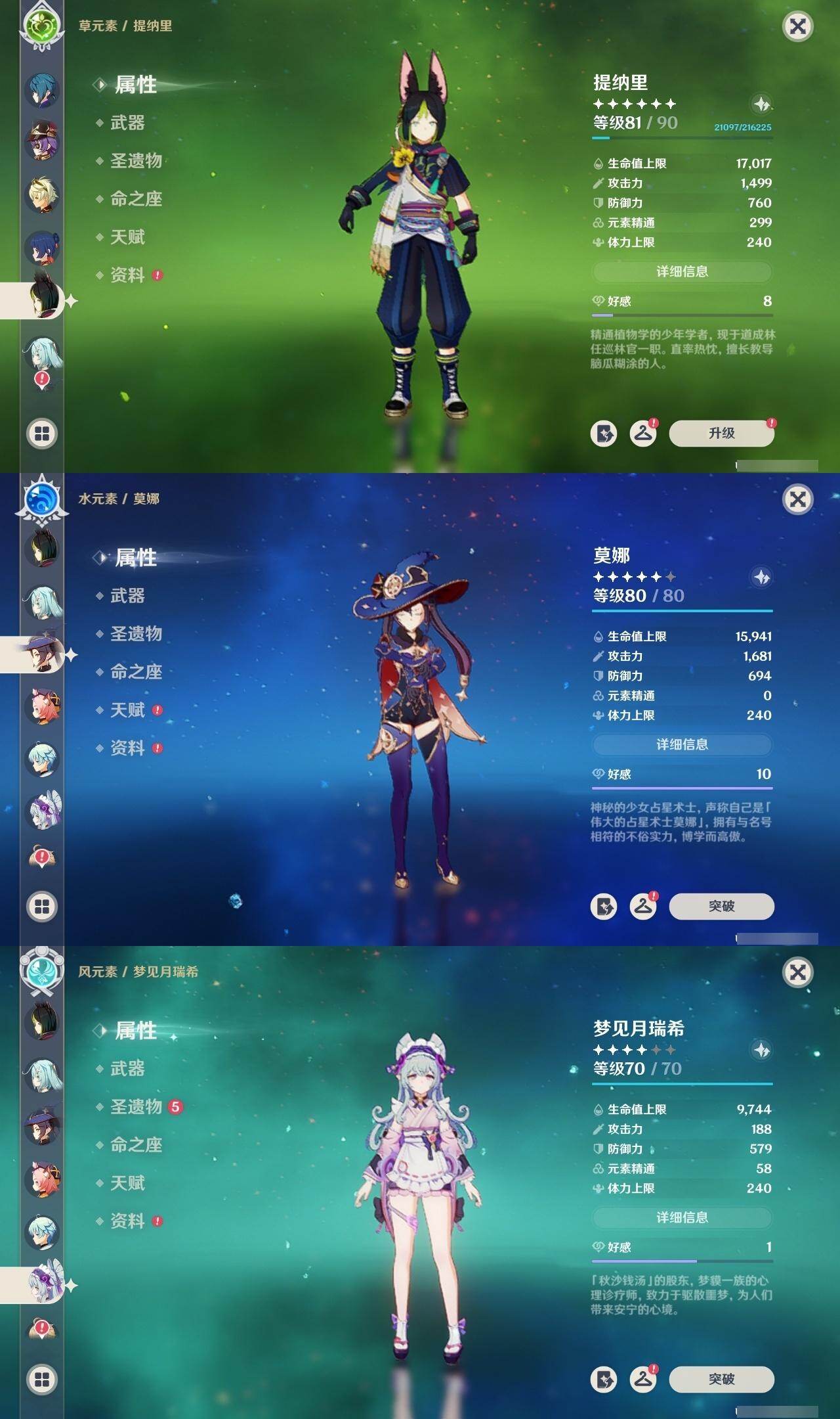 0命芙宁娜,4命那维莱特,0命迪希雅,0命流浪者,2命提纳里,0命夜兰,0命八重神子,0命申鹤,0命优菈,3命雷电将军,0命枫原万叶,0命神里绫华,0命钟离,0命胡桃,0命魈,0命宵宫,0命温迪,0命可莉,0命阿贝多,1命刻晴,2命七七,3命琴,4命莫娜,1命迪卢克,1命梦见月瑞希,0命丝柯克,0命伊涅芙,0命菲林斯,0命杜林,精1万世流涌大典,精1碧落之珑,精1千夜浮梦,精1波乱月白经津,精1神乐之真意,精2息灾,精1薙草之稻光,精1雾切之回光,精1苍古自由之誓,精1护摩之杖,精1四风原典,精1天空之脊,精1天空之翼,精1天空之刃,精1天空之卷