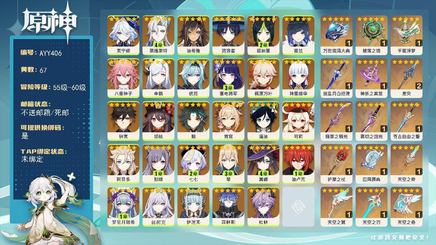 [16301746]60级/67黄/男主/29个五星角色/16个五星武器 0命芙宁娜,4命那维莱特,0命迪希雅,0命流浪者,2命提纳里,0命夜兰,0命八重神子,0命申鹤,0命优菈,3命雷电将军,0命枫原万叶,0命神里绫华,0命钟离,0命胡桃,0命魈,0命宵宫,0命温迪,0命可莉,0命阿贝多,1命刻晴,2命七七,3命琴,4命莫娜,1命迪卢克,1命梦见月瑞希,0命丝柯克,0命伊涅芙,0命菲林斯,0命杜林,精1万世流涌大典,精1碧落之珑,精1千夜浮梦,精1波乱月白经津,精1神乐之真意,精2息灾,精1薙草之稻光,精1雾切之回光,精1苍古自由之誓,精1护摩之杖,精1四风原典,精1天空之脊,精1天空之翼,精1天空之刃,精1天空之卷