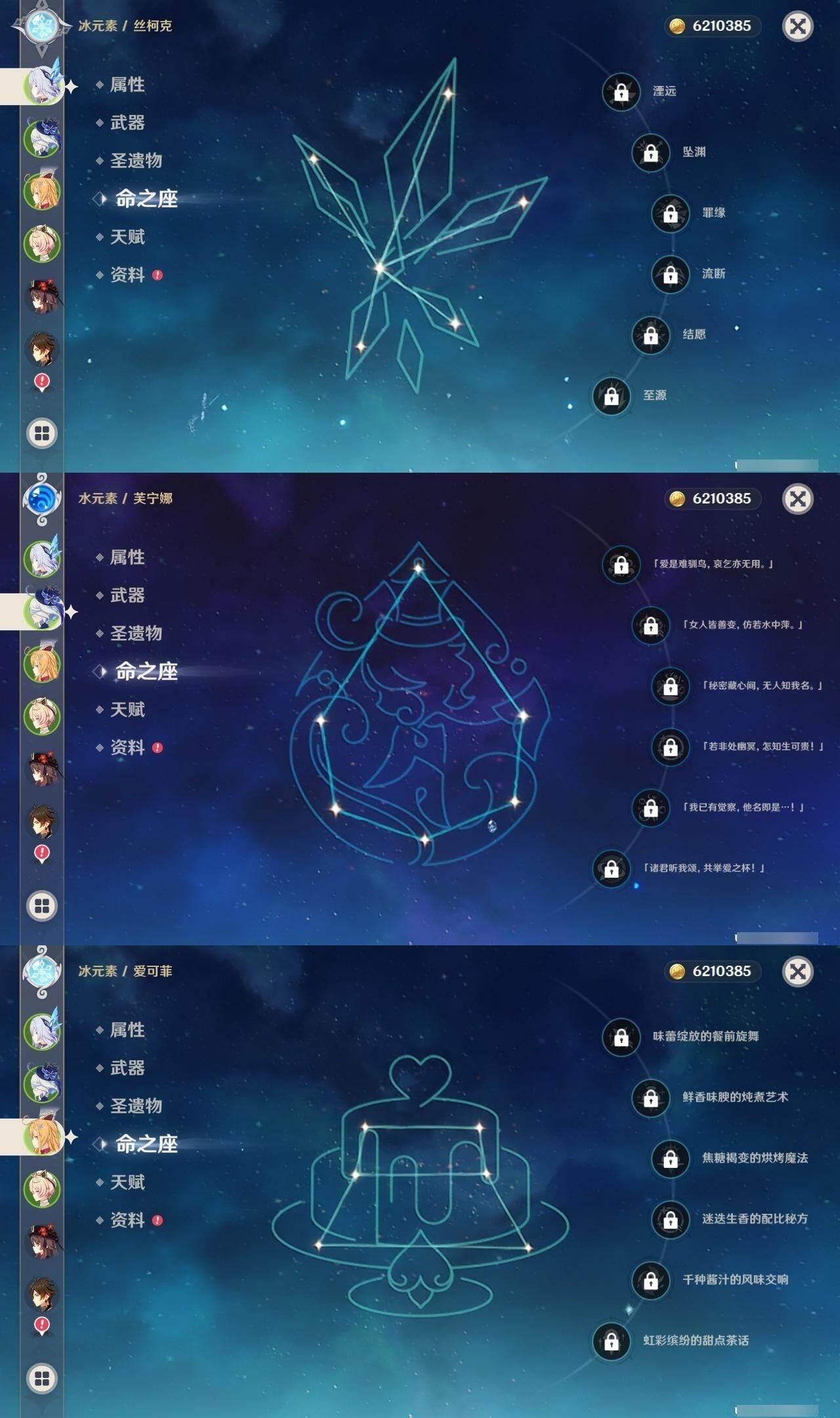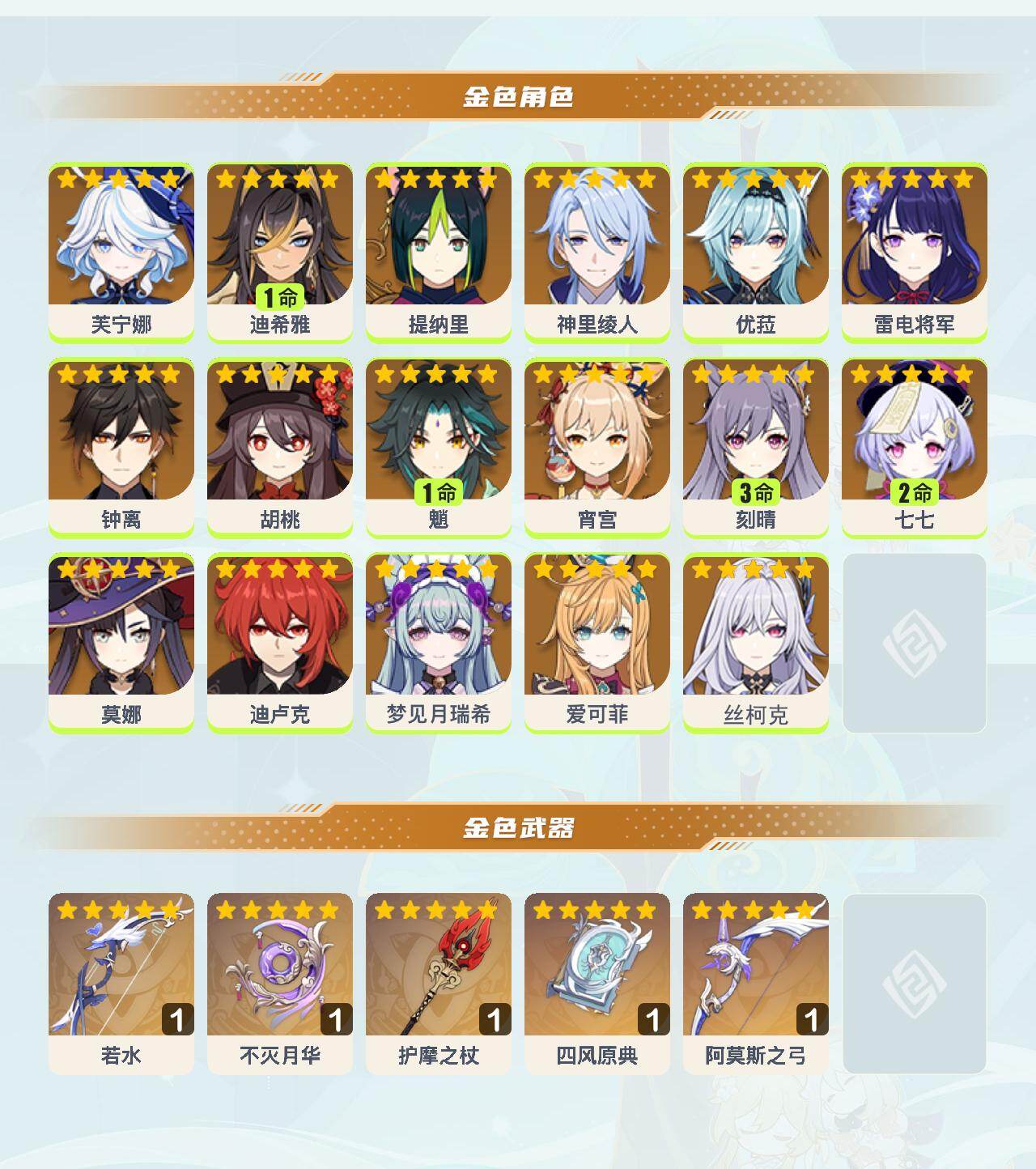 0命芙宁娜,1命迪希雅,0命提纳里,0命神里绫人,0命优菈,0命雷电将军,0命钟离,0命胡桃,1命魈,0命宵宫,3命刻晴,2命七七,0命莫娜,0命迪卢克,0命梦见月瑞希,0命爱可菲,0命丝柯克,精1若水,精1不灭月华,精1护摩之杖,精1四风原典,精1阿莫斯之弓