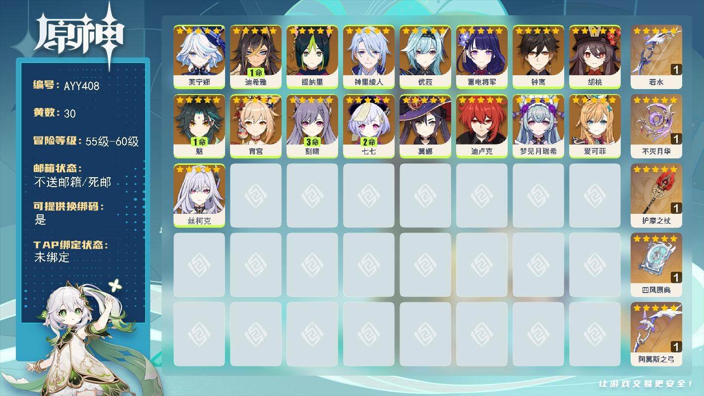 [16301754]59级/30黄/女主/17个五星角色/6个五星武器 0命芙宁娜,1命迪希雅,0命提纳里,0命神里绫人,0命优菈,0命雷电将军,0命钟离,0命胡桃,1命魈,0命宵宫,3命刻晴,2命七七,0命莫娜,0命迪卢克,0命梦见月瑞希,0命爱可菲,0命丝柯克,精1若水,精1不灭月华,精1护摩之杖,精1四风原典,精1阿莫斯之弓