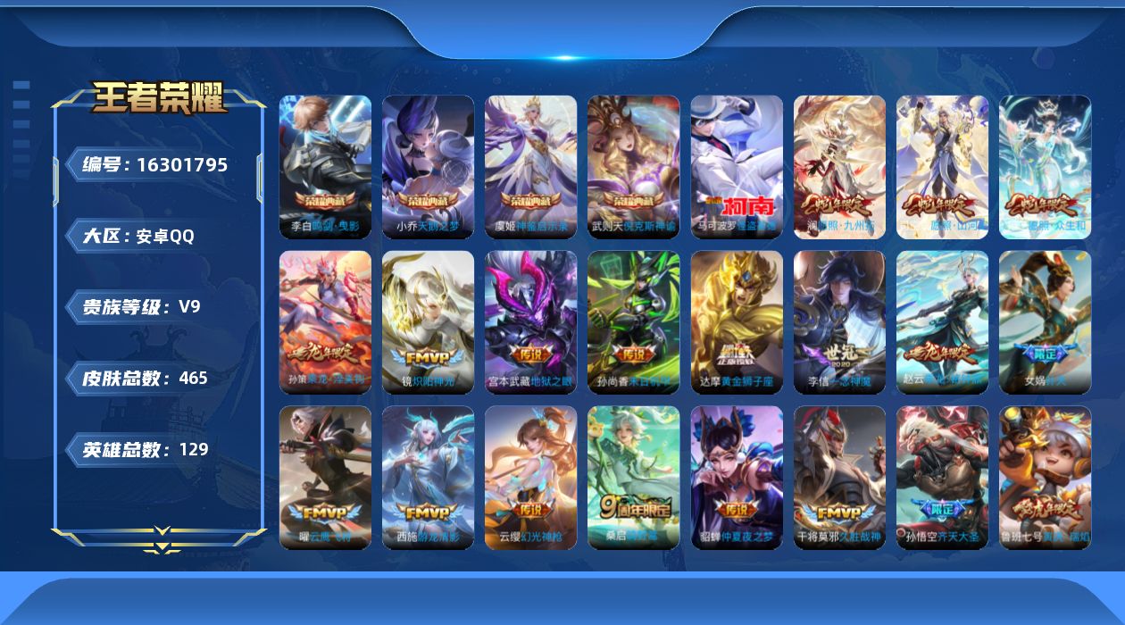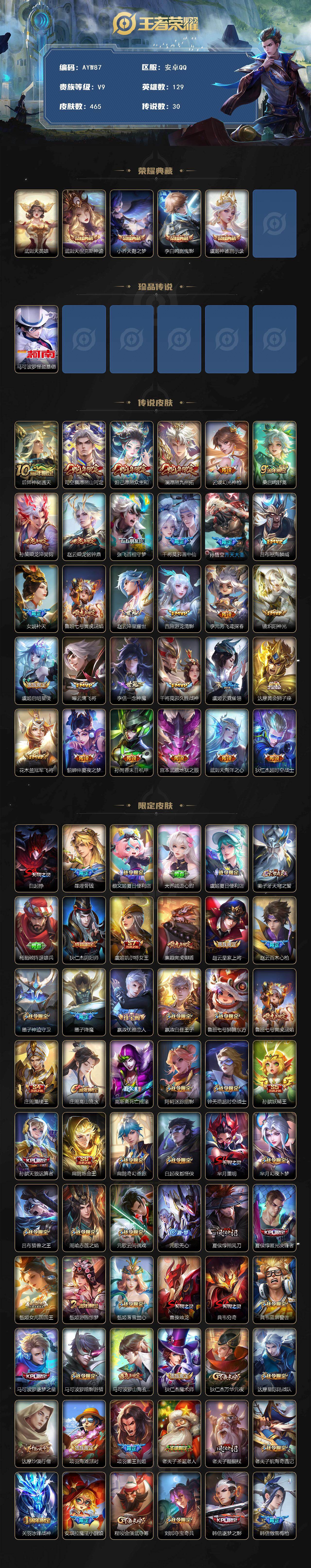 [16301795]【店主推荐捡漏号】安卓Q-V9-至尊星耀IV段位-129英雄-465皮肤-4典藏皮肤-1典藏英雄-1珍品传说-30传说-152史诗