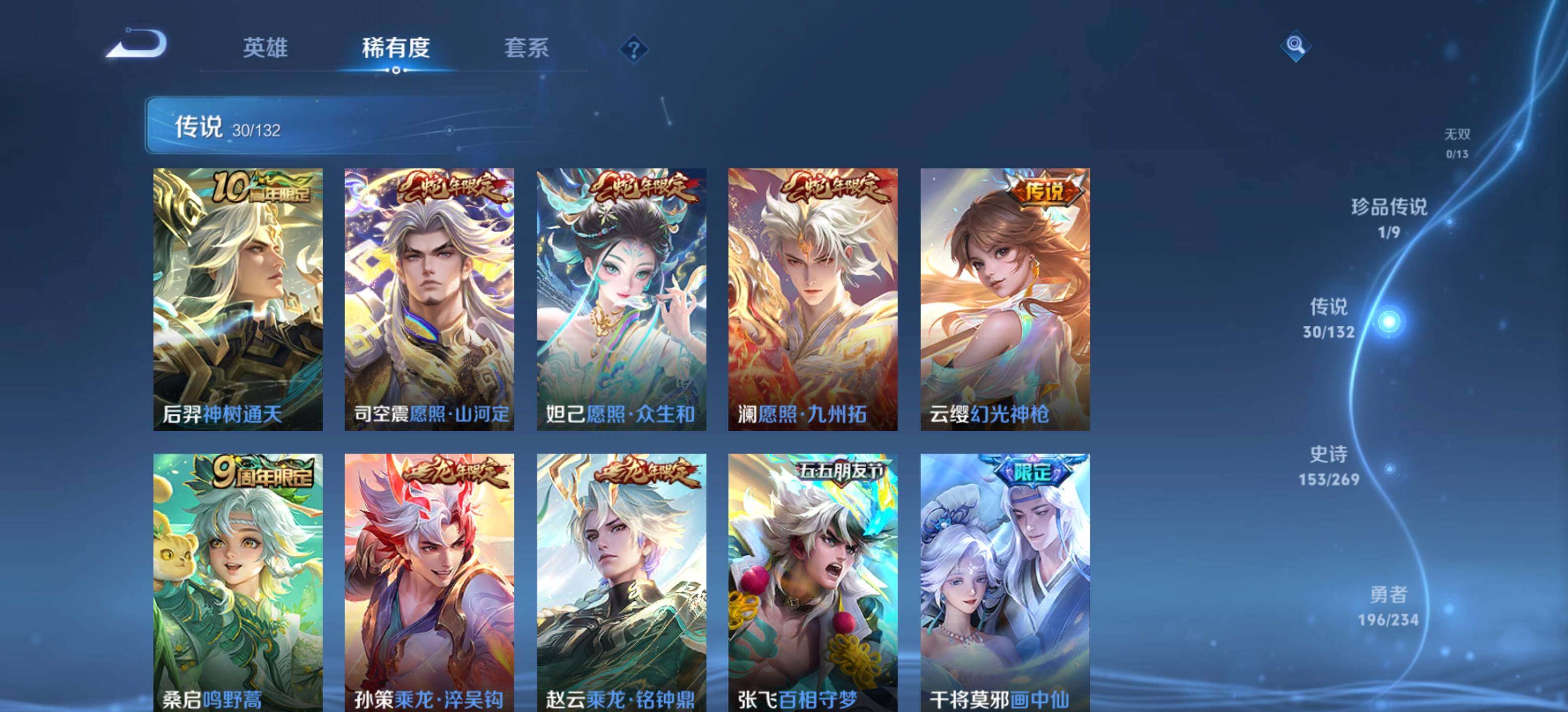 【传说皮肤】:后羿神树通天,司空震愿照山河定,妲己愿照众生和,澜愿照九州拓,云缨幻光神枪,桑启鸣野蒿,孙策乘龙淬吴钩,赵云乘龙铭钟鼎,张飞百相守梦,干将莫邪画中仙,孙悟空齐天大圣,吕布怒海麟威,女娲补天,鲁班七号寅虎瑞焰,赵云淬星耀世,西施游龙清影,李元芳飞鸢探春,镜炽阳神光,虞姬启明星使,曜云鹰飞将,李信一念神魔,干将莫邪久胜战神,虞姬云霓雀翎,达摩黄金狮子座,花木兰冠军飞将,貂蝉仲夏夜之梦,孙尚香末日机甲,宫本武藏地狱之眼,武则天海洋之心,狄仁杰超时空战士