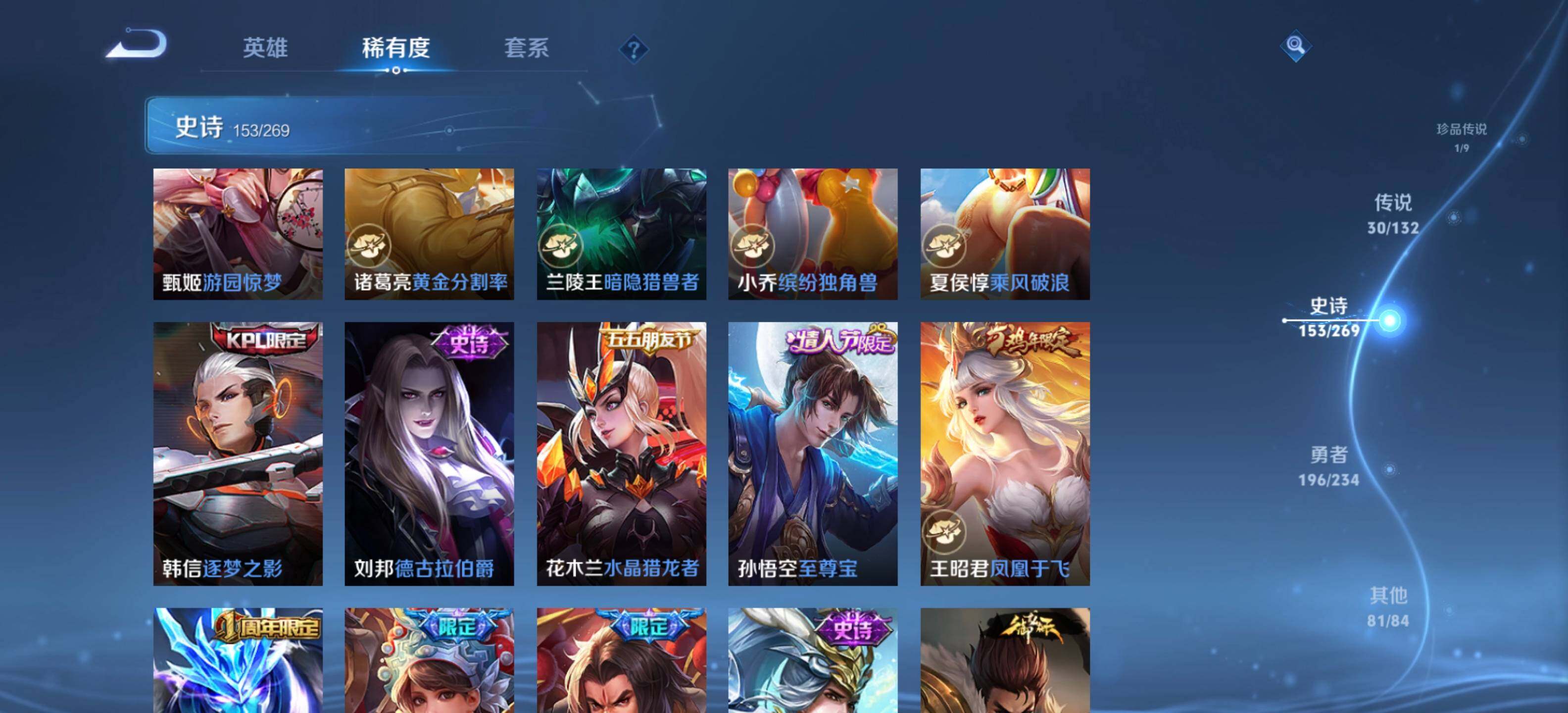 关羽冰锋战神,裴擒虎李小龙,上官婉儿梁祝,牛魔奔雷神使,后羿辉光之辰,孙膑天狼运算者,上官婉儿天狼绘梦者,伽罗天狼溯光者,马可波罗逐梦之星,韩信逐梦之影,百里守约朱雀志,王昭君凤凰于飞,项羽霸王别姬,虞姬霸王别姬,孙悟空大圣娶亲,孙悟空至尊宝,干将莫邪冰霜恋舞曲,安琪拉魔法小厨娘,猪八戒猪悟能,廉颇寅虎·御盾,老夫子圣诞老人,孙悟空孙行者,甄姬女儿国国王,镜匿光追影者,韩信傲雪梅枪,鲁班七号寅虎·瑞焰,女娲补天,赵云百木心枪,公孙离玉兔公主,夏侯惇匿光决锋者,金蝉唐三藏,鲁班大师匿光启智者,墨子降魔,马可波罗山海·玄木吟,瑶山海·碧波行,桑启鸣野蒿,澜愿照·九州拓,司空震愿照·山河定,妲己愿照·众生和