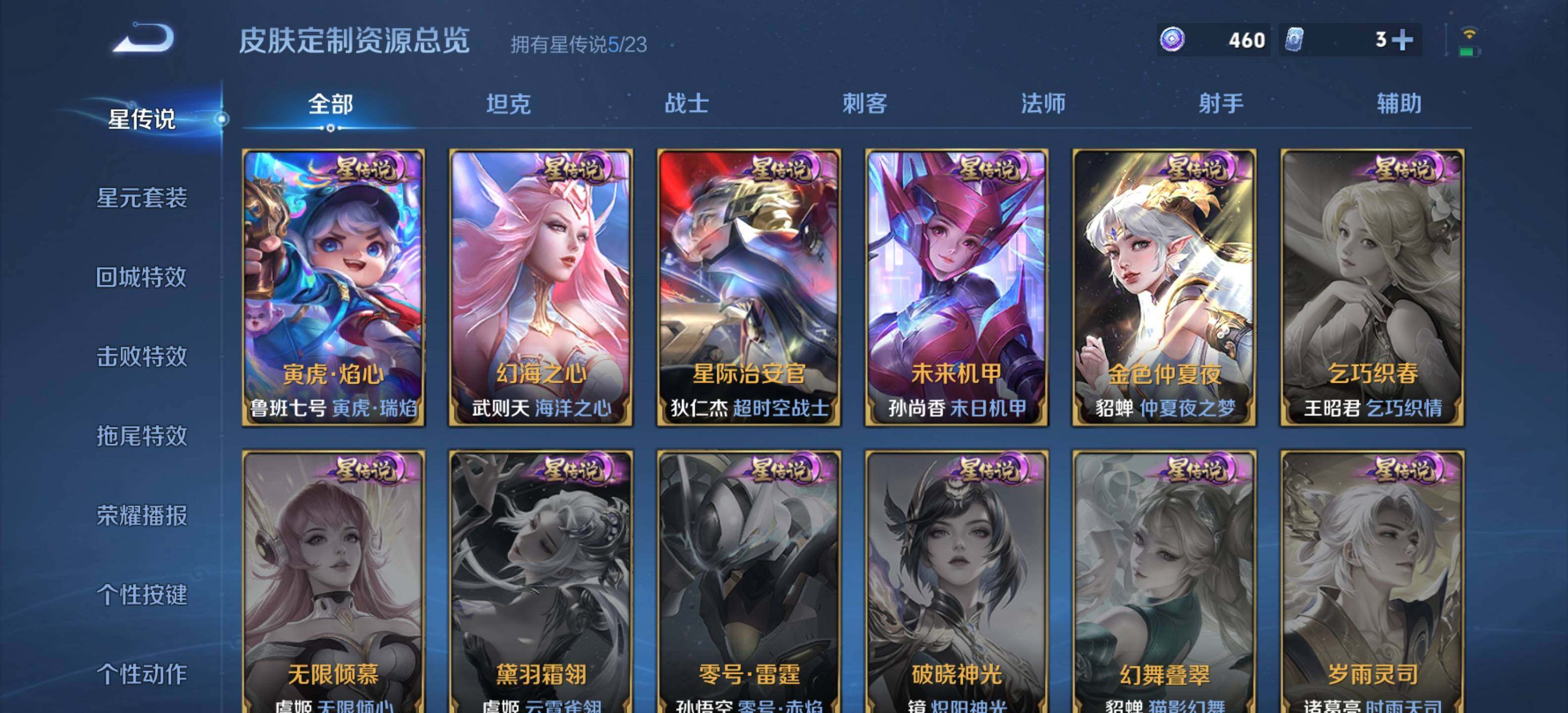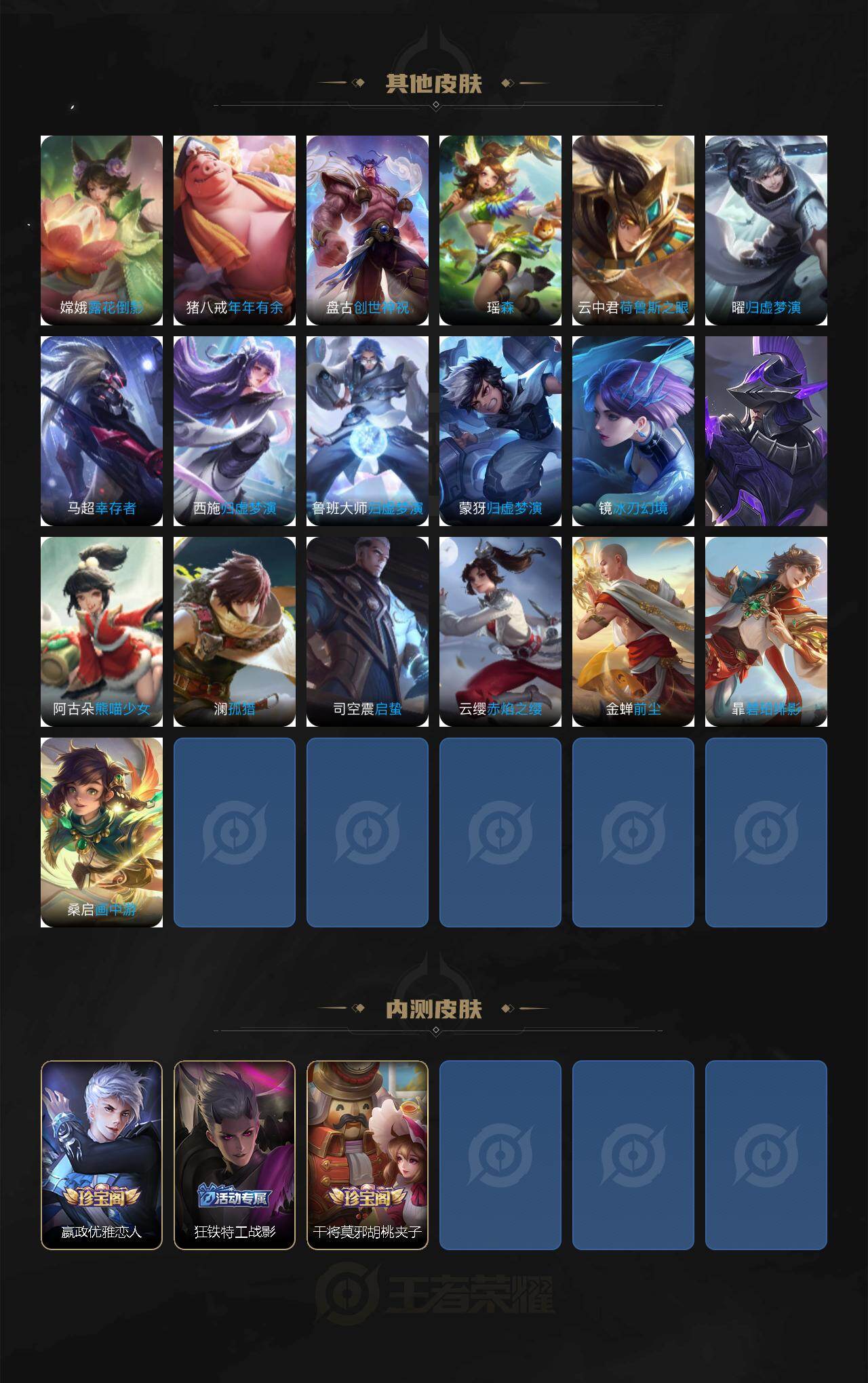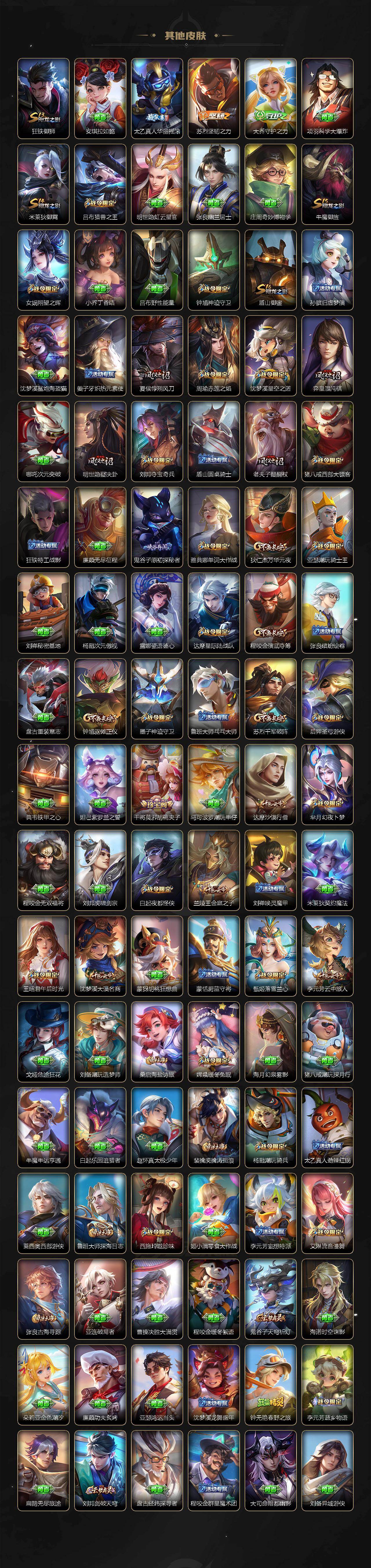 庄周蜃楼王,孙膑妖精王,扁鹊炼金王,虞姬凯尔特女王,白起狰,太乙真人饕餮,曹操烛龙,芈月重明,典韦穷奇,狂铁御狮,米莱狄御霄,牛魔御旌,盾山御銮,夏侯惇朔风刀,明世隐疑决卦,老夫子醍醐杖,鬼谷子原初探秘者,狄仁杰万华元夜,程咬金演武夺筹,钟馗驱傩正仪,苏烈千军破阵,吕布猎兽之王,嬴政白昼王子,女娲朔望之晖,典韦蓝屏警告,钟馗神迹守卫,鲁班七号狮舞东方,沈梦溪星空之诺,李元芳银河之约,刘邦夺宝奇兵,马可波罗暗影游猎,蒙犽狂想玩偶喵,元歌云间偶戏,弈星混沌棋,达摩沙漠行僧,兰陵王金庭之子,沈梦溪大漠名商,李元芳云中旅人,桑启海盐诗旅,裴擒虎擒涛扼浪,鲁班大师探海日志,张良古海寻踪