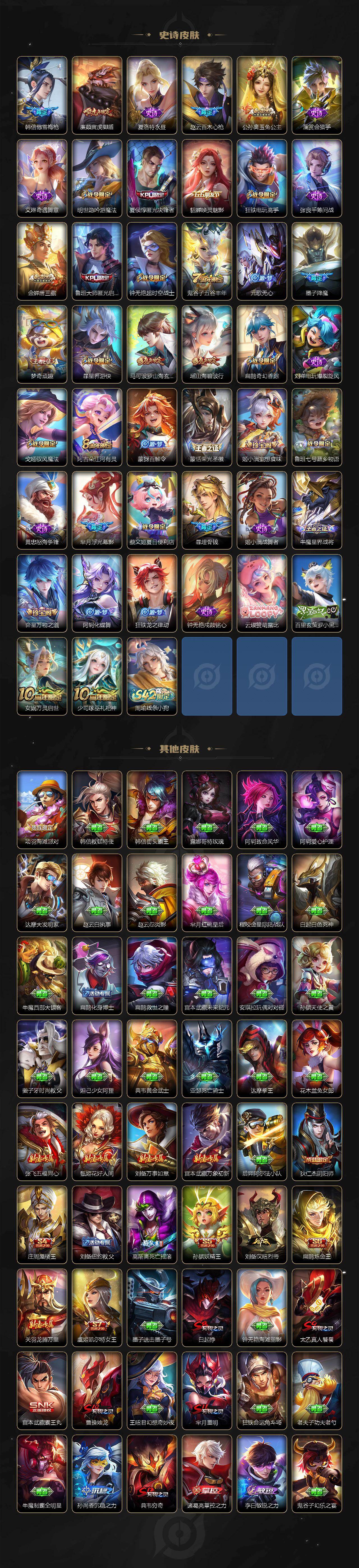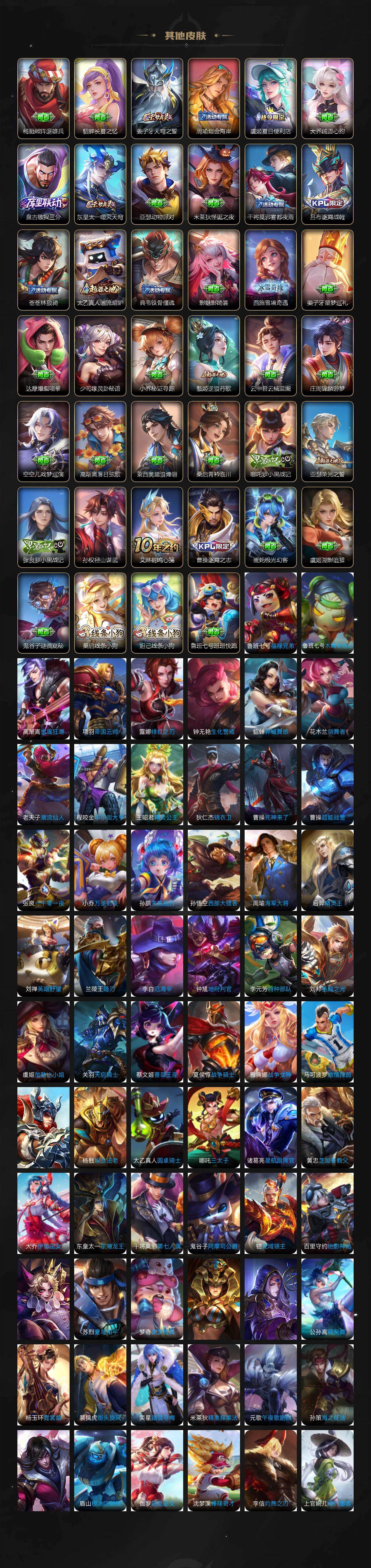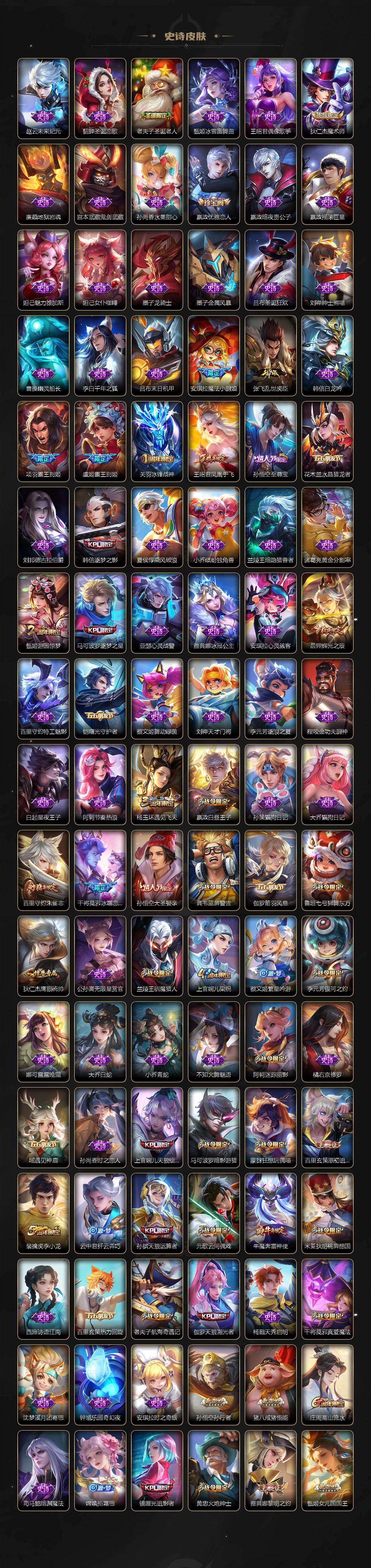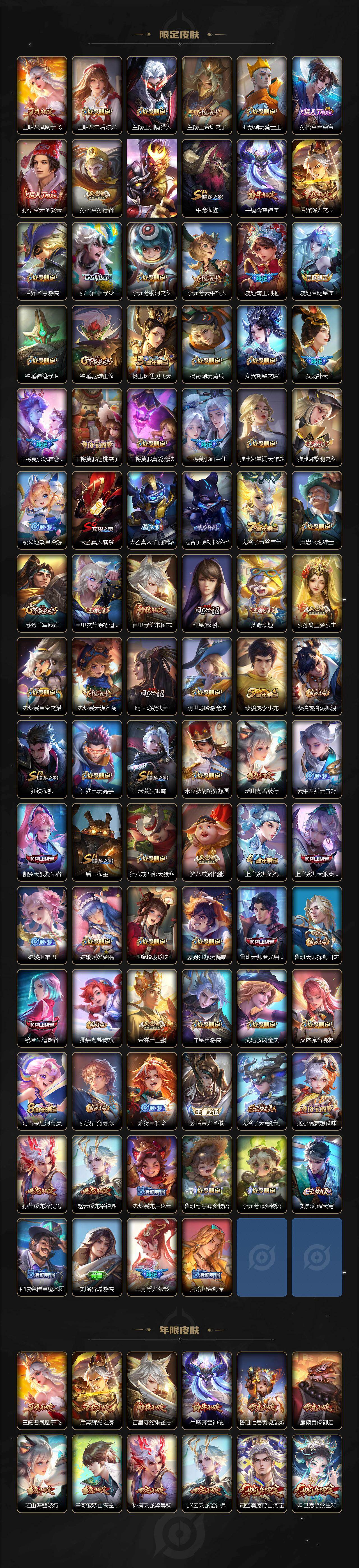 【限定皮肤】:白起狰,暃埋骨钱,蔡文姬夏日便利店,大乔绒语心约,虞姬夏日便利店,姜子牙天穹之誓,杨戬破阵退雄兵,狄仁杰阴阳师,虞姬凯尔特女王,廉颇寅虎御盾,赵云皇家上将,赵云百木心枪,墨子神迹守卫,墨子降魔,嬴政优雅恋人,嬴政白昼王子,鲁班七号狮舞东方,鲁班七号寅虎瑞焰,庄周蜃楼王,庄周高山流水,高渐离死亡摇滚,阿轲迷踪丽影,钟无艳超时空战士,孙膑妖精王,孙膑天狼运算者,扁鹊炼金王,扁鹊奇幻香踪,白起夜都怪侠,芈月重明,芈月幻夜卜梦,吕布猎兽之王,周瑜赤莲之焰,元歌云间偶戏,元歌无心,夏侯惇朔风刀,夏侯惇匿光决锋者,甄姬女儿国国王,甄姬游园惊梦,甄姬落雪兰心,曹操烛龙,典韦穷奇,典韦蓝屏警告,马可波罗逐梦之星,马可波罗暗影游猎,马可波罗山海玄木吟,狄仁杰魔术师,狄仁杰万华元夜,达摩星际陆战队,达摩沙漠行僧,项羽海滩派对,项羽霸王别姬,老夫子圣诞老人,老夫子醍醐杖,老夫子航海奇遇记,关羽冰锋战神,安琪拉魔法小厨娘,程咬金演武夺筹,刘邦夺宝奇兵,韩信逐梦之影,韩信傲雪梅枪,王昭君凤凰于飞,王昭君午后时光,兰陵王驯魔猎人,兰陵王金庭之子,亚瑟潮玩骑士王,孙悟空至尊宝,孙悟空大圣娶亲,孙悟空孙行者,孙悟空齐天大圣,牛魔御旌,牛魔奔雷神使,后羿辉光之辰,后羿圣弓游侠,张飞百相守梦,李元芳银河之约,李元芳云中旅人,虞姬霸王别姬,虞姬启明星使