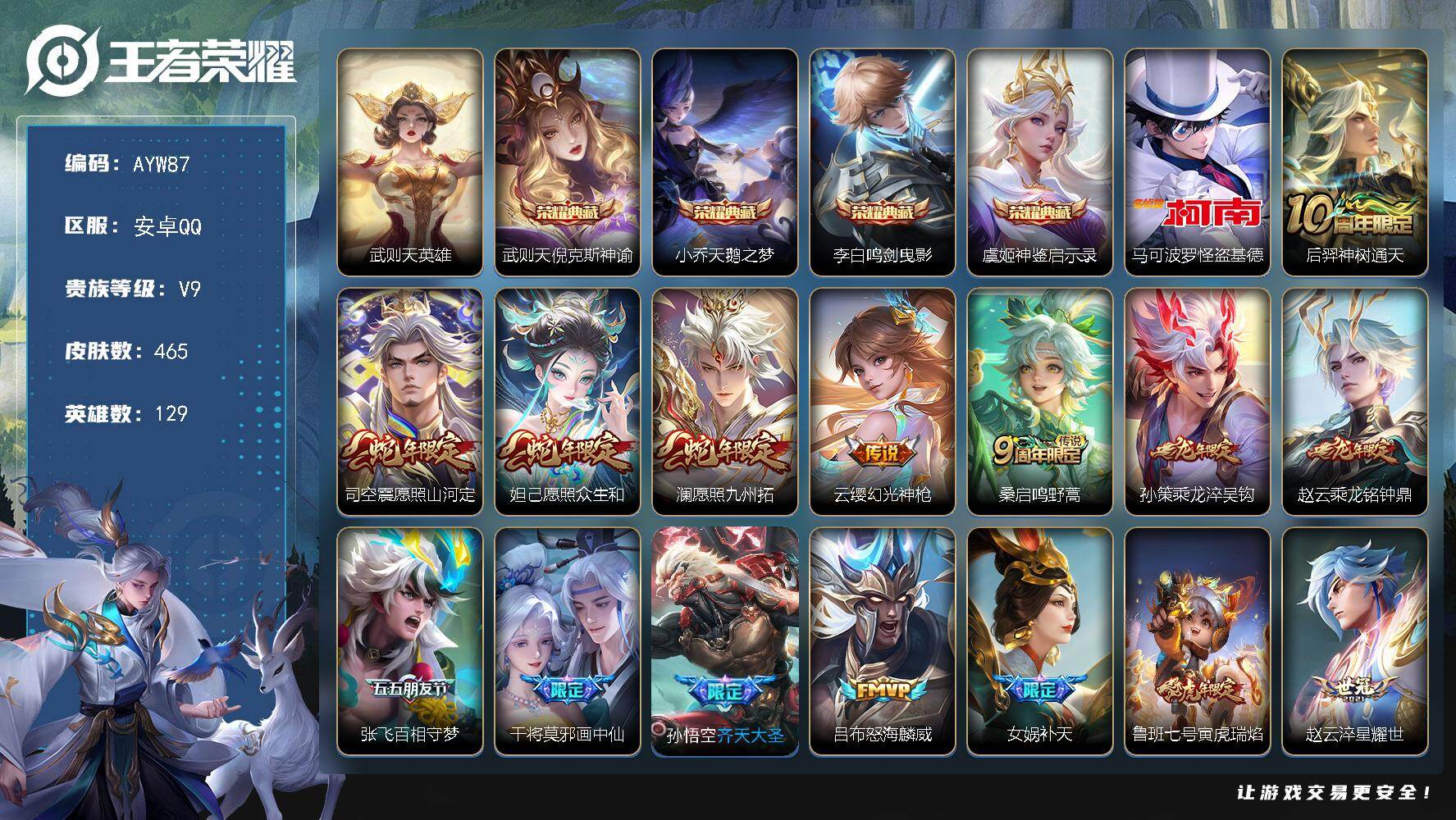 [16301795]【店主推荐捡漏号】安卓Q-V9-至尊星耀IV段位-129英雄-465皮肤-4典藏皮肤-1典藏英雄-1珍品传说-30传说-152史诗 【英雄全皮】:阿轲全皮,达摩全皮,刘邦全皮,孙权全皮,太乙真人全皮,狂铁全皮,猪八戒全皮,鲁班大师全皮,金蝉全皮,空空儿全皮,影全皮 【荣耀典藏】:武则天英雄,武则天倪克斯神谕,小乔天鹅之梦,李白鸣剑曳影,虞姬神鉴启示录 【珍品传说】:马可波罗怪盗基德 【传说皮肤】:后羿神树通天,司空震愿照山河定,妲己愿照众生和,澜愿照九州拓,云缨幻光神枪,桑启鸣野蒿,孙策乘龙淬吴钩,赵云乘龙铭钟鼎,张飞百相守梦,干将莫邪画中仙,孙悟空齐天大圣,吕布怒海麟威,女娲补天,鲁班七号寅虎瑞焰,赵云淬星耀世,西施游龙清影,李元芳飞鸢探春,镜炽阳神光,虞姬启明星使,曜云鹰飞将,李信一念神魔,干将莫邪久胜战神,虞姬云霓雀翎,达摩黄金狮子座,花木兰冠军飞将,貂蝉仲夏夜之梦,孙尚香末日机甲,宫本武藏地狱之眼,武则天海洋之心,狄仁杰超时空战士 【限定皮肤】:白起狰,暃埋骨钱,蔡文姬夏日便利店,大乔绒语心约,虞姬夏日便利店,姜子牙天穹之誓,杨戬破阵退雄兵,狄仁杰阴阳师,虞姬凯尔特女王,廉颇寅虎御盾,赵云皇家上将,赵云百木心枪,墨子神迹守卫,墨子降魔,嬴政优雅恋人,嬴政白昼王子,鲁班七号狮舞东方,鲁班七号寅虎瑞焰,庄周蜃楼王,庄周高山流水,高渐离死亡摇滚,阿轲迷踪丽影,钟无艳超时空战士,孙膑妖精王,孙膑天狼运算者,扁鹊炼金王,扁鹊奇幻香踪,白起夜都怪侠,芈月重明,芈月幻夜卜梦,吕布猎兽之王,周瑜赤莲之焰,元歌云间偶戏,元歌无心,夏侯惇朔风刀,夏侯惇匿光决锋者,甄姬女儿国国王,甄姬游园惊梦,甄姬落雪兰心,曹操烛龙,典韦穷奇,典韦蓝屏警告,马可波罗逐梦之星,马可波罗暗影游猎,马可波罗山海玄木吟,狄仁杰魔术师,狄仁杰万华元夜,达摩星际陆战队,达摩沙漠行僧,项羽海滩派对,项羽霸王别姬,老夫子圣诞老人,老夫子醍醐杖,老夫子航海奇遇记,关羽冰锋战神,安琪拉魔法小厨娘,程咬金演武夺筹,刘邦夺宝奇兵,韩信逐梦之影,韩信傲雪梅枪,王昭君凤凰于飞,王昭君午后时光,兰陵王驯魔猎人,兰陵王金庭之子,亚瑟潮玩骑士王,孙悟空至尊宝,孙悟空大圣娶亲,孙悟空孙行者,孙悟空齐天大圣,牛魔御旌,牛魔奔雷神使,后羿辉光之辰,后羿圣弓游侠,张飞百相守梦,李元芳银河之约,李元芳云中旅人,虞姬霸王别姬,虞姬启明星使