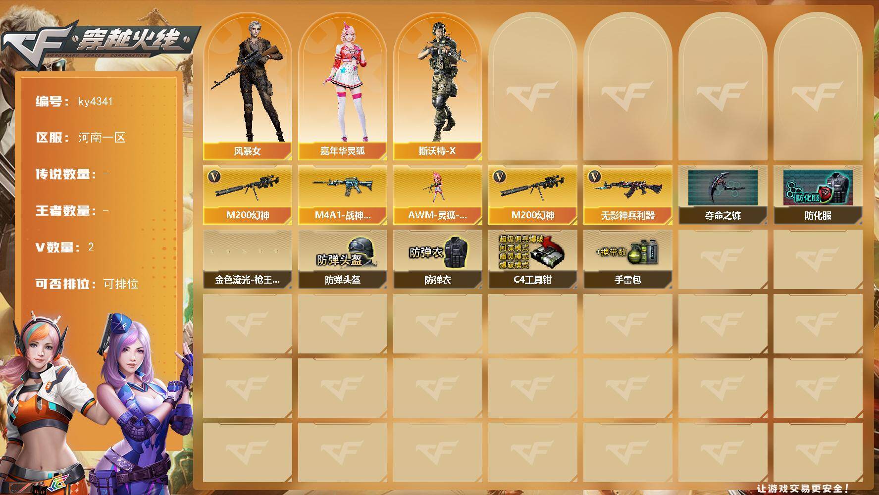 [16062726]河南一区-2V-0王者-0炫金 【热门武器】:M200-幻神 【皮肤】:M4A1-战神赵云 【角色】:风暴女,嘉年华灵狐,斯沃特-X 【人偶武器】:AWM-灵狐-15周年嘉年华 【英雄级武器】:无影-神兵利器,M200-幻神 【道具】:夺命之镰,防化服,金色流光-枪王排位*2,防弹头盔*3,防弹衣*3,C4工具钳*3,手雷包*3 【特殊枪械】: