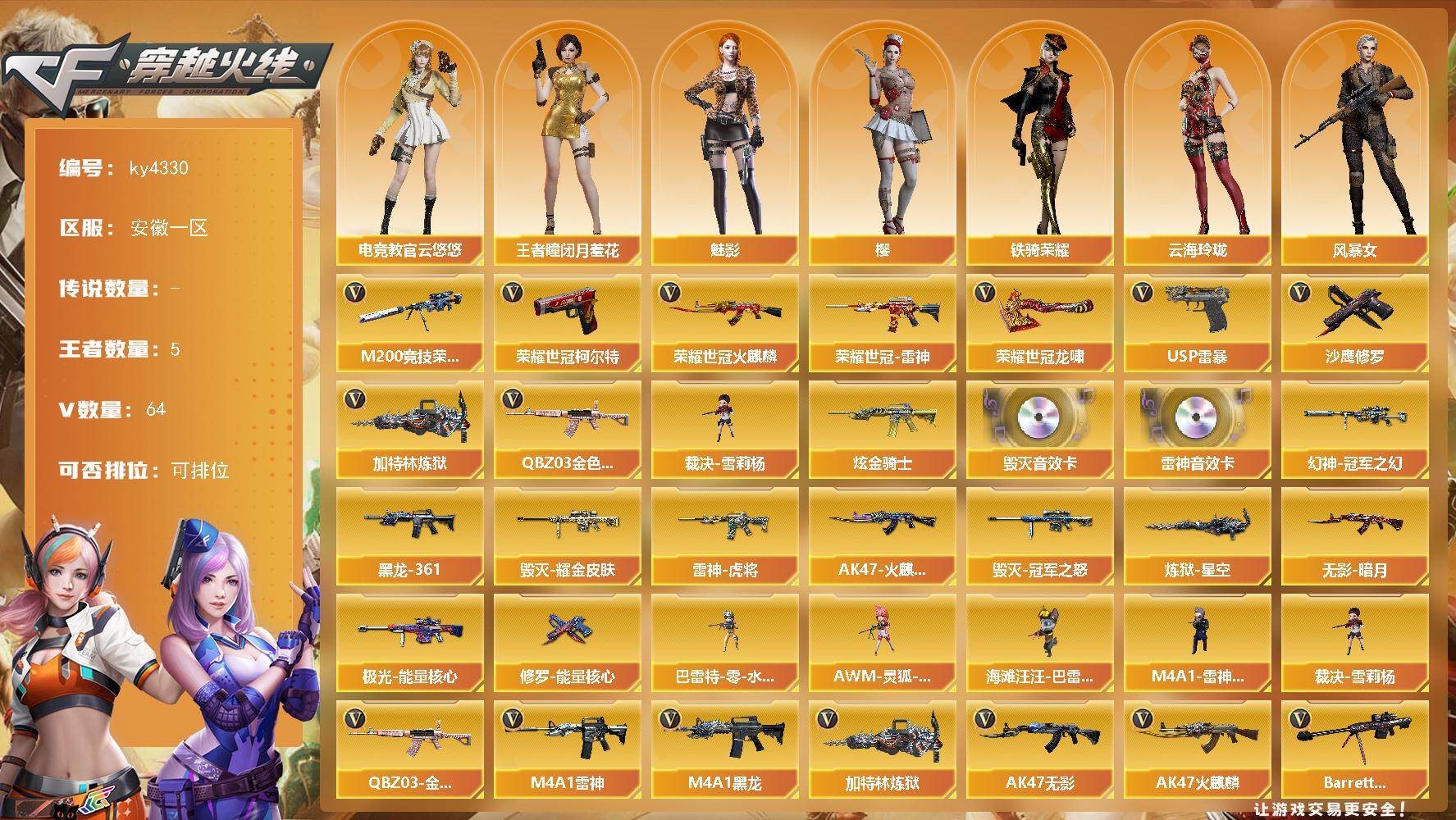 [16062654]安徽一区-64V-5王者-1炫金 【热门武器】:QBZ03-金色蔷薇,M200-竞技荣光*2,荣耀世冠-火麒麟,荣耀世冠-雷神,荣耀世冠-柯尔特,加特林-炼狱,裁决-雪莉杨,USP-雷暴,沙鹰-修罗,荣耀世冠-龙啸 【王者炫金武器】:炫金骑士 【音效卡】:M4A1-雷神音效卡,Barrett-毁灭音效卡 【皮肤】:幻神-冠军之幻,雷神-虎将,AK47-火麒麟-传奇EVEN,毁灭耀金皮肤,毁灭-冠军之怒,M4A1-黑龙-361,无影-暗月,极光-能量核心,炼狱-星空,修罗-能量核心 【角色】:樱,魅影,电竞教官-云悠悠,王者-瞳-闭月羞花,云海玲珑,风暴女,嘉年华灵狐,灵狐者-黄金海岸,铁骑荣耀,樱-缤纷夏日,影武者-X 【人偶武器】:裁决-雪莉杨,M4A1-雷神-精英刀锋,巴雷特-零-水下丽影,AWM-灵狐-15周年嘉年华,海滩汪汪-巴雷特 【英雄级武器】:AK47-火麒麟,M4A1-黑龙,M4A1-雷神*3,AK47-无影,QBZ03-金色蔷薇,王者之心-觉醒版,王者之武-觉醒版,AK-47-猩红传说,荣耀世冠-火麒麟,荣耀世冠-雷神,Barrett-毁灭,Barrett-极光,AWM-裁决,M200-竞技荣光*2,加特林-炼狱,AA-12-雷霆*2,沙鹰-修罗,USP-雷暴,荣耀世冠-柯尔特,柯尔特-竞技荣光,王者之灵-觉醒版*2,屠龙*3,麒麟刺-堕天神,擎天,擎天-竞技荣光*2,荣耀世冠-龙啸,龙啸-堕天神,高爆手雷-堕天神*3,高爆手雷-竞技荣光*7,闪光弹-堕天神*3,闪光弹-竞技荣光*7,烟雾弹-堕天神*3,烟雾弹-竞技荣光*7 【道具】:超级背包,绿色巨人,灵魂忍者,迷雾幽灵,生化弹匣,夺命之镰,防化服*2,金色流光-枪王排位*2,星辰流光-枪王排位,枪王排位28赛季金色流光,防弹头盔*2,防弹衣*2,C4工具钳*2,手雷包*2 【特殊枪械】:1炼狱