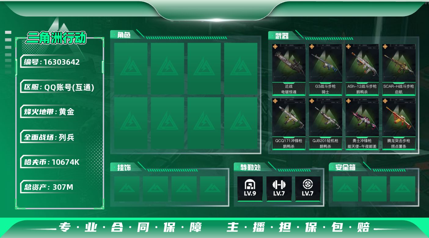 [16303642]307m总资产-10674k哈伏币-60烽火等级-黄金-10战场等级-列兵 【近战皮肤】:近战-电锯惊魂,近战-黑鹰 【传说外观】:M4A1突击步枪-阿米娅,ASh-12战斗步枪-鹅鸭杀,AK-12突击步枪-特斯拉线圈,SCAR-H战斗步枪-启航,G3战斗步枪-骑士,CAR-15突击步枪-阿米娅,腾龙突击步枪-捞点薯条,UZI冲锋枪-特斯拉线圈,SR-3M紧凑突击步枪-特斯拉线圈,勇士冲锋枪-能天使-午夜邮差,QCQ171冲锋枪-鹅鸭杀,QJB201轻机枪-鹅鸭杀,AWM狙击步枪-捞点薯条,93R-捞点薯条,复合弓-黑·天际线 【史诗外观】:MP7冲锋枪-原型机,AKM突击步枪-林中猎手,AUG突击步枪-蝮蛇,MP5冲锋枪-战术竞备,Vector冲锋枪-阿萨拉文明,SR-3M紧凑突击步枪-战术竞备,勇士冲锋枪-工业狂潮,M1014霰弹枪-林中猎手,S12K霰弹枪-曙光,M250通用机枪-囚徒,SV-98狙击步枪-林中猎手,SV-98狙击步枪-囚徒,M700狙击步枪-竞技风 【稀有外观】:P90冲锋枪-星之彩,沙漠之鹰-天际线,AKM突击步枪-肃杀,QBZ95-1突击步枪-公平竞技,K416突击步枪-前沿科技,M7战斗步枪-捣蛋鬼,SCAR-H战斗步枪-荣耀列队,PTR-32突击步枪-天网,PTR-32突击步枪-英雄,腾龙突击步枪-前沿科技,K437突击步枪-生存指令,MK47突击步枪-精英联盟,MP5冲锋枪-弄臣,MP5冲锋枪-虎啸,MP5冲锋枪-哈夫克卫队,P90冲锋枪-新生,P90冲锋枪-黄昏,Vector冲锋枪-先锋,UZI冲锋枪-亚特兰蒂斯,SMG-45冲锋枪-哈夫克卫队,SMG-45-行动开启,SMG-45冲锋枪-幻影结构,SMG-45冲锋枪-天网,M1014霰弹枪-幻影结构,S12K霰弹枪-地狱黑鲨,M250通用机枪-天网,QJB201轻机枪-哈夫克卫队,Mini-14射手步枪-荣耀列队,M14射手步枪-前沿科技,SKS射手步枪-弄臣,SR-25射手步枪-开拓,SV-98狙击步枪-星链科技,SV-98狙击步枪-哈夫克航天,SV-98狙击步枪-精英联盟,G18-星链科技,G18-哈夫克航天 【普通外观】:PKM通用机枪-黄铜,R93狙击步枪-监察,M4A1突击步枪-粉色涂装,M4A1突击步枪-高雅黑,M4A1突击步枪-海色,QBZ95-1突击步枪-高雅黑