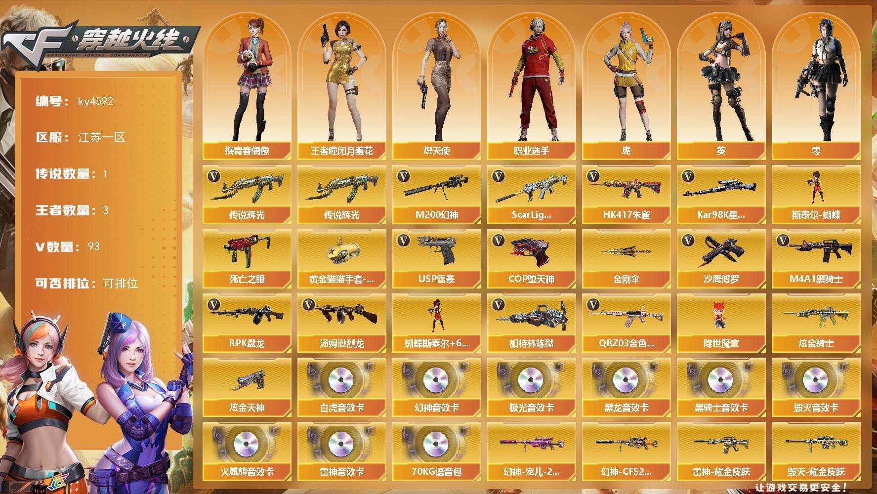[16165276]江苏一区-93V-3王者-2炫金 【传说武器】:传说辉光 【热门武器】:传说辉光,QBZ03-金色蔷薇,Scar Light-白虎,HK417-朱雀,M200-幻神*2,死亡之眼*3,Kar98K-星神,M4A1-黑骑士,汤姆逊-烈龙*7,RPK-盘龙*3,加特林-炼狱*4,斯泰尔-蝴蝶,降世魔童,USP-雷暴,COP-堕天神,沙鹰-修罗*8,黄金猫猫手套-白鲨,金刚伞 【王者炫金武器】:炫金骑士,炫金天神 【音效卡】:M200-幻神音效卡,AK47-火麒麟音效卡,M4A1-雷神音效卡,M4A1-黑龙音效卡,M4A1-黑骑士音效卡,Barrett-毁灭音效卡,Barrett-极光音效卡,Scar Light-白虎音效卡,70KG语音包 【皮肤】:幻神-AG-CFPLS17冠军,幻神-宠儿-2021MVP,幻神-CFS2022,M200-幻神-荣耀世冠白鲨,白虎-电玩粉兔皮肤,QBZ03-AG-CFPLS19冠军,星神-枪娘默 皮肤,雷神-暗月,雷神-耀金皮肤,雷神-荣耀世冠AG,雷神-机甲刑天皮肤,雷神-宇航兔皮肤,火麒麟-华夏之心,火麒麟-轻羽皮肤,火麒麟-战神关羽,火麒麟-百城,火麒麟-巅峰荣耀,毁灭耀金皮肤,毁灭-星空,毁灭-黑大圣皮肤,毁灭-神秘黑洞皮肤,M4A1-千变-孔明皮肤,黑龙-能量核心,黑龙-暗月,战神-粉色甜心皮肤,AK47-B-常胜将军-刘备*2,AWM-天龙-传奇70KG,极光-能量核心,炼狱-玩具枪皮肤,修罗-星空,屠龙-荣耀之锋,麒麟刺-萌杀皮肤 【角色】:零,葵,鹰,王者-瞳-闭月羞花,乔伊教练,云海玲珑,炽天使,空,初恋灵狐,芳心审判者,风暴女,嘉年华灵狐,零-水下丽影,灵狐者-X,灵狐者-七夕宝贝,灵狐者-职业经理,龙儿-小淘气,曼陀罗-礼服,萌儿,潘多拉-X,潘多拉-甜心教官,青霞仙子,铁骑荣耀,兔囡囡,雪莉杨-摸金校尉,夜玫瑰-幻能朋克,樱-青春偶像,樱-战斗天使,影武者-X,职业选手 【人偶武器】:M4A1-雷神-精英刀锋,斯泰尔-蝴蝶,Barrett-战龙-灵狐者,M37-葵,COP-旗袍,夺魂,迷你超能女侍,迷你巨石泰坦-魔花研究所,降世魔童 【暴走生化】:死亡之眼*3,超级对讲机 【挑战大师】:神圣爆裂者III,冰龙粉碎者-白马银枪,激光毁灭者III,阐释者III 【英雄级武器】:AK47-火麒麟,M4A1-黑龙*2,