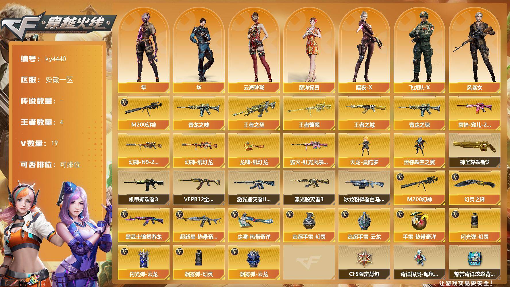 [16304897]安徽一区-19V-4王者-0炫金 【热门武器】:M200-幻神,青龙之魄 【王者炫金武器】:王者之圣,王者之城,青龙之魄,王者蔷薇 【皮肤】:M200-幻神-N9-2022MVP,幻神-纸灯龙皮肤,雷神-宠儿-2019MVP,毁灭-虹光风暴 皮肤,龙啸-纸灯龙皮肤 【角色】:隼,华,奇洋探员,云海玲珑,暗夜-X,飞虎队-X,风暴女,娟娟,曼陀罗-X,曼陀罗-礼服,潘多拉-甜心教官,潜龙队-X,兔囡囡,影武者-X,游珑儿 【人偶武器】:天龙-曼陀罗,迷你裂空之翼 【挑战大师】:神圣爆裂者III,冰龙粉碎者-白马银枪,激光毁灭者III-白马银枪,VEPR-12-金魔,激光毁灭者III,机甲撕裂者III 【英雄级武器】:黑武士-锦绣游龙,超新星-热带奇洋,M200-幻神,幻灵之锋,龙啸-热带奇洋,高爆手雷-幻灵,高爆手雷-云龙,手雷-热带奇洋,闪光弹-幻灵,闪光弹-云龙*2,烟雾弹-幻灵*2,烟雾弹-云龙,烟雾弹-荣耀世冠EP 【道具】:CFS限定背包,奇洋探员-海龟背包,热带奇洋炫彩背包,绿色巨人,灵魂忍者*2,变异宝贝,迷雾幽灵*2,生化弹匣,夺命之镰,防化服*2,金色流光-枪王排位,枪王排位28赛季金色流光,枪王排位29赛季金色流光,热带奇洋表情,斯沃特表情,EP战队名片,EP战队喷图,EP战队击杀图标,防弹头盔*3,防弹衣*3,C4工具钳*3,手雷包*3 【特殊枪械】: