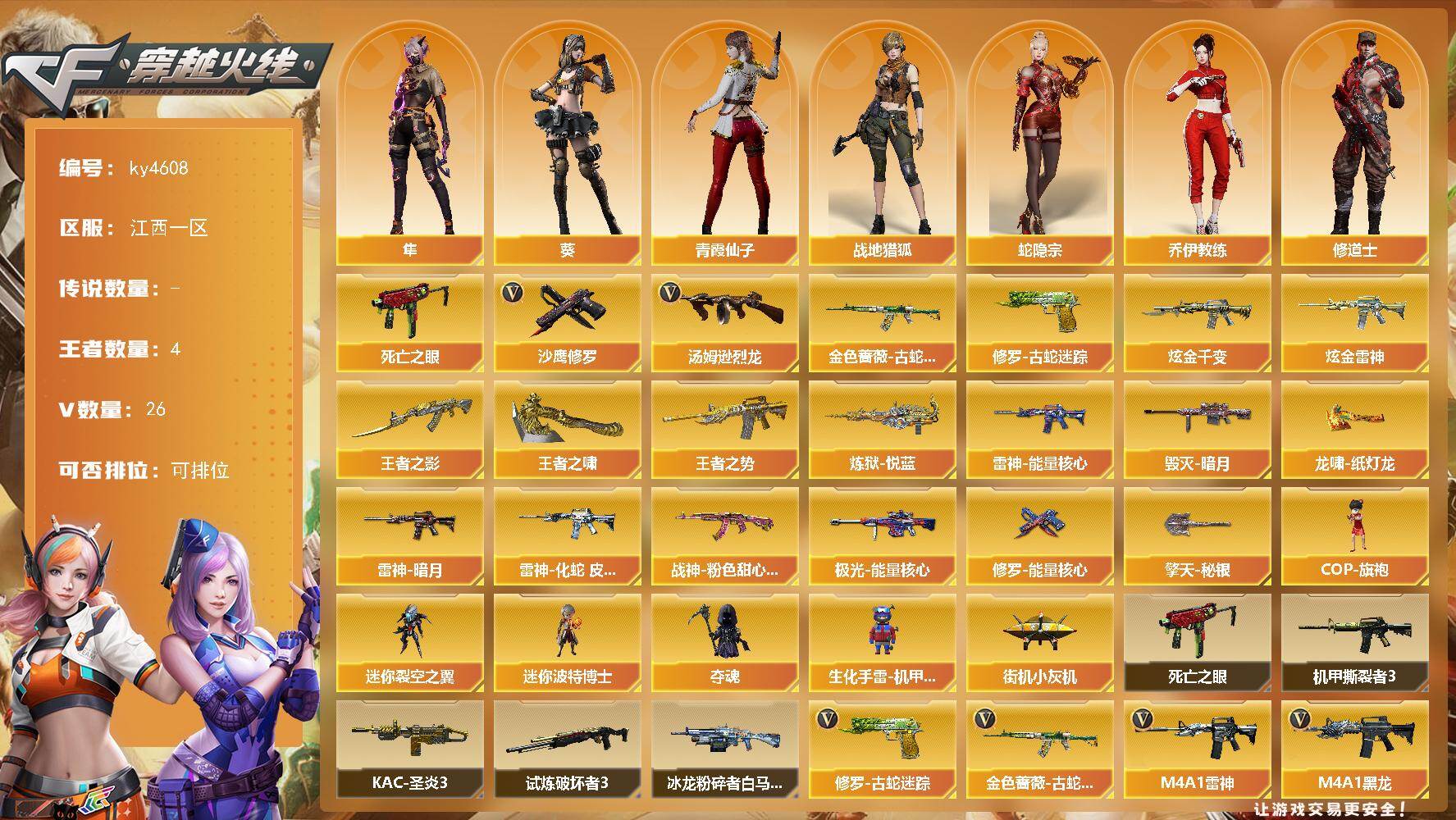 [16101292]江西一区-26V-4王者-2炫金 【热门武器】:金色蔷薇-古蛇迷踪,修罗-古蛇迷踪,死亡之眼,汤姆逊-烈龙,沙鹰-修罗 【王者炫金武器】:王者之势,王者之影,炼狱-悦蓝,王者之啸,炫金千变,炫金雷神 【皮肤】:雷神-暗月,雷神-能量核心,雷神-化蛇 皮肤,毁灭-暗月,战神-粉色甜心皮肤,极光-能量核心,修罗-能量核心,龙啸-纸灯龙皮肤,擎天-秘银 【角色】:葵,隼,战地猎狐,蛇隐宗,乔伊教练,修道士,芳心审判者,娟娟,龙儿,潘多拉-X,潘多拉-甜心教官,青霞仙子,蛇姬,雪莉杨,影武者-X 【人偶武器】:街机小灰机,COP-旗袍,迷你裂空之翼,迷你波特博士,夺魂,生化手雷-机甲核心*2 【暴走生化】:死亡之眼 【挑战大师】:冰龙粉碎者-白马银枪,机甲撕裂者III,试炼破坏者III,KAC-圣炎切割者III 【英雄级武器】:M4A1-千变,AK47-火麒麟,M4A1-黑龙,M4A1-雷神,AK12-天启,AK47-机械迷城,无影-神兵利器,金色蔷薇-古蛇迷踪,AK47-B-战神,黑骑士-海王,AWM-天龙,Barrett-毁灭,Barrett-极光*2,汤姆逊-烈龙,烈龙-云海游龙,沙鹰-修罗,沙鹰-天神,修罗-古蛇迷踪,屠龙*2,龙啸,擎天,麒麟刺,高爆手雷-古蛇迷踪,烟雾弹-古蛇迷踪,M4A1-赤狱骑士 【道具】:云山科技背包,亚洲杯纪念炫彩背包,古蛇迷踪炫彩背包,战舰背包,炫彩背包,背包-洛丽塔,女皇终结者-魔龙之吻,救世主-黑桃战神,黄金生化钩,绿色巨人,灵魂忍者,迷雾幽灵,夺命之镰,防化服*2,流光-再燃火线,枪王排位29赛季金色流光,古蛇迷踪打击特效,蛇隐宗表情,电玩兔兔表情,云海游龙表情,C4-红龙,防弹头盔*3,防弹衣*3,C4工具钳*3,手雷包*3 【特殊枪械】:1烈龙